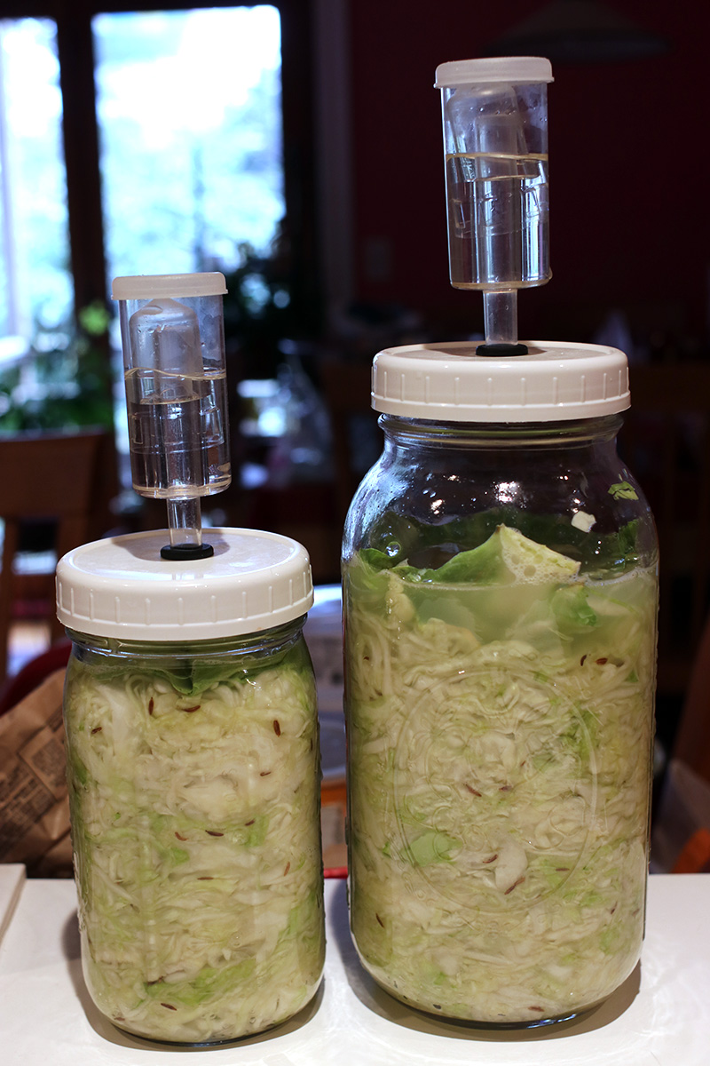 after mixing the sauerkraut and letting it reduce for an hour, it was time for jarring. i filled the smaller quart size jar first, mashing the sauerkraut with every layer so i could fit as much as possible and to squeeze out the cabbage juices. i filled it nearly to the top before stopping. the half gallon jar was easier to work with, i managed to fill that up to 3/5th before i ran out of cabbage. i then used leftover cabbage leaves as a cover (to prevent shredded sauerkraut from floating to the surface) before putting on the airlock lids. with that i was done, just have to wait 10+ days or so for the sauerkraut to properly ferment. the quart jar is so full i'm afraid the liquids are going to come out of the airlock, not too much i can do about that except to shake it every day to allow the excess gases to escape. the half gallon jar there's no danger of overflow, there's plenty of head space.