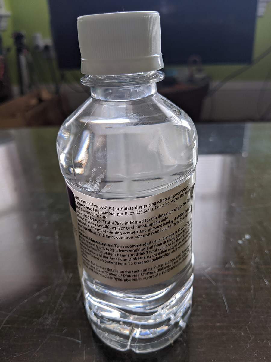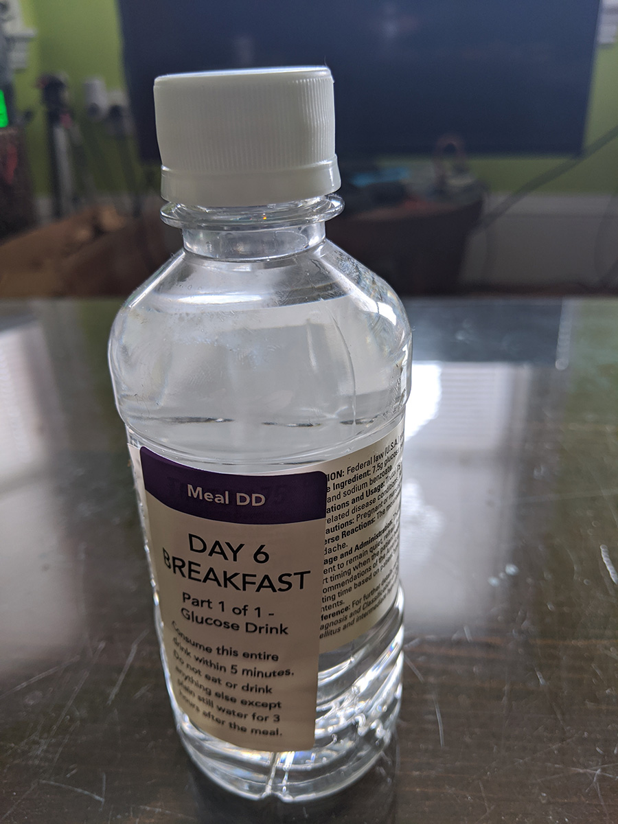 today was the last set meal of the predict 2 study: downing what they've been calling "the glucose drink," a super high sugar elixir designed to spike my blood sugar level so they could see how my body reacts. i was curious to see just how sweet it was. would it be like drinking syrup water? i fished the bottle of the fridge and drank the whole thing in a quick gulp. it tasted a lot like soda, just slightly sweeter than usual, with a citrus taste and slight carbonation. it actually wasn't too bad.