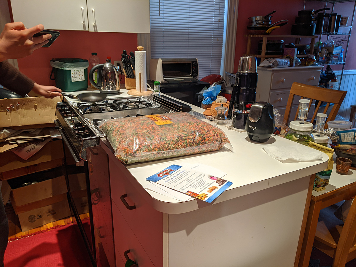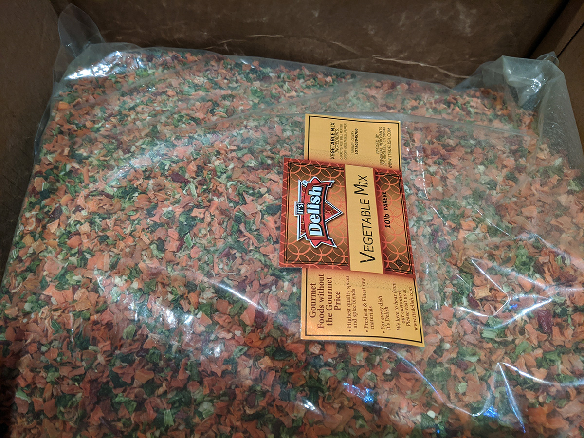 a big box arrived on the doorstep, had to be kevin's. not only was it big but heavy too, and i figured maybe he ordered more bags of rice in addition to the 40 lbs. he already has. but turns out it was 20 lbs. worth of dehydrated vegetables. when told me "dried vegetables" i was thinking something more in the lines of pickled vegetables, not actually dehydrated. it reminded me of fish flakes, or animal feed, or something you'd line the bottom of a gerbil cage.