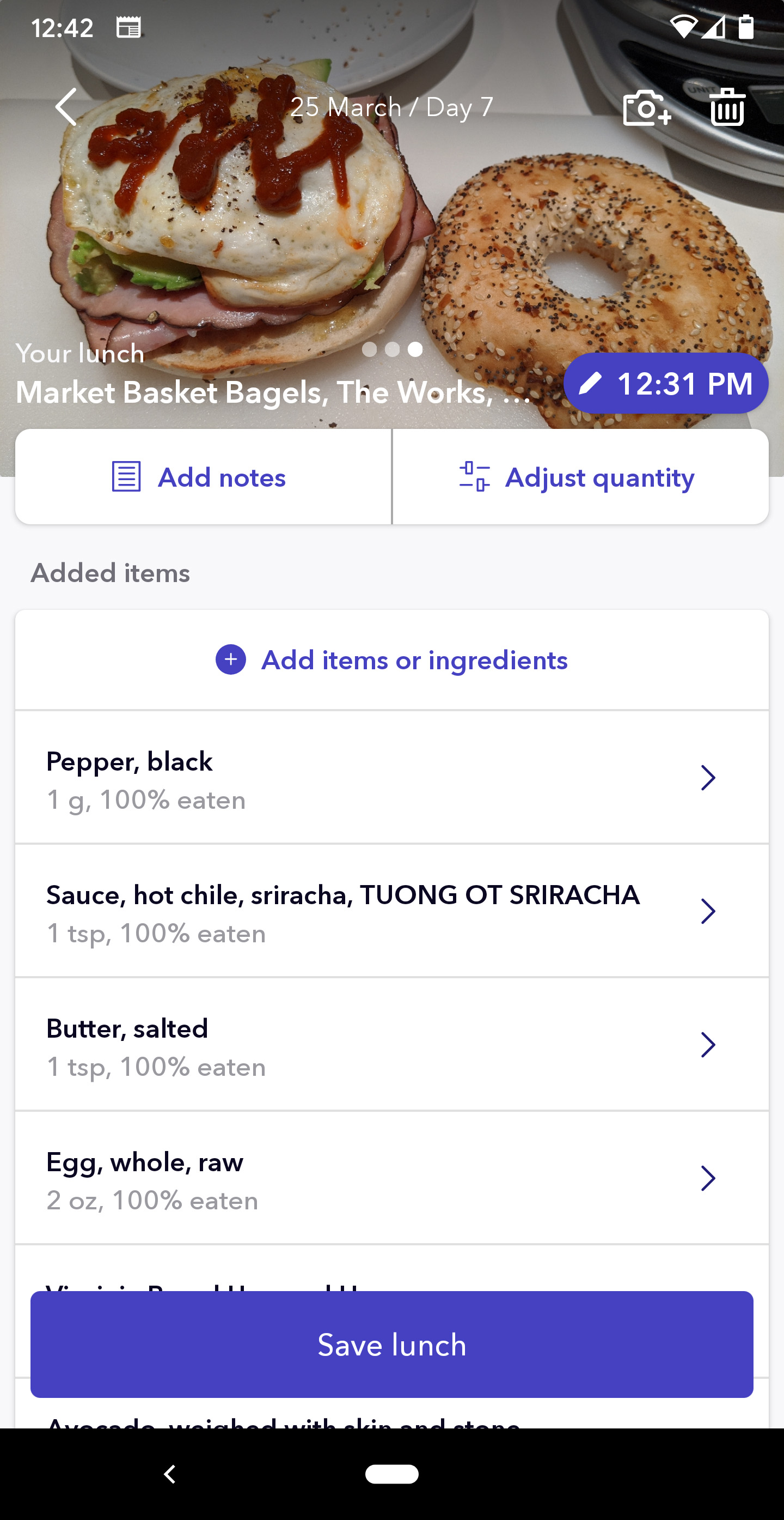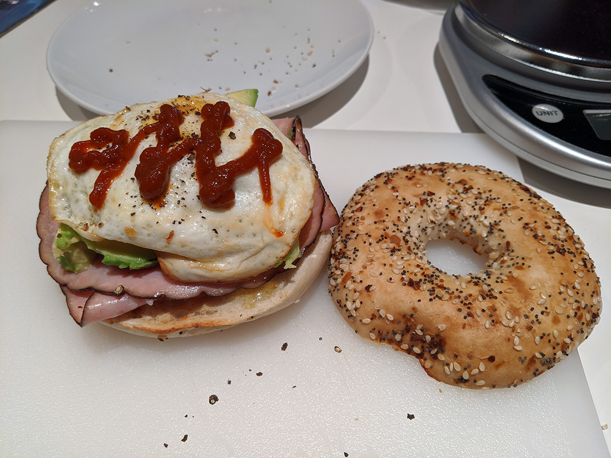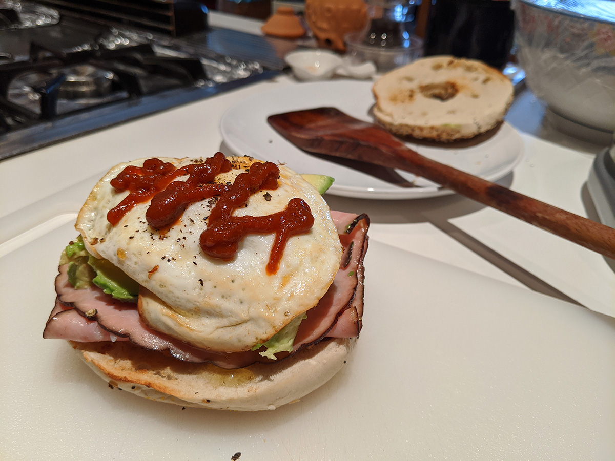instead of an english muffin i upgraded to an everything bagel sandwich for lunch. same ingredients as last time - fried egg, virginia ham - but instead of pesto, i used half an avocado, then drizzled sriracha sauce over everything. it was a decadent sandwich, so good it felt like store-bought, one of the best homemade things i've eaten since the coronavirus quarantine.