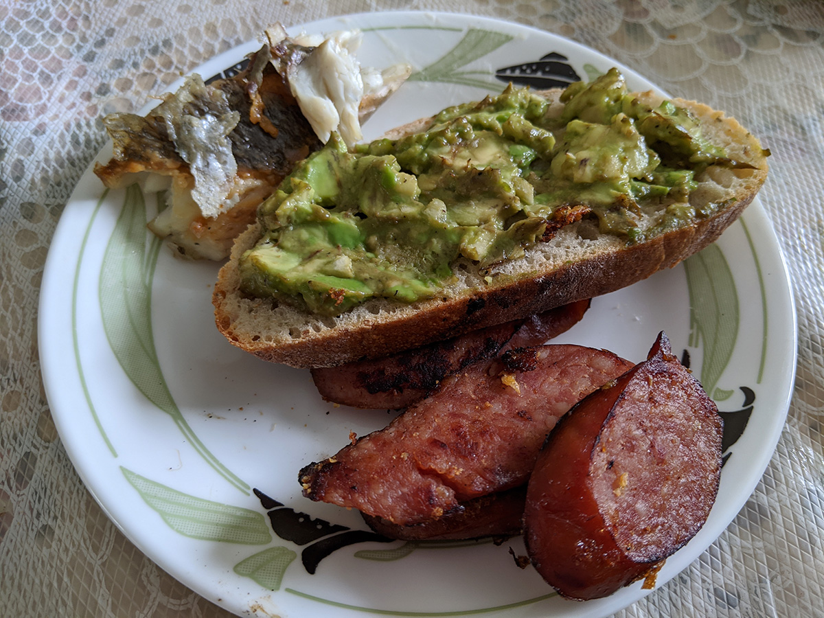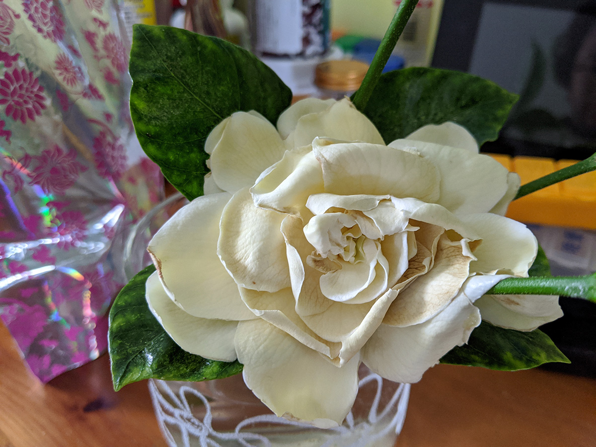 i had some avocado toast for lunch, along with a few pieces of leftover kielbasa and a chunk of sea bass. i don't think i ever had avocado toast before, it's not bad, especially the way my mother makes it with additional garlic and salt and olive oil mixed with the avocado. i finally saw the gardenia flower, now a bit wilted, but still fragrant if you hold your nose to it. i was in the basement grow room checking on the plants and noticed 2 very active ladybugs running around the surface of the gardenia and jasmine leaves.