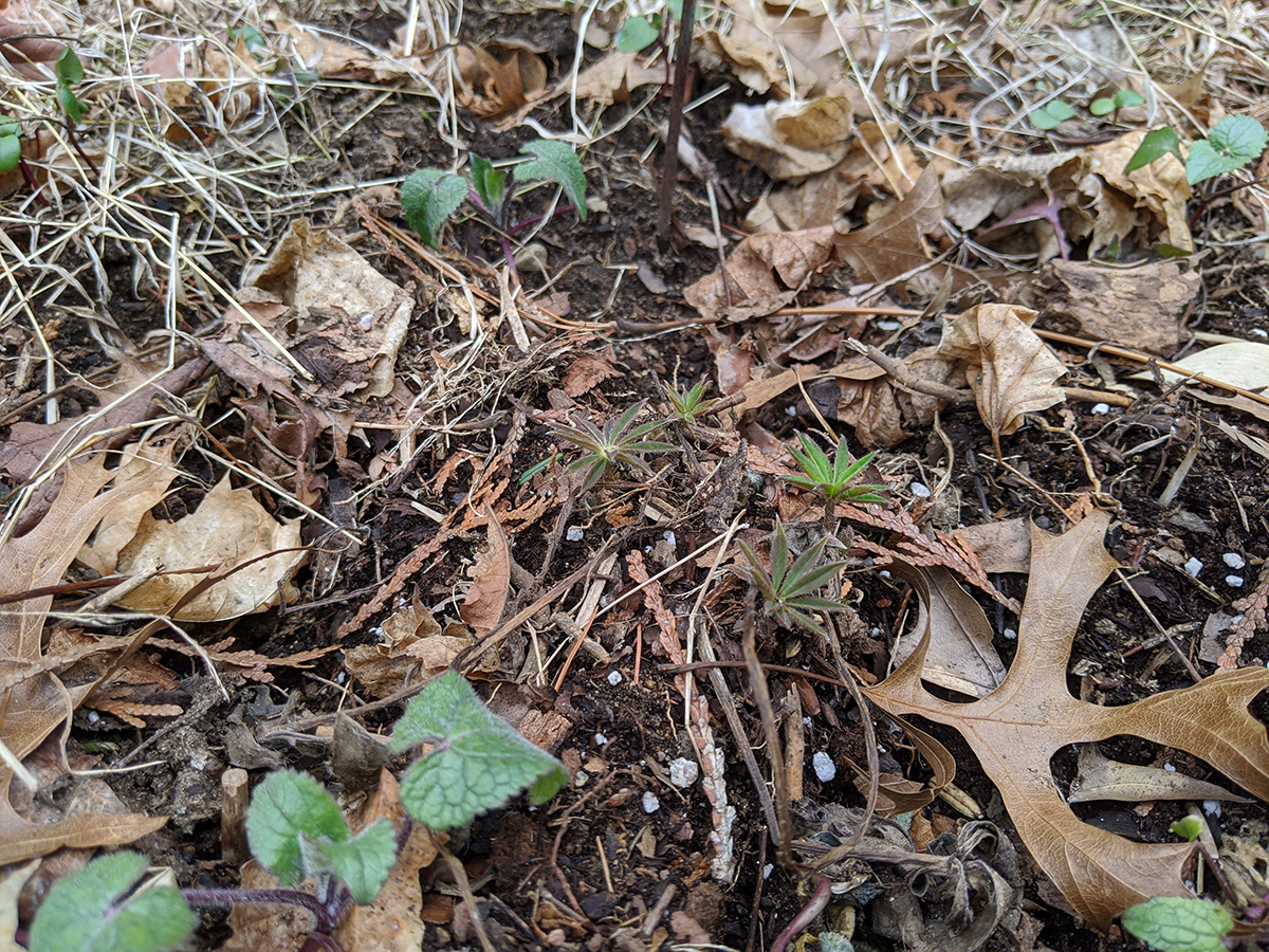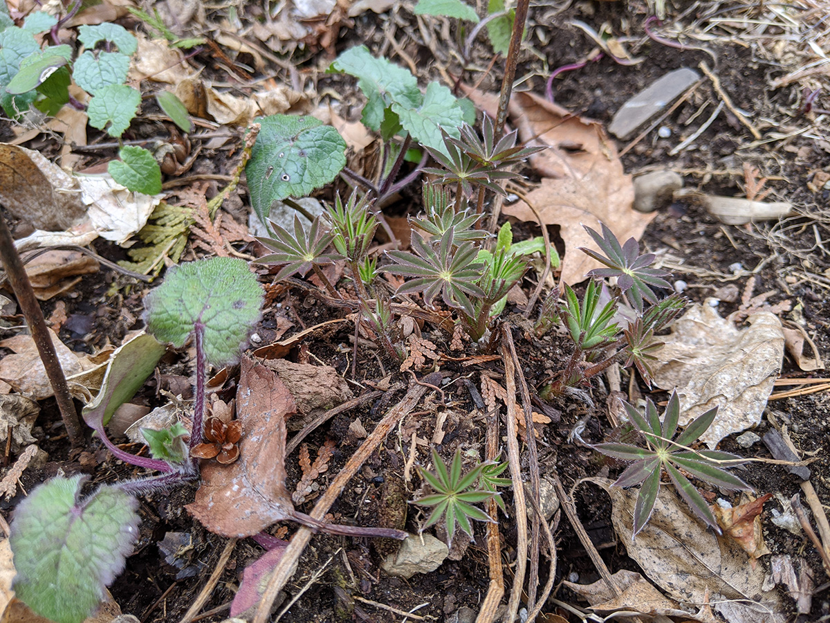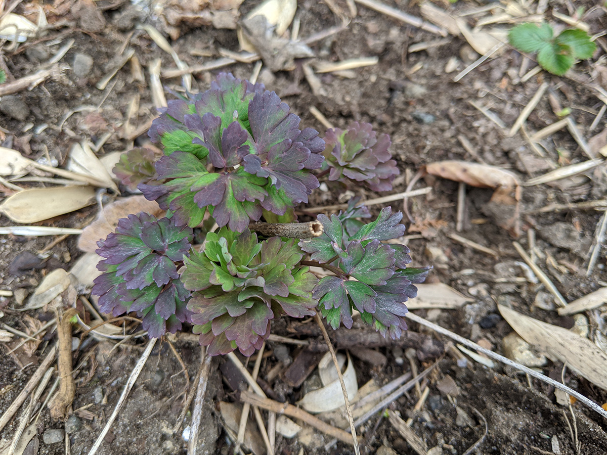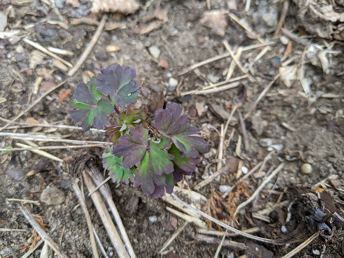 in the backyard, the following plants have re-emerged: columbines, lupines, money plants, monkshood, daffodils, scillas, garlics, and peonies. all the columbines and lupines i transplanted in the fall seemed to be survived the rather mild winter.