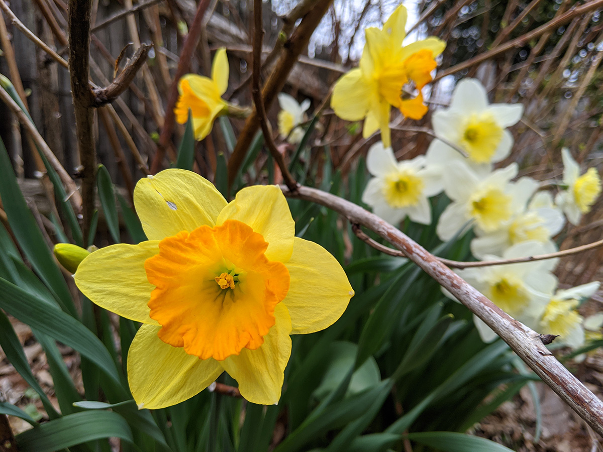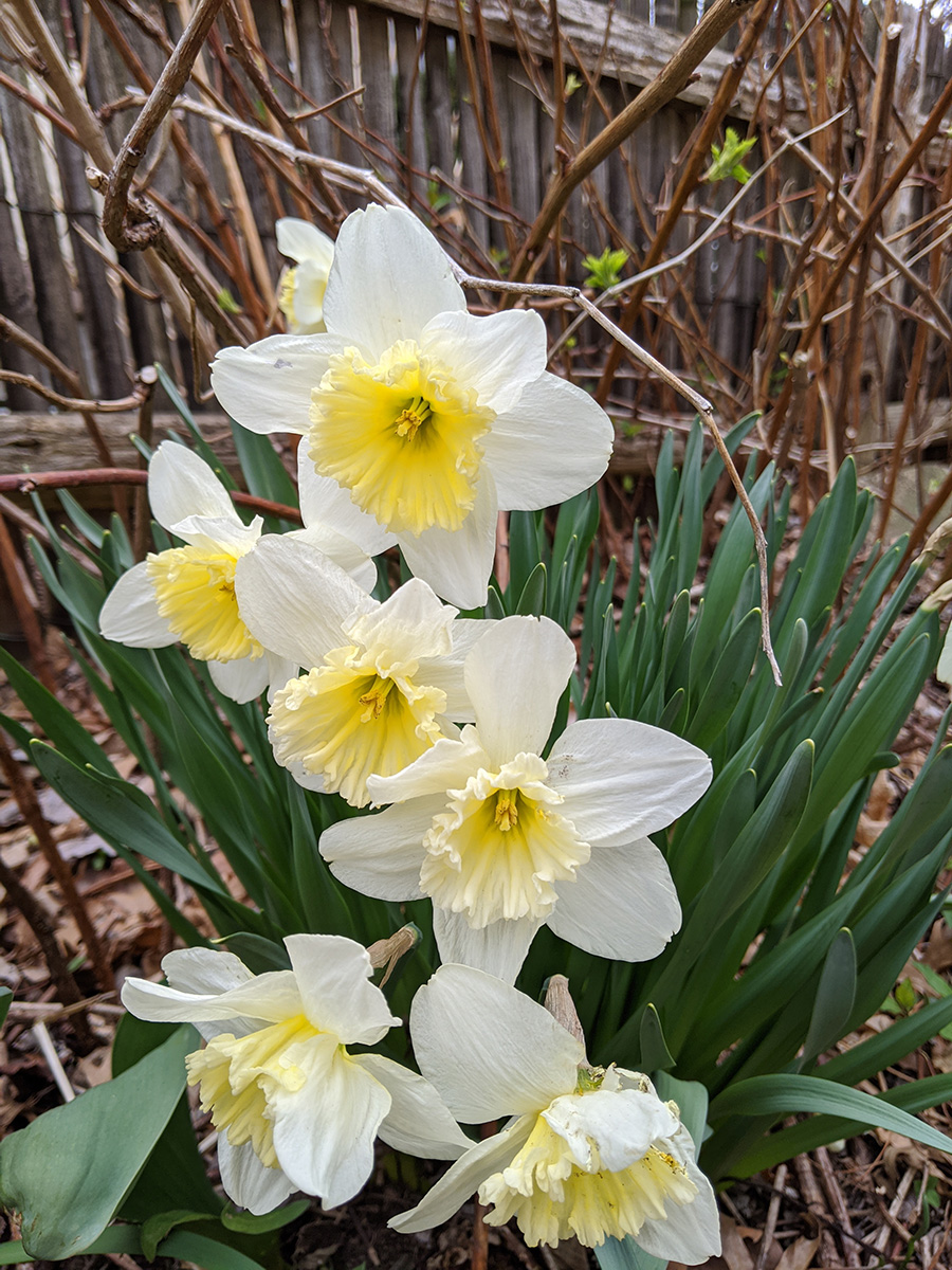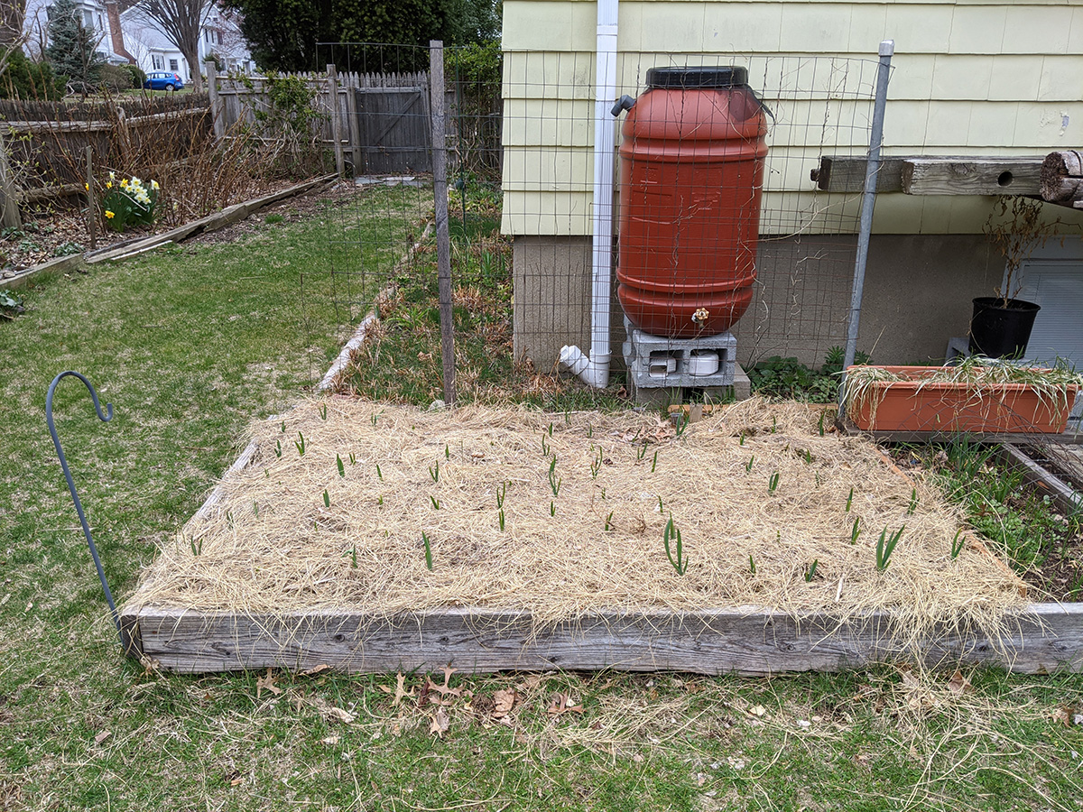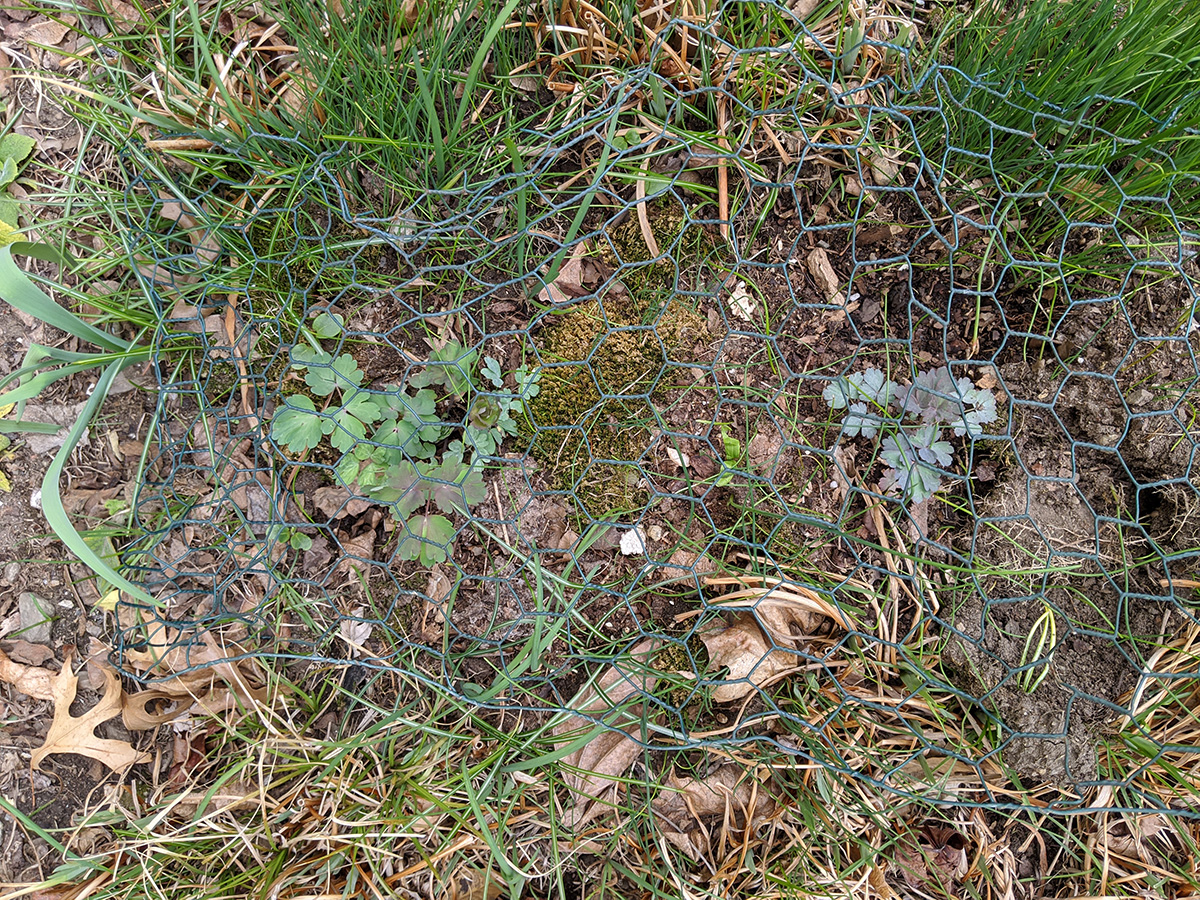 in the backyard, the following plants have re-emerged: columbines, lupines, money plants, monkshood, daffodils, scillas, garlics, and peonies. all the columbines and lupines i transplanted in the fall seemed to be survived the rather mild winter.