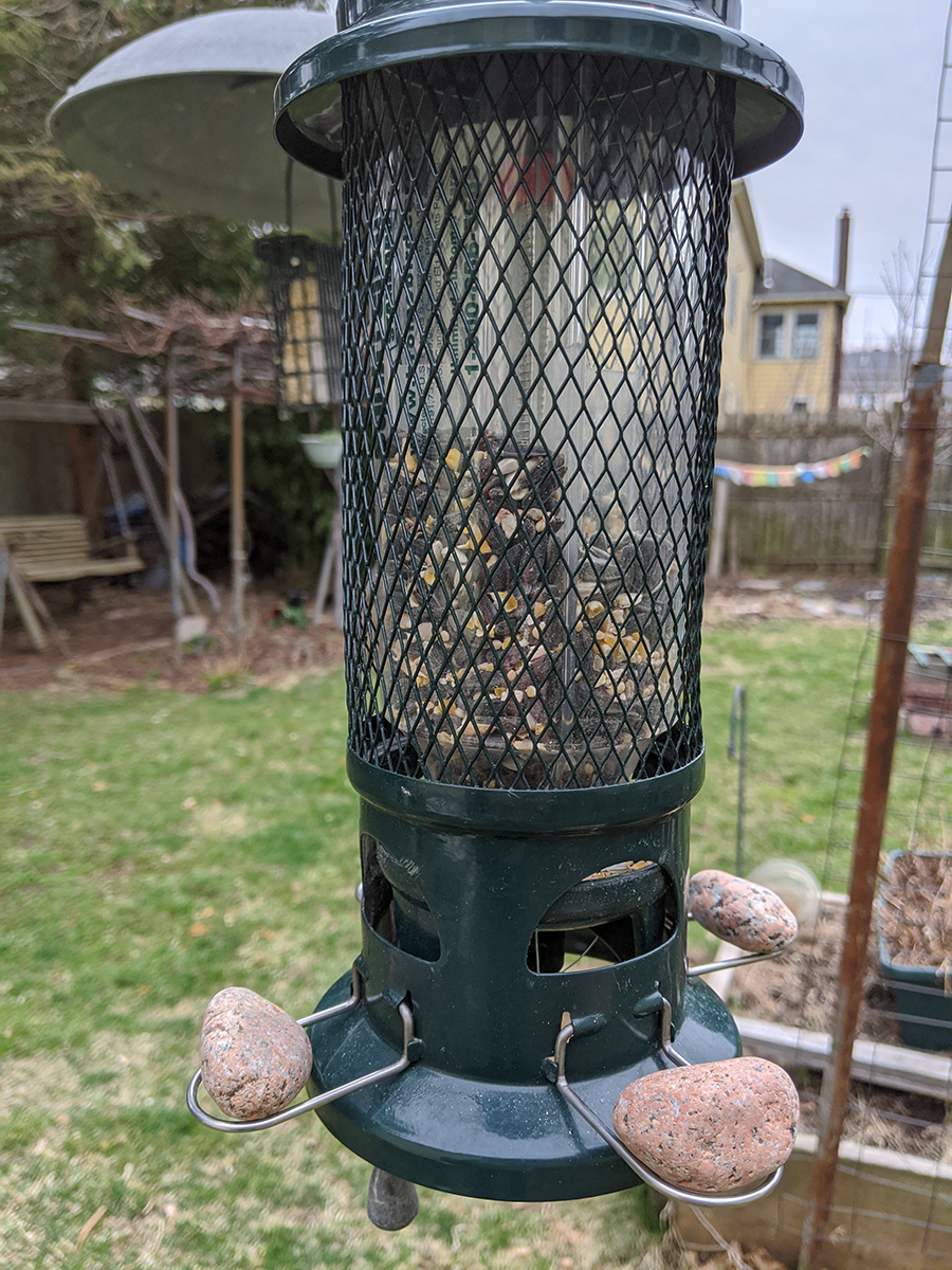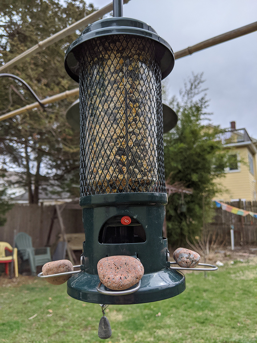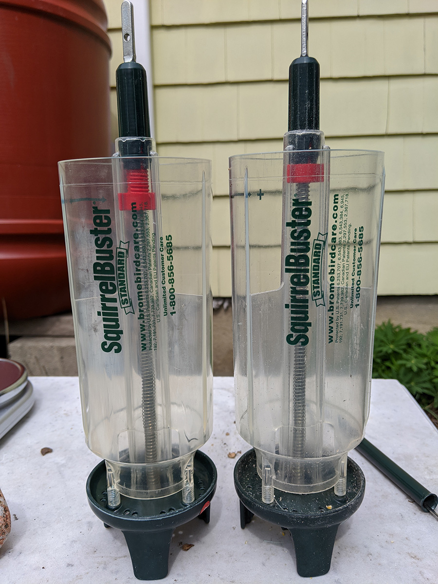 first thing i did when i arrived was to swap out the inner tube of the squirrel buster standard with the new replacement tube that finally arrived a few days ago. the replacement tube actually had some damage, when they screwed on the base they used too much force and cracked the plastic housing. not a big deal and i really needed just need the new spring anyway, my old tube is still good to use. after adjusting the tension, i've found the new tube behaves similarly to the old tube, not much has changed. when set at the most sensitive setting, i still need to add 1 oz. of fishing weight to make it sensitive enough to trigger a 3.5 oz. bird hanging from the perch. but adding the fishing weight does make the shroud drop slightly, so the feeding window is a bit smaller. nothing much i can do about it now, even if a new tube the situation isn't completely fixed, i just have to learn to live with it, and be okay with the fact that a certain amount of seeds will still be eaten by grackles smart enough to stick their feet in the feeding out so the shroud doesn't fall completely down.