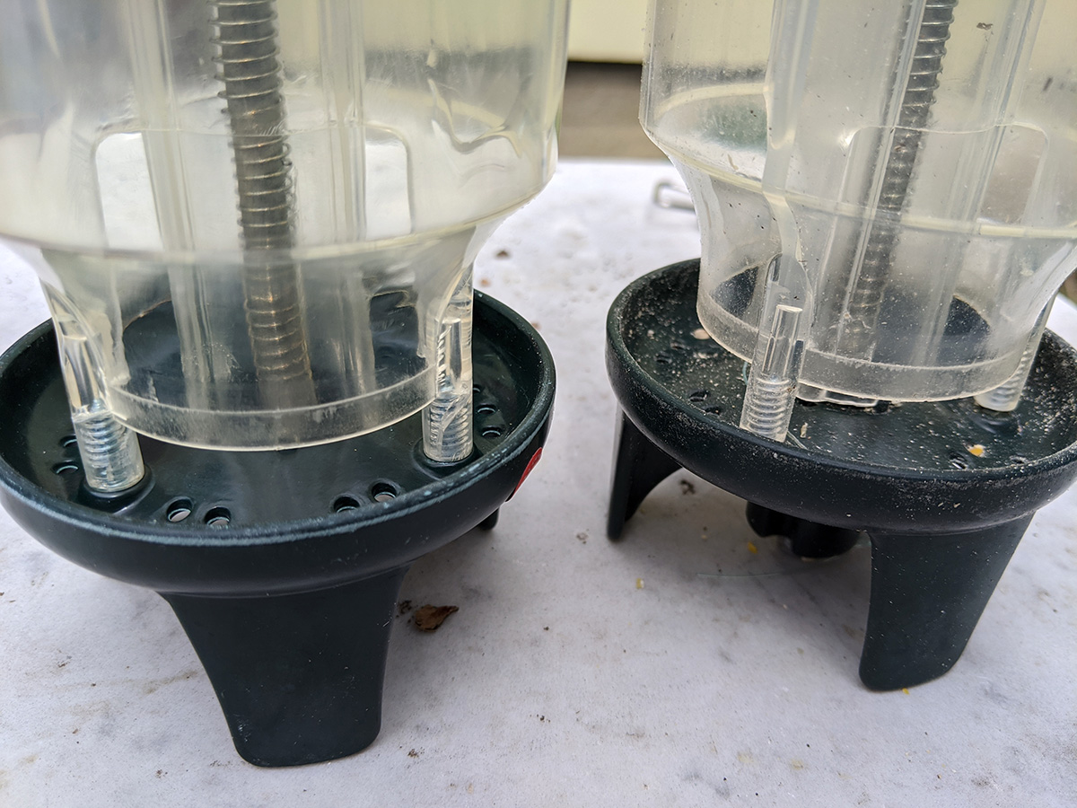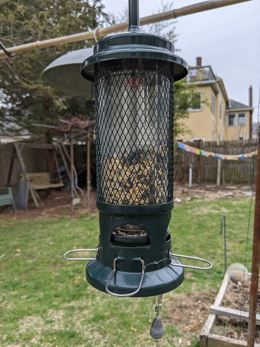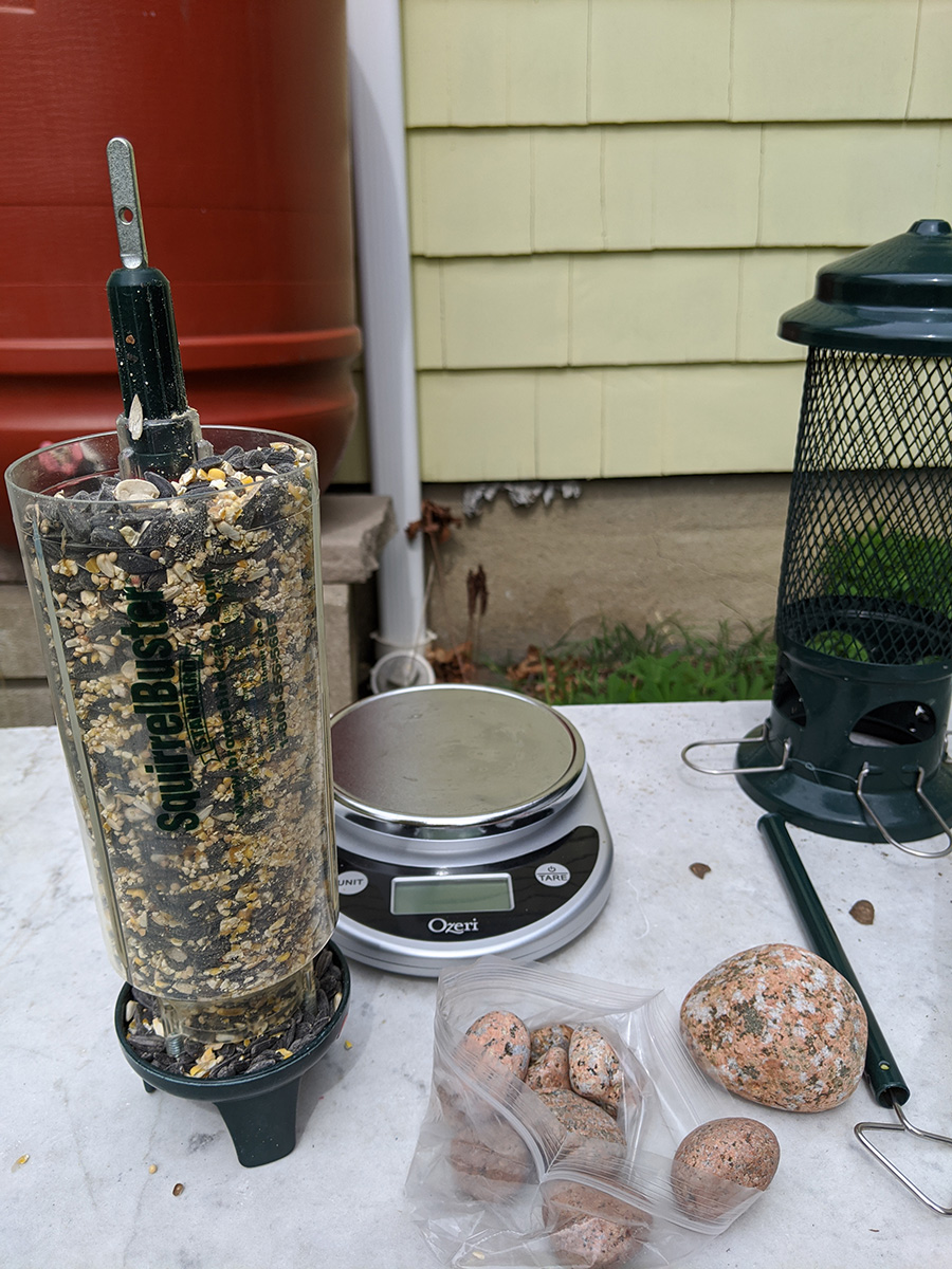 first thing i did when i arrived was to swap out the inner tube of the squirrel buster standard with the new replacement tube that finally arrived a few days ago. the replacement tube actually had some damage, when they screwed on the base they used too much force and cracked the plastic housing. not a big deal and i really needed just need the new spring anyway, my old tube is still good to use. after adjusting the tension, i've found the new tube behaves similarly to the old tube, not much has changed. when set at the most sensitive setting, i still need to add 1 oz. of fishing weight to make it sensitive enough to trigger a 3.5 oz. bird hanging from the perch. but adding the fishing weight does make the shroud drop slightly, so the feeding window is a bit smaller. nothing much i can do about it now, even if a new tube the situation isn't completely fixed, i just have to learn to live with it, and be okay with the fact that a certain amount of seeds will still be eaten by grackles smart enough to stick their feet in the feeding out so the shroud doesn't fall completely down.