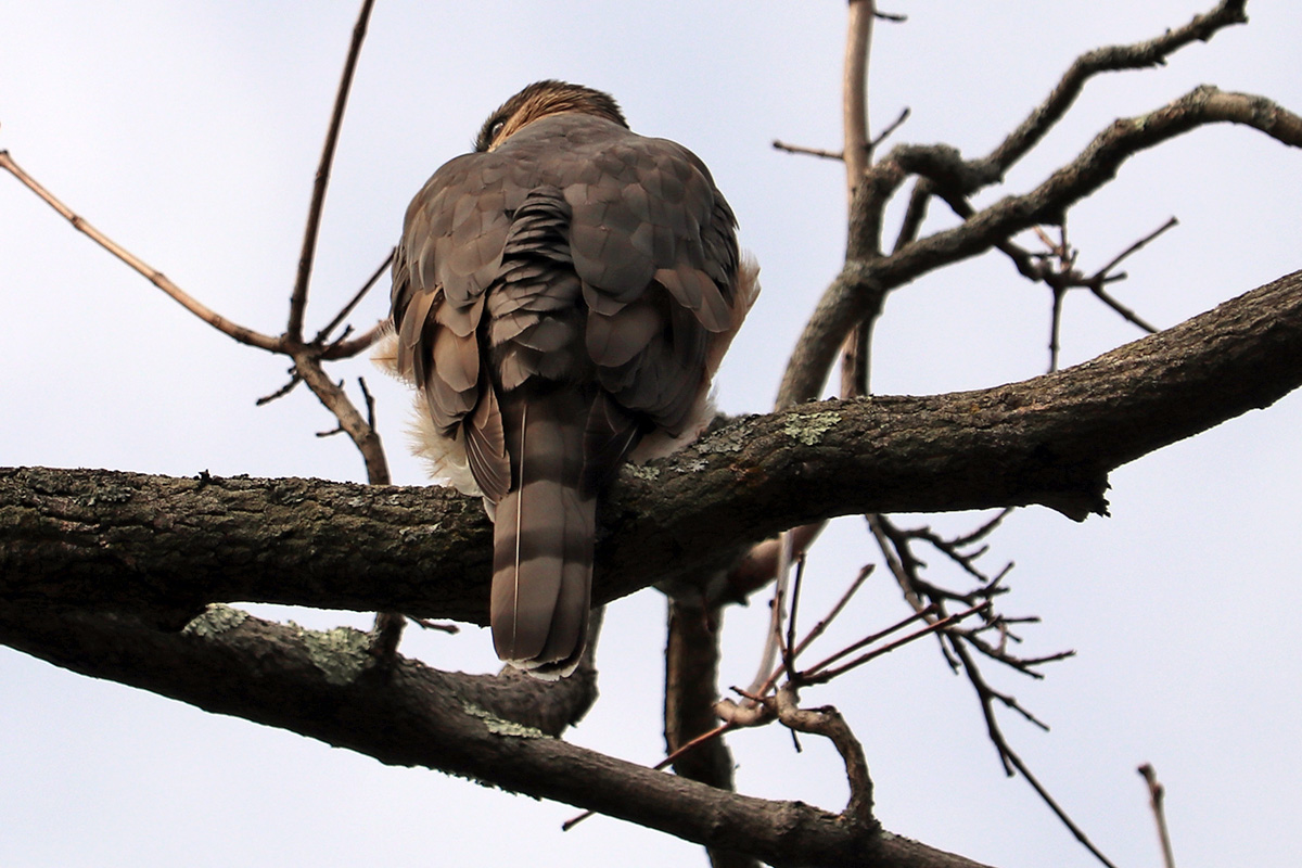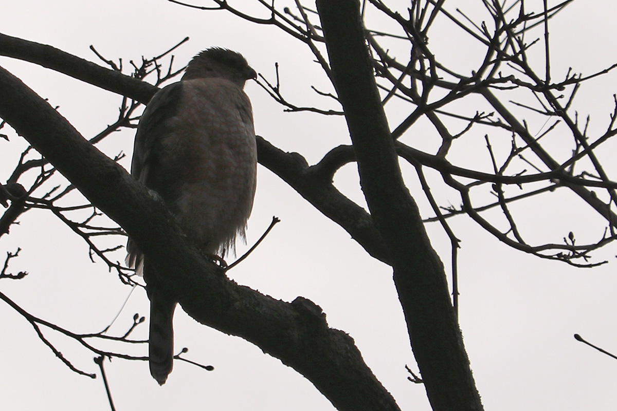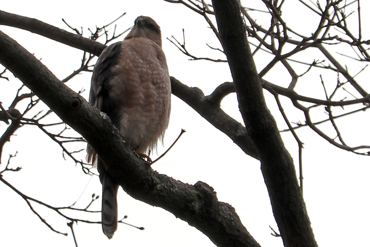 besides various flowering trees i also spotted a hawk sitting up in a tall tree. i figured it was a common red-tailed judging from the size. later when i looked at the photos, i thought maybe a juvenile red-tailed from the banded tail. but after i did some comparing and contrasting, i now think it was a cooper's hawk. the size threw me off because it looked a lot bigger than it should be, but maybe because it was puffed up. the long and banded tail, the feather patterns, all point to cooper's hawk. it did this thing where it managed to turn it's head nearly 180° to look at me, like an owl.
