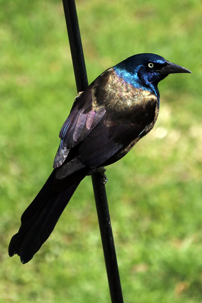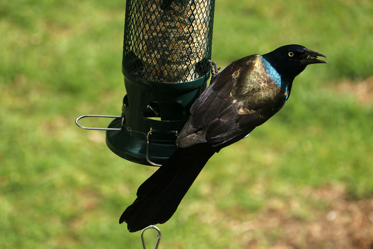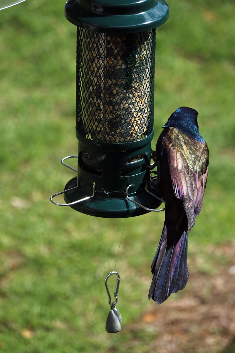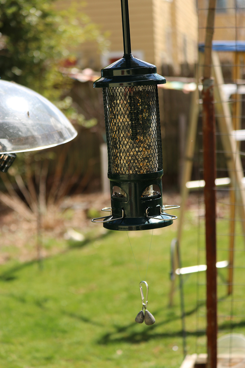 i adjusted the squirrel buster feeder. in 2 days i observed a swarm of grackles empty the feeder of seeds. when grackles perch on the feeder with one claw in the seed window, it distributes their weight, preventing it from dropping. if it was just one or two i can tolerate it, but they usually arrive in a flock, and can quickly empty the feeder with their voracious appetite. i also noticed the mini carabiner clip holding the fishing weights was caught in one of the bottom legs of the central tube, further preventing it from springing the outer shroud. i noticed since the fish weights weren't centrally hanging that the shroud came down differently depending on where the bird landed; so i tried a new strand of fishing cable so the weights (about 3oz.) would hang straight from the center. despite all these adjustments, i still saw grackles successfully eat from the feeder. i made one last adjustment, went back to a more sensitive spring setting; then meant the shroud would always be partially collapsed, with a smaller feeding window. hopefully this makes it harder for the grackles. if that still doesn't work, i will remove some of the perches.