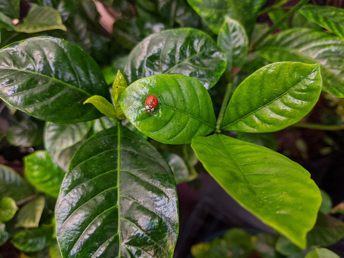 before dinner i paid a quick visit to the grow room. my father had been monitoring my seedlings, uncovering the ones that've germinated, which up to this point have all been tomatoes; i still haven't seen any signs of eggplants or hot peppers. the tomato germination rate is pretty good, although i haven't checked whether it was the ones i brought fresh this season or some old tomato seeds, but the ones that've sprouted have all germinated, i'll need to do some thinning out at some point. i have 2 concerns: will fungus gnats infest the soil, thereby harming the seedlings; and how far exactly do i need to suspend the grow light? i also spotted the resident ladybug hanging out on the gardenia. how long do they live anyway? because this ladybug has been around for weeks now. is it the same one, or a different generation? but i haven't seen any signs of alligator-shaped larvae, so i don't think they're reproducing. it's still a mystery how they got inside. i think a few must've hitchhiked a ride on one of the plants during the few times we've set the plants outside to get some fresh air and real sun.