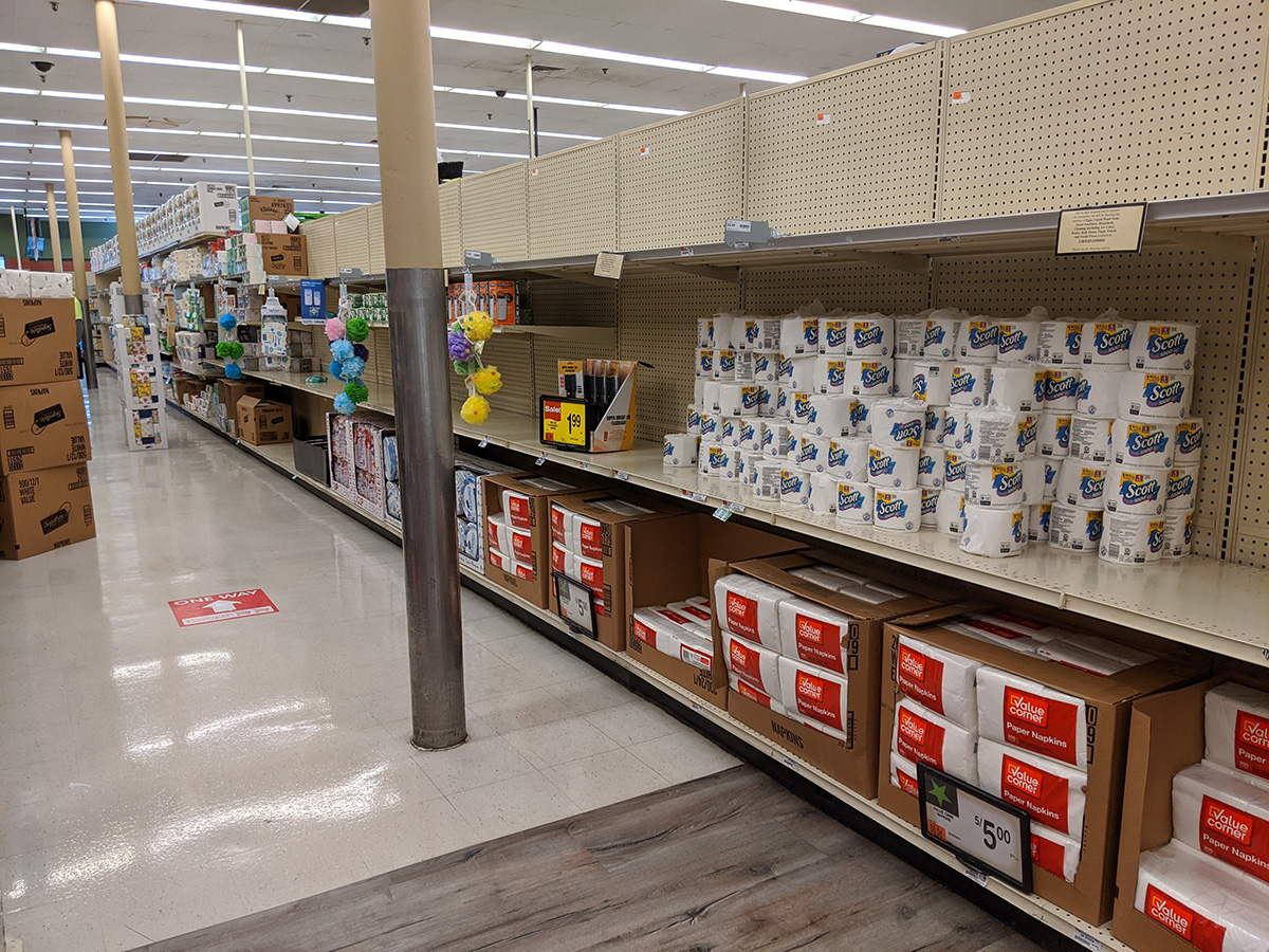 i keep on checking the toilet paper because we're down to our penultimate roll. kevin seems to think there's an inexhaustible supply of toilet paper and paper towels in the house, i don't think he's ever bought either of those household staples before, even though he seems to use a lot of it. if i lived alone, i could make a single roll last 3-4 weeks. but with kevin living here, a single roll lasts about 10 days. not that he uses too much, but there are always drips of urine on the seat or the rim or on the floor i'm constantly having to clean up. it makes me anxious running this close to empty, knowing that i may not be able to get anymore. thankfully, i prefer the market basket store brand toilet paper, so hopefully they'd have that in stock when all the name brands are gone. they carry two kind, regular and premium, i only use the premium. of course this all stipulates on me going down to market basket, something i've yet have the courage to do. worse case scenario my mother said they have plenty at their house, but i don't like whatever brand they have, i prefer my own MB premium if i can find some.