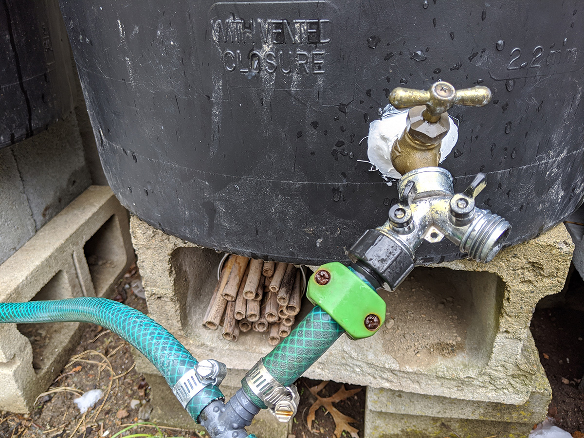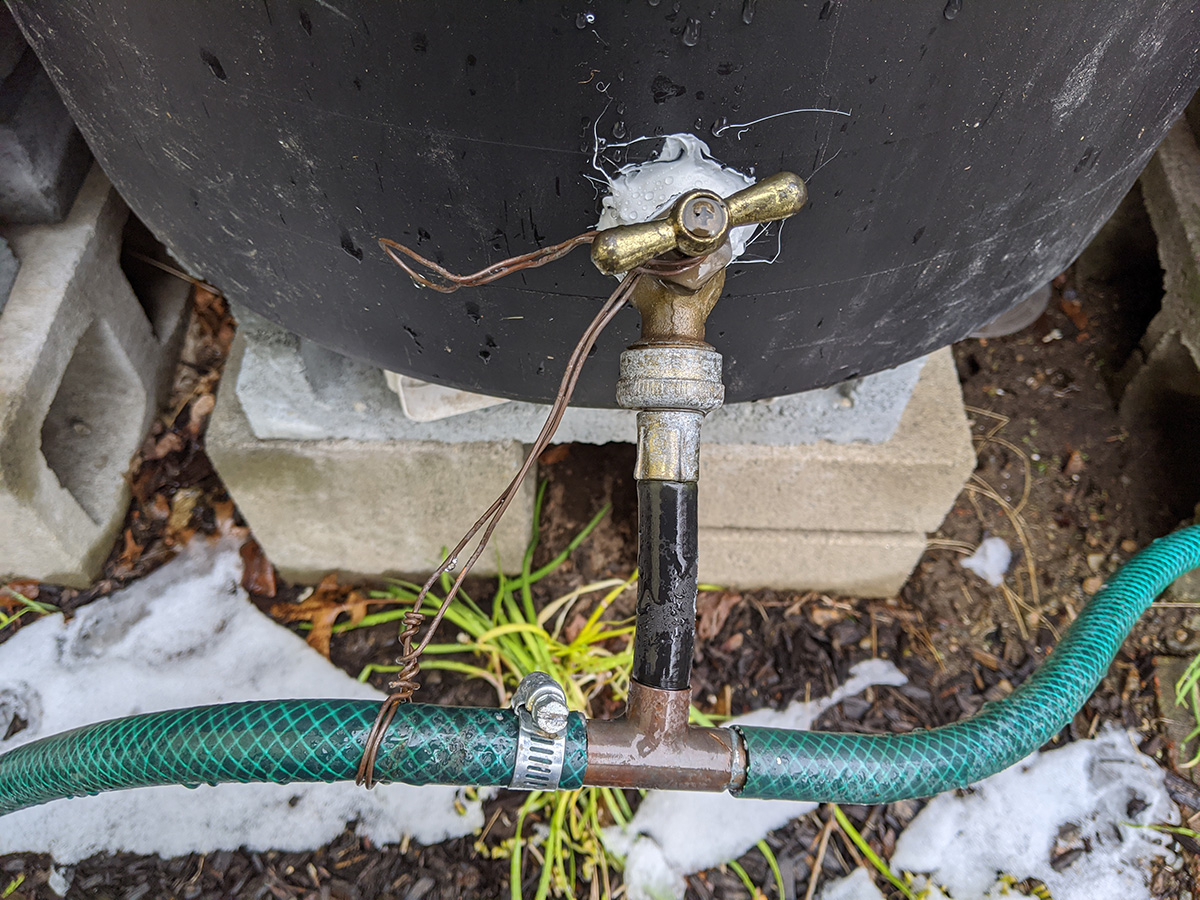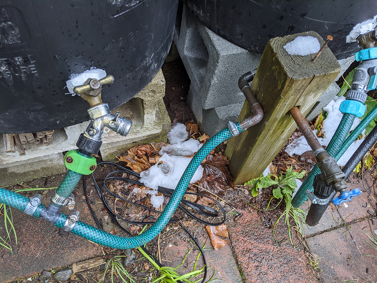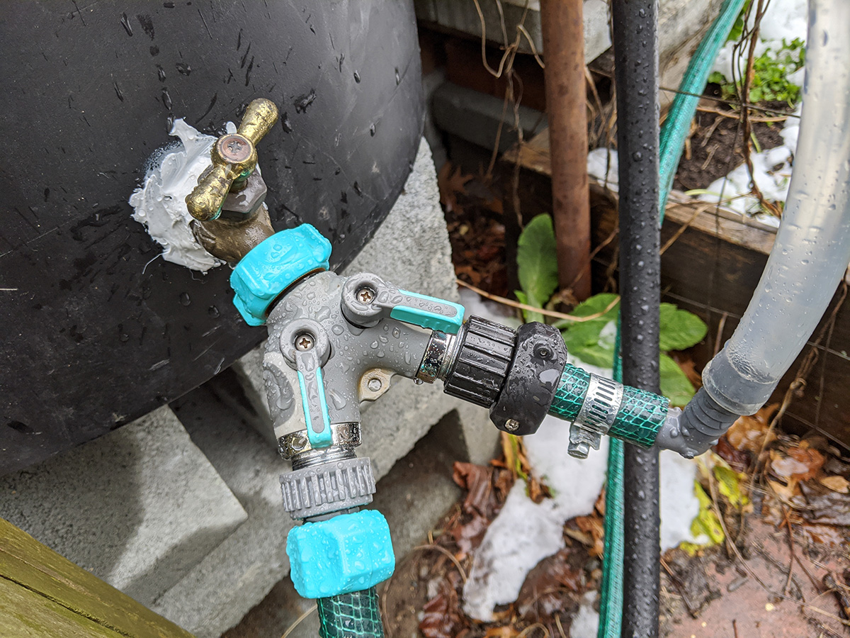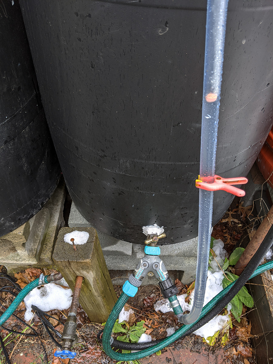 not sure how much it snowed and rained, but it was enough to fill our 7 rain barrels. even after it stopped raining by the afternoon, snowmelt continued to trickle from the gutter downspouts. the rain allowed us to check if any of the rain barrels or the connections were leaking. for the most part everything seemed solid. even the loose caulking my father did managed to hold, most likely because we sealed the inside as well when we first installed the spigots. only one of the connectors seemed like it was leaking, the one that goes to the water level gauge. we'll need to get some replacement splitter valves and connectors.
