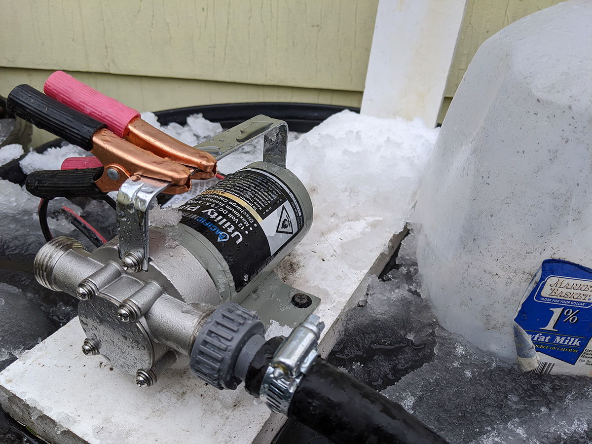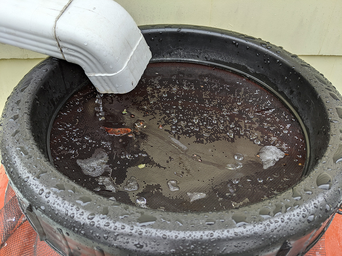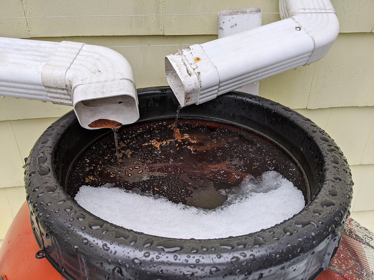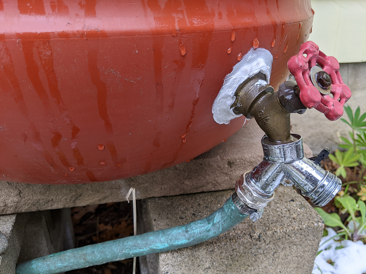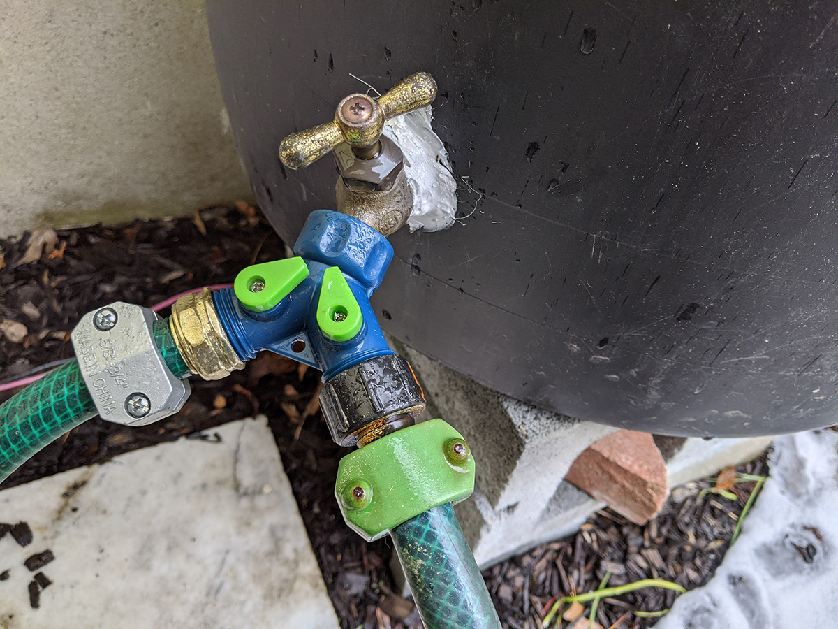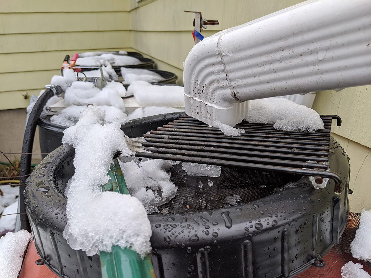 not sure how much it snowed and rained, but it was enough to fill our 7 rain barrels. even after it stopped raining by the afternoon, snowmelt continued to trickle from the gutter downspouts. the rain allowed us to check if any of the rain barrels or the connections were leaking. for the most part everything seemed solid. even the loose caulking my father did managed to hold, most likely because we sealed the inside as well when we first installed the spigots. only one of the connectors seemed like it was leaking, the one that goes to the water level gauge. we'll need to get some replacement splitter valves and connectors.