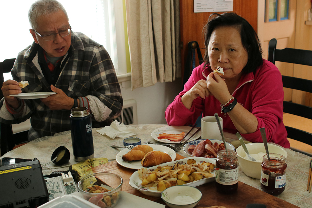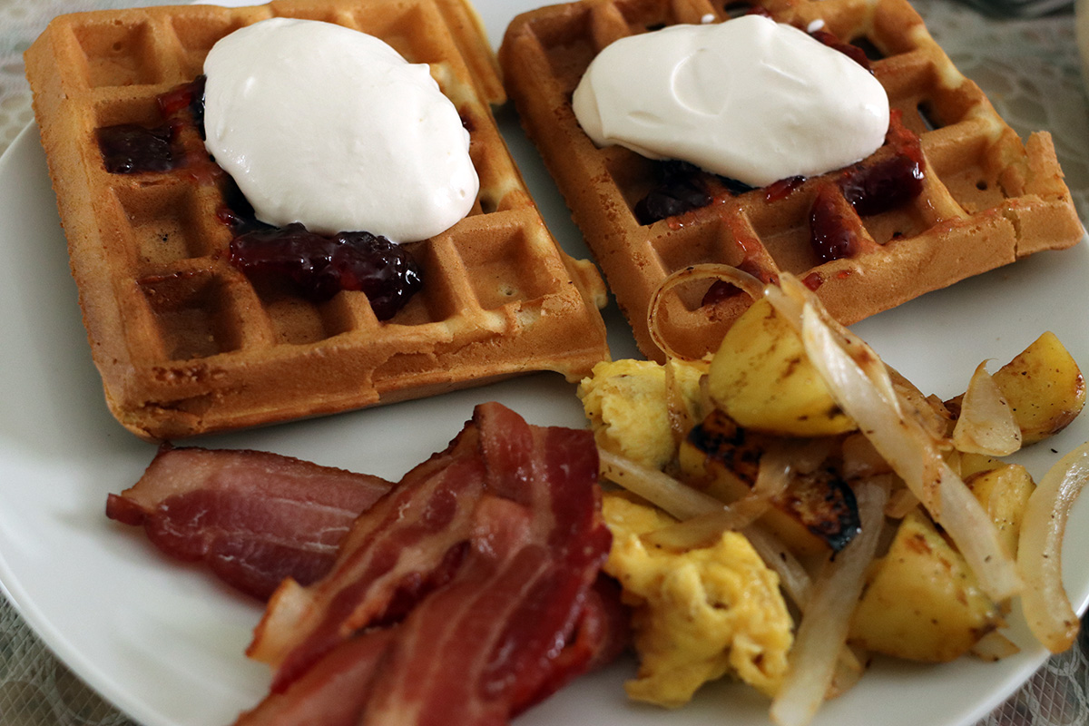 while i was cleaning the snow off of the roof, i could smell something delicious venting from the kitchen exhaust. turns out it was a combination of belgian waffles and bacon. there was no strawberry compote only jam, but the fresh whip cream made up for the deficiency. i couldn't taste the bacon for some reason, and asked if it was something fancy of fancy healthy bacon, like turkey bacon, but it was legit hickory smoked thick cut bacon. i think i just accidentally ate a few that were on the fatty side, and weren't very salty. later i had some leftover bacons and they tasted better.