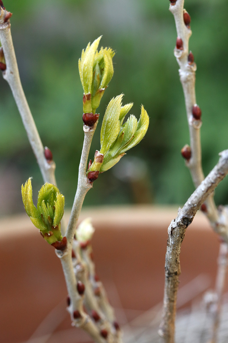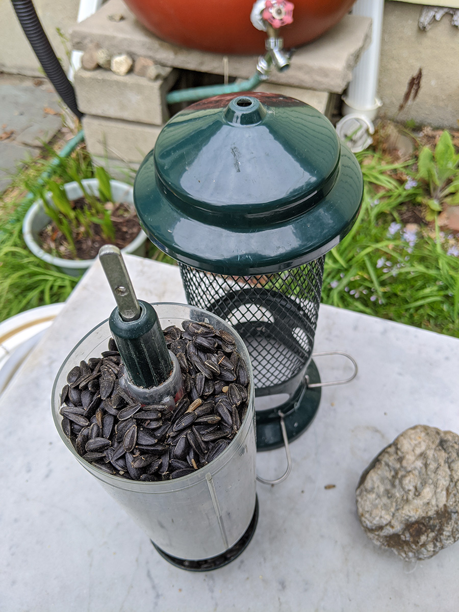 it wasn't warm enough to bring out the houseplants again, but warm enough to work comfortably in the backyard. i refilled the bird feeder with black oil sunflower seeds: i heard grackles don't like them but they're a favorite of many smaller birds. i reduced the pile of long maple branches sitting on the grass so they'd all fit in a single garden refuse bin. since it was raining tomorrow, today would be a great day to mow the lawn. when my father pushed the mower out of the grass, he discovered it was out of gas. i planted some metasequoia seeds i picked up from mt.auburn cemetery last fall and kept in my refrigerator ever since. my godmother stopped by briefly to deliver some things for my mother. they chatted outside in masks before my mother came back inside the house.
