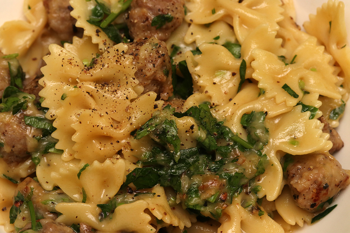 | mix egg, parsley, and cheese (set aside). cook pasta. squeeze sausages into tiny meatballs and roll in ground pepper then cook in oil. drain pasta, saving some water (1/2 cup). mix pasta with sausages and egg-parsley-cheese mixture. add pasta water if sauce too dry. | |