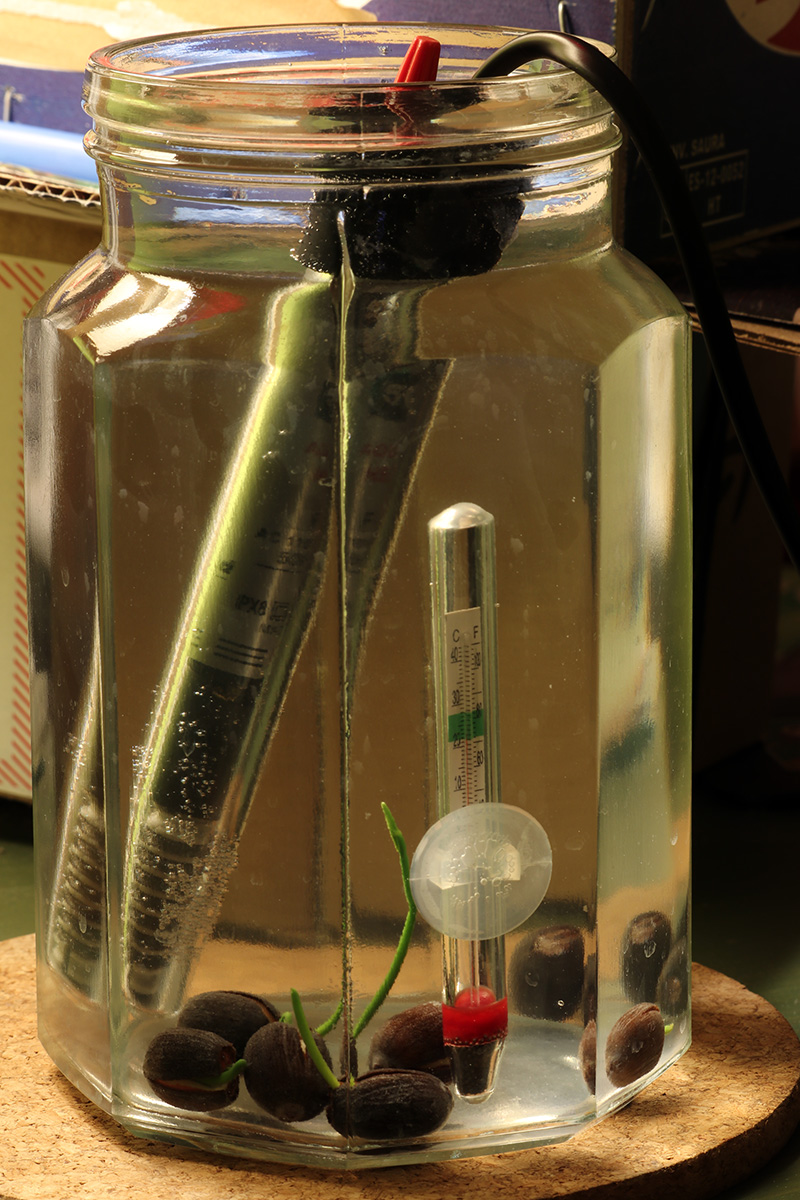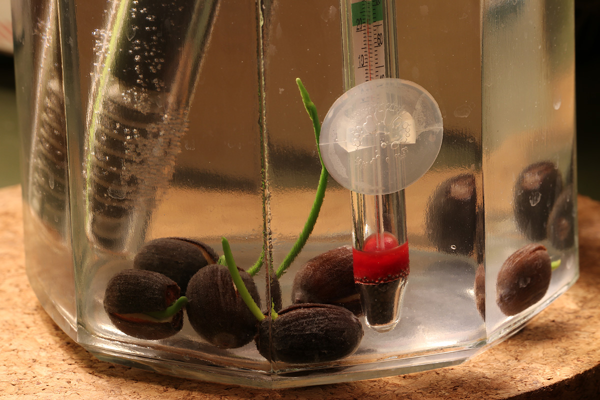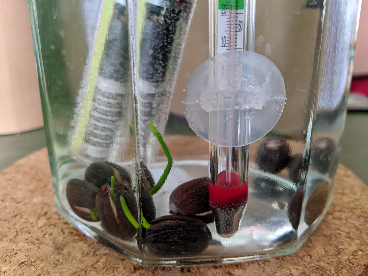 i changed the water of my lotus jar. yesterday 6 seeds looked like they were all going to germinate but today i had confirmation. while pouring the seeds out i must not have been gentle enough because two of the stem tips broke off without me realizing it. hopefully they can grow regardless. there were 3 remaining seeds that had yet to germinate and i thought they were rotten. i decided to cut open the one that looked to be in the worst shape. to my surprise, the inside looked very healthy, there was even a green germ that looked like it might have still germinated given enough time. the thing i did notice was it wasn't able to break the softer inner skin. maybe i didn't sand it down enough to break the inner skin, hence no germination. of the remaining two ungerminated seeds, i scored them a bit more with a pocket knife in the hopes that it will break the inner skin for them to possibly germinate.