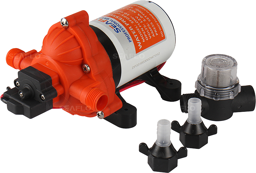 next came the decision as to what brand of demand pump. the video i first learned about these pumps was using a flojet. but during my search, i came across these seaflo pumps being sold on RV websites. they really stood out, with their bright orange pump head assembly. the few reviews on the website said good things. they were sold on amazon as well with likewise positive reviews.