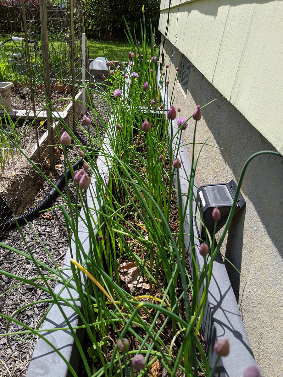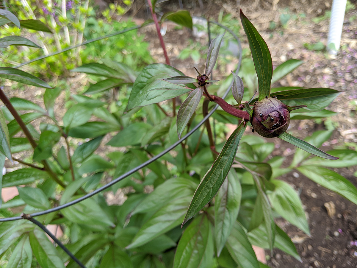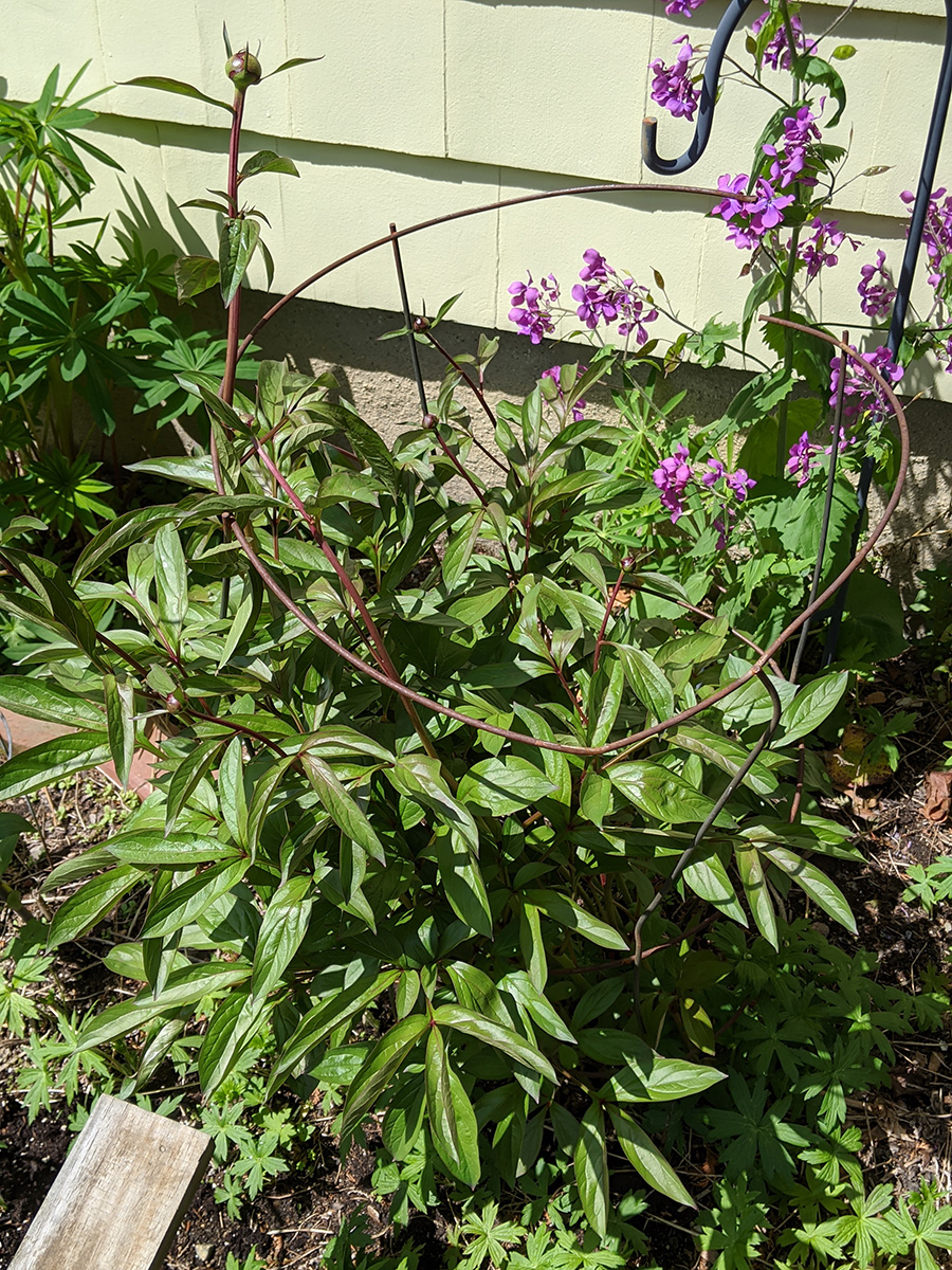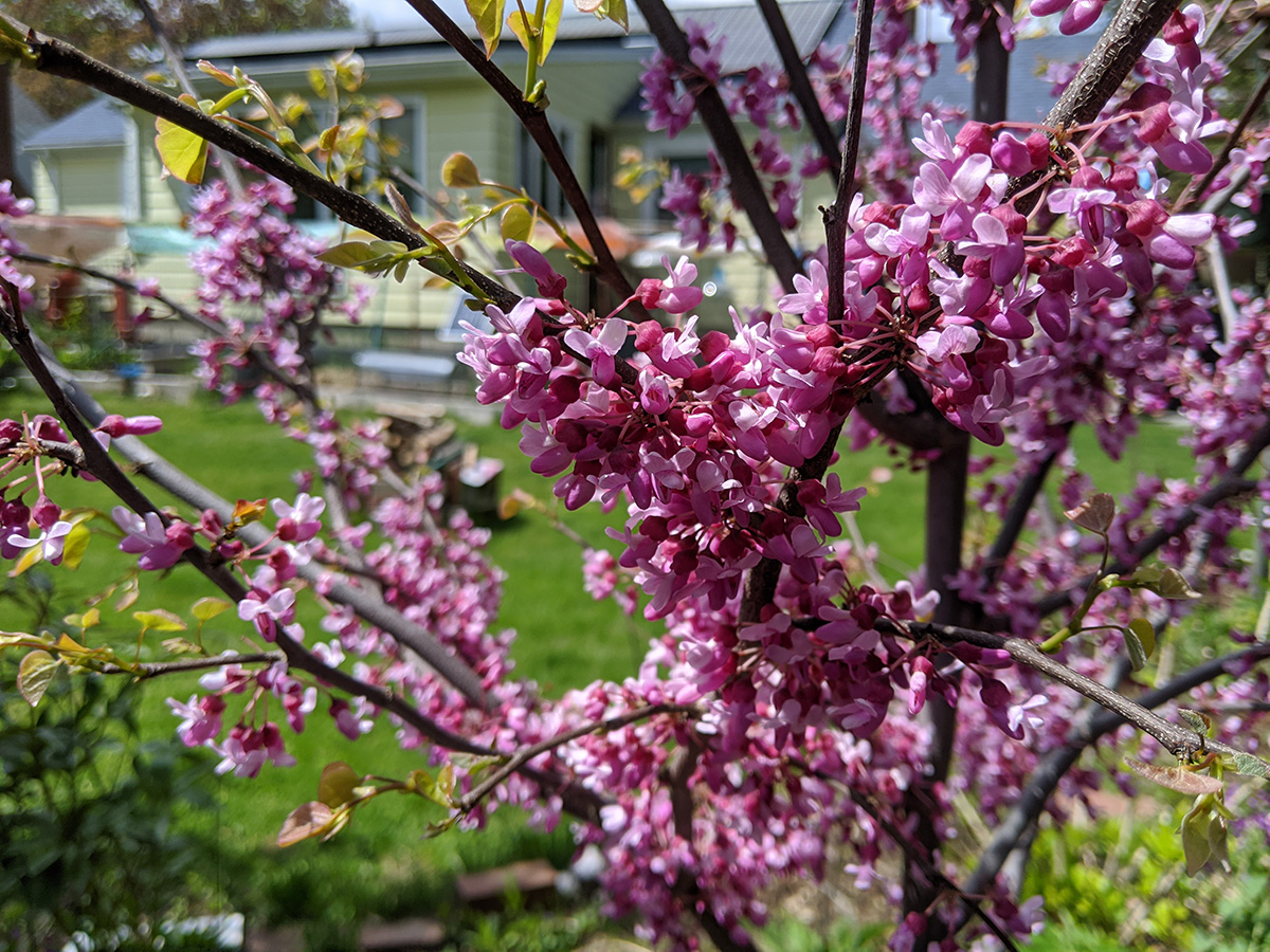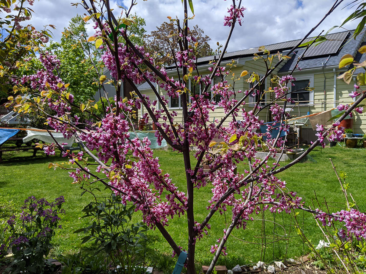 redbud, money plants, chives, and yellow alyssums seems to be the only thing in bloom in the backyard. peony flower buds are swelling and lupines are leafing out but yet to show any flower buds.