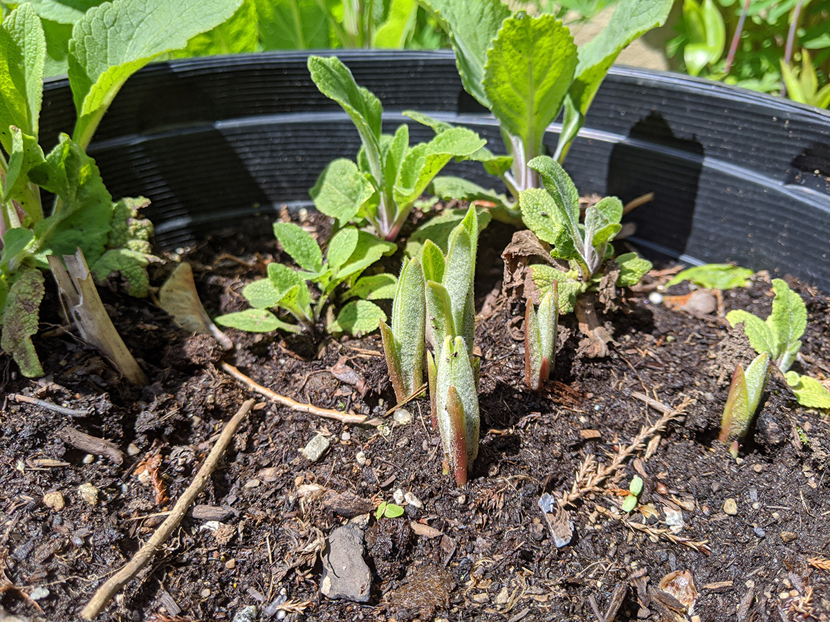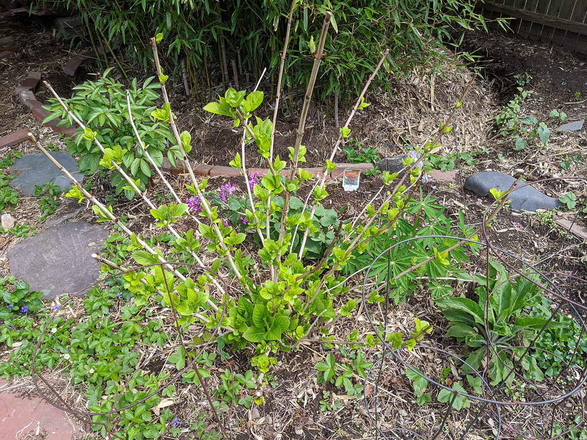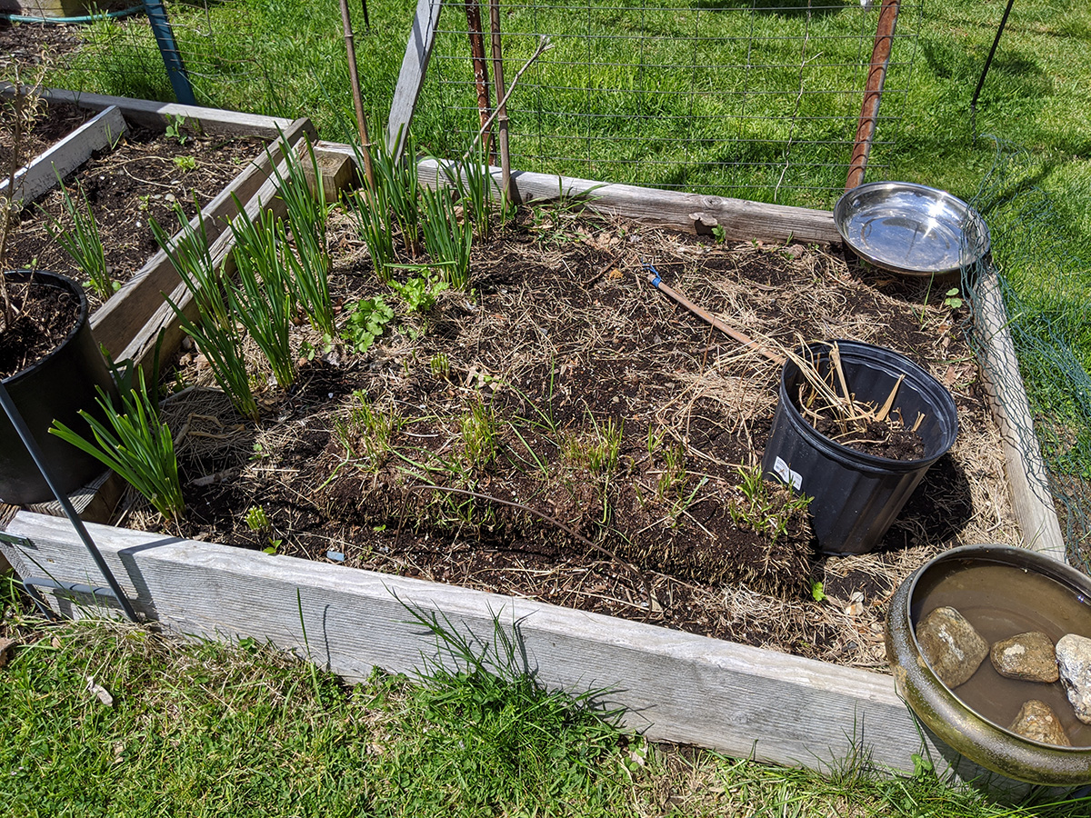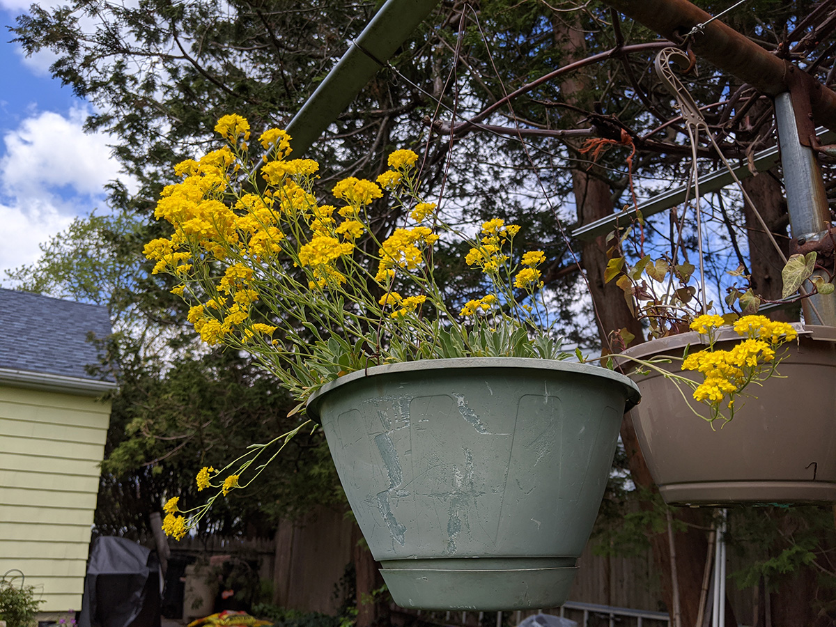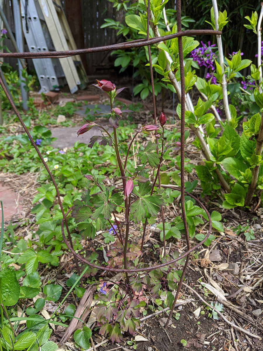 redbud, money plants, chives, and yellow alyssums seems to be the only thing in bloom in the backyard. peony flower buds are swelling and lupines are leafing out but yet to show any flower buds.