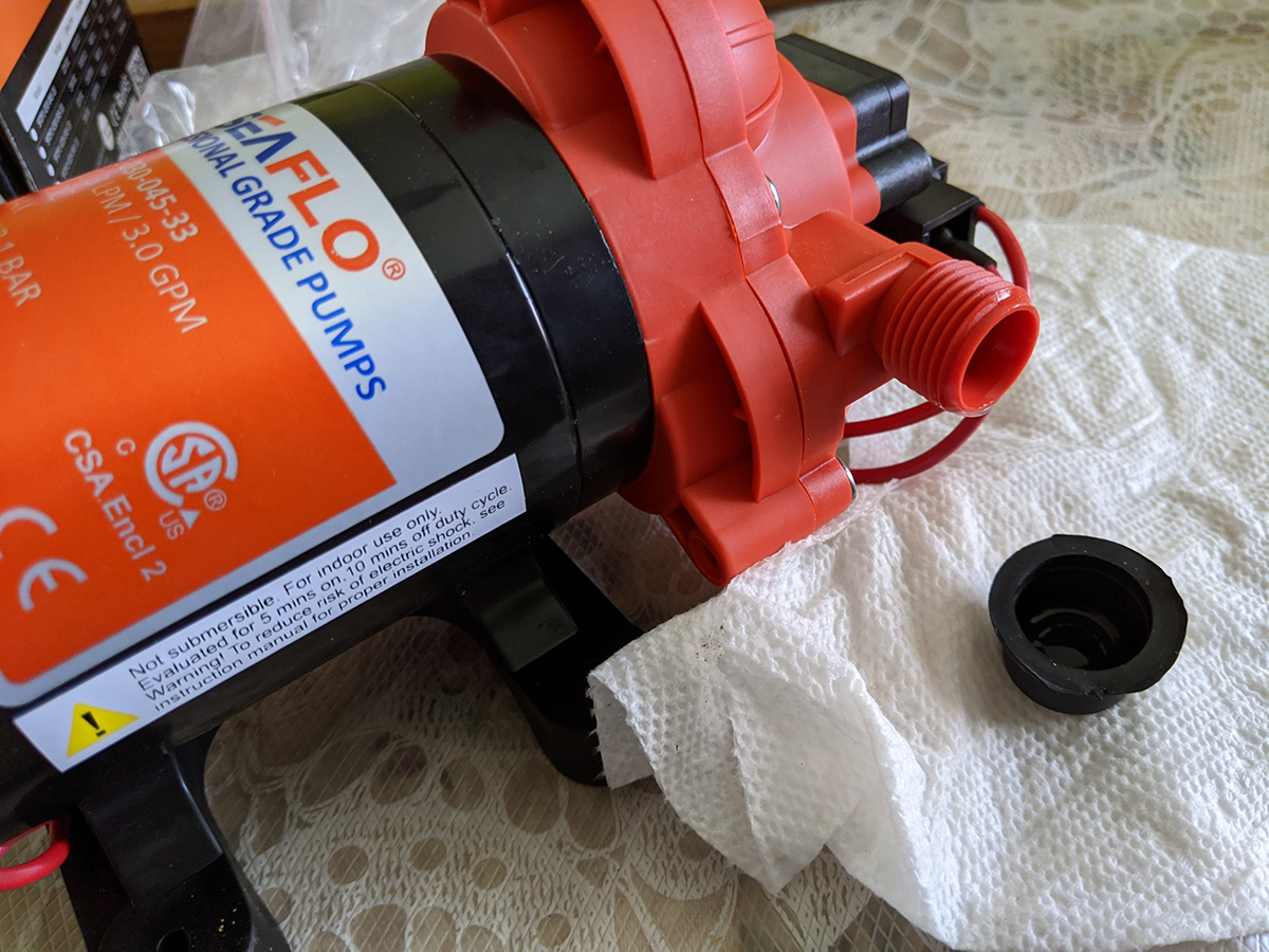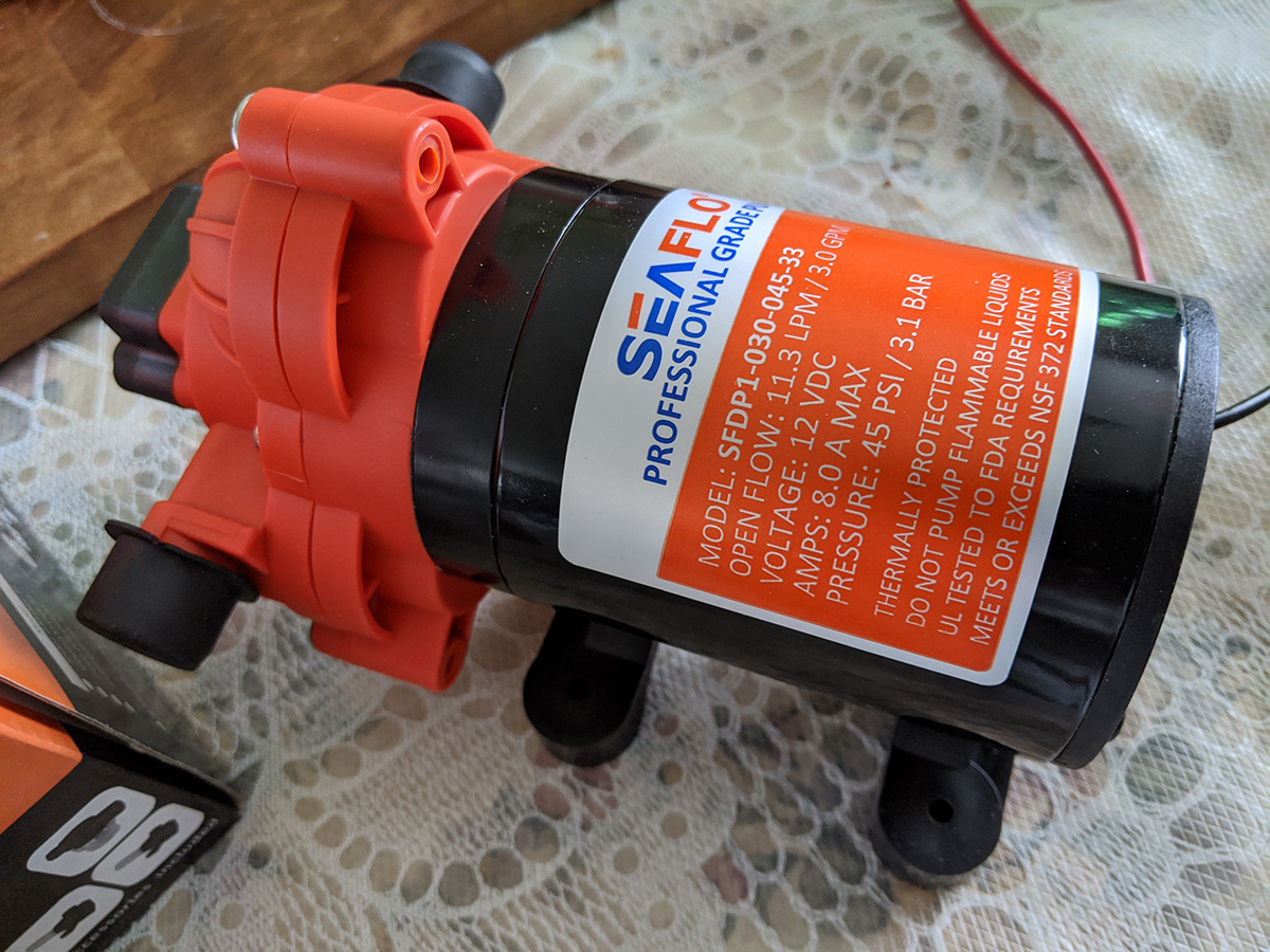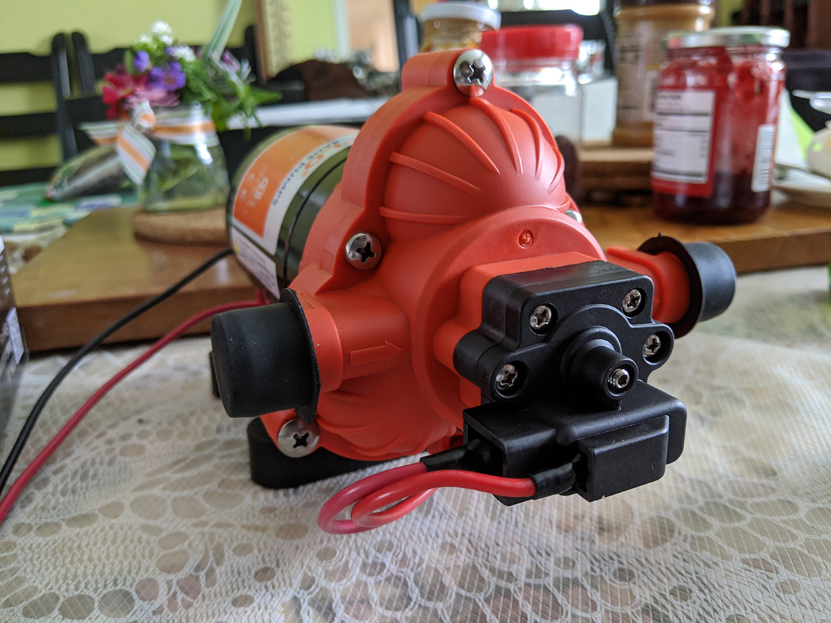 we also took the series-33 on-demand pump from its box for inspection. earlier today i wrote to seaflo again regarding possible return/upgrade, they still haven't written back. i'm starting to think they have zero customer service, since there's not even a telephone i can call, just a messaging form on their website. something we realized immediately when we checked out the pump is the inlet/outlet connectors are 1/2", not the standard 3/4" of garden hoses. that means we'd need adapters in order to use it with our current rain barrel setup. i remember reading up about it in some of the reviews, i completely ignored that fact, so much for carefully vetting a product before purchasing. it's nothing new though, most on-demand pumps like these use 1/2" fittings, since they're meant to be installed on RV/boats, which don't need the larger 3/4" volume of a garden hose. finding the right adapter was unusually difficult however, most 1/2" to 3/4" adapters are meant for plumbing, so they're mostly brass, which is not only more expensive but a little too fancy for our needs. my father figured out a way of using the included 1/2" barb connector adapter in combination with clear 1/2" and 3/4" tubing along with a 3/4" garden hose adapter to make a super adapter that can connect the pump to a garden hose. another thing i learned from a review is that the pump looses pressure when a garden hose is connected to both the inlet and outlet; it much rather have a 1/2" inlet to a 3/4" outlet, but the ideal solution would be 1/2" hosing through, which we can't do since our system uses standard 3/4" garden hosing.