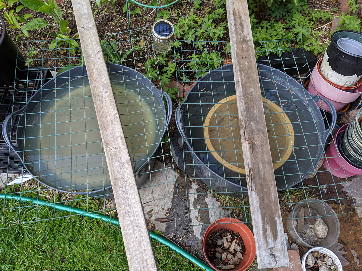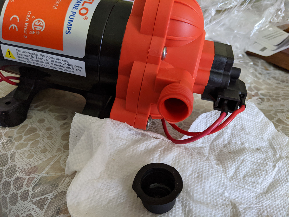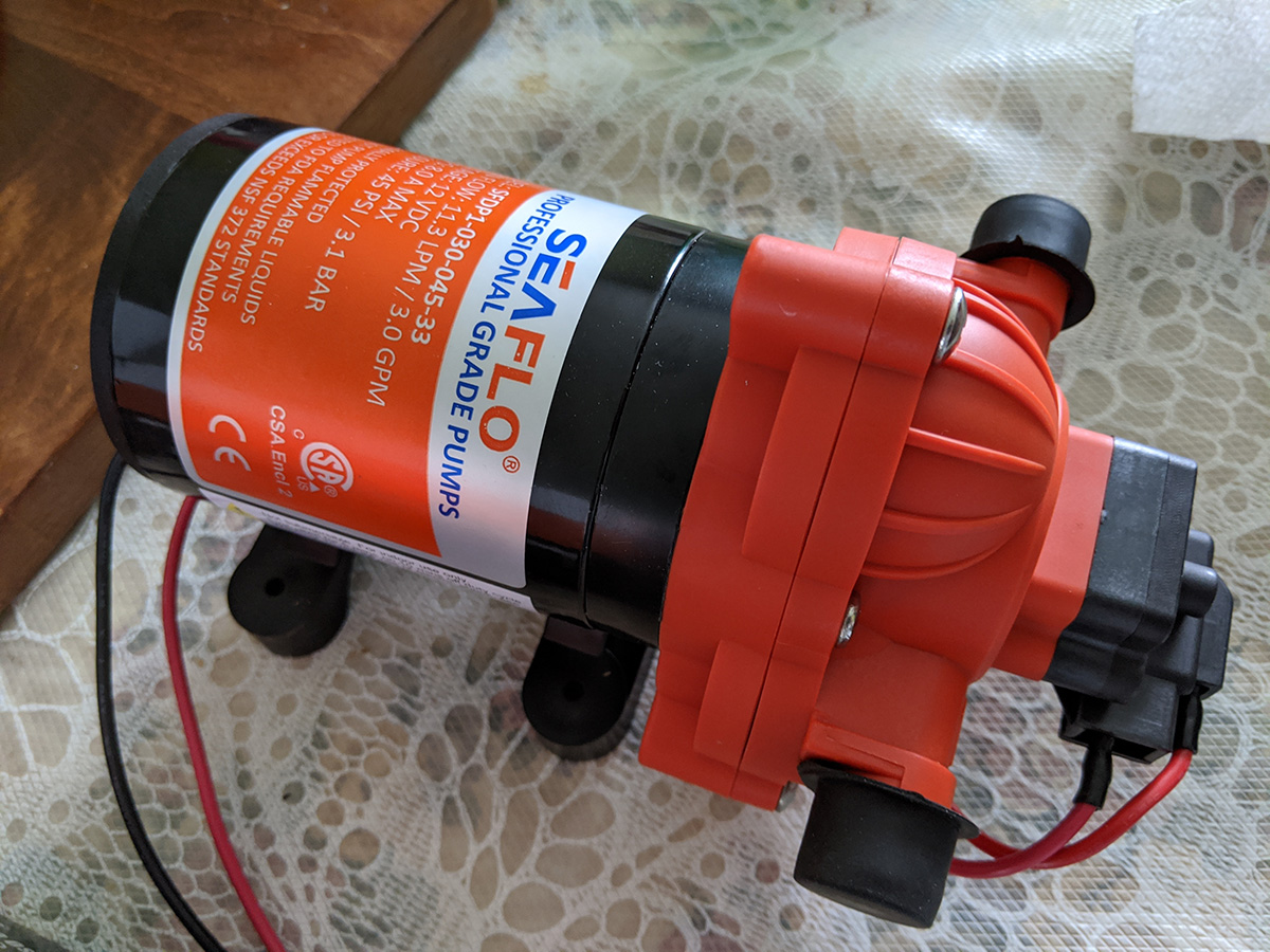 we also took the series-33 on-demand pump from its box for inspection. earlier today i wrote to seaflo again regarding possible return/upgrade, they still haven't written back. i'm starting to think they have zero customer service, since there's not even a telephone i can call, just a messaging form on their website. something we realized immediately when we checked out the pump is the inlet/outlet connectors are 1/2", not the standard 3/4" of garden hoses. that means we'd need adapters in order to use it with our current rain barrel setup. i remember reading up about it in some of the reviews, i completely ignored that fact, so much for carefully vetting a product before purchasing. it's nothing new though, most on-demand pumps like these use 1/2" fittings, since they're meant to be installed on RV/boats, which don't need the larger 3/4" volume of a garden hose. finding the right adapter was unusually difficult however, most 1/2" to 3/4" adapters are meant for plumbing, so they're mostly brass, which is not only more expensive but a little too fancy for our needs. my father figured out a way of using the included 1/2" barb connector adapter in combination with clear 1/2" and 3/4" tubing along with a 3/4" garden hose adapter to make a super adapter that can connect the pump to a garden hose. another thing i learned from a review is that the pump looses pressure when a garden hose is connected to both the inlet and outlet; it much rather have a 1/2" inlet to a 3/4" outlet, but the ideal solution would be 1/2" hosing through, which we can't do since our system uses standard 3/4" garden hosing.