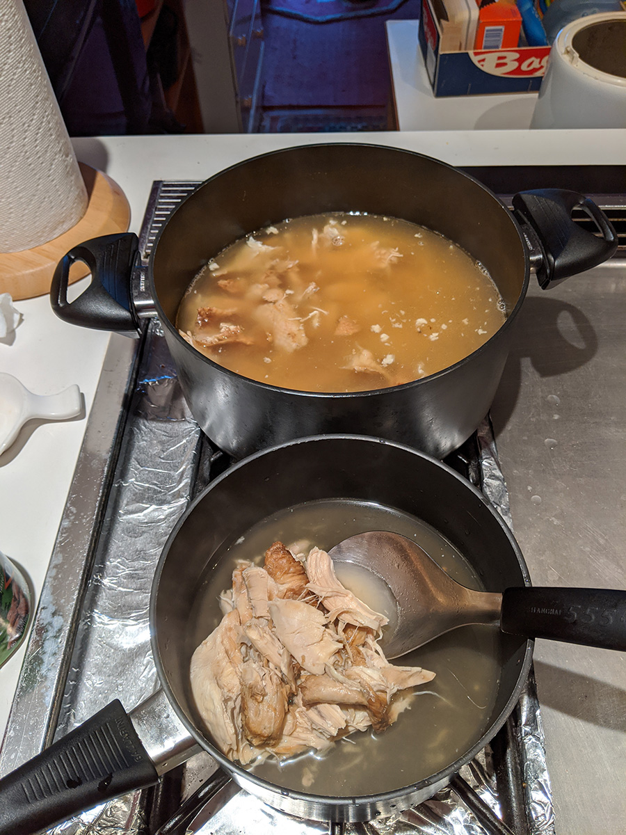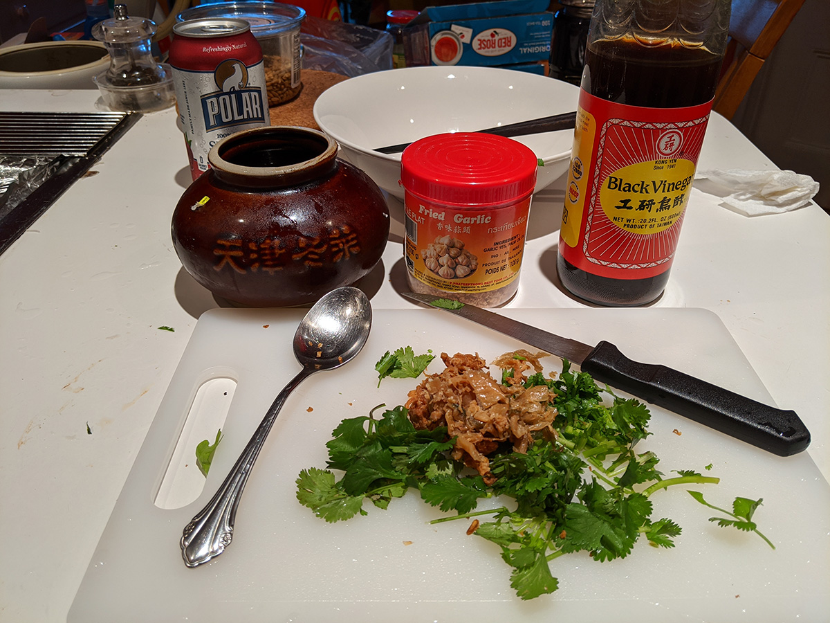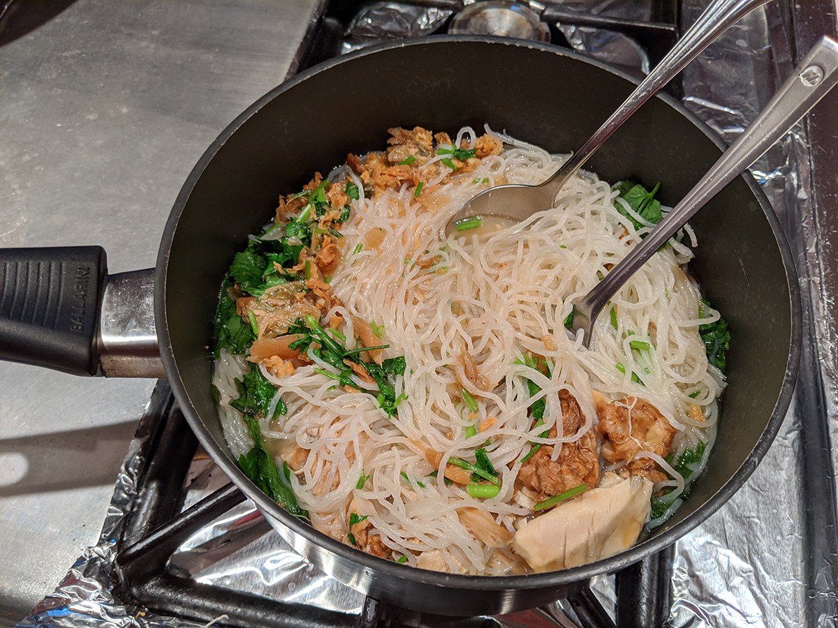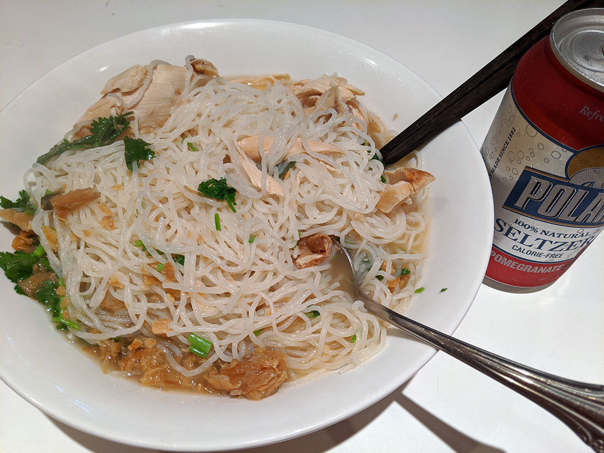 by 7pm the chicken stock was finally finished. i spent some time fishing out any bones and other inedibles. i then scooped out a medium pot's worth of broth and various chicken meat and reheated it again, this time adding some rice noodles, some 天津冬èœ, some fried garlic, chopped cilantro, and a dash of black vinegar. i haven't made rice noodle soup in a long time, this used to be one of my staples. buy a rotisserie chicken, eat it on the first day (lunch and dinner), save everything (including bones), use it to make a broth the next day, making enough broth for 3 additional servings of chicken rice noodle soup.