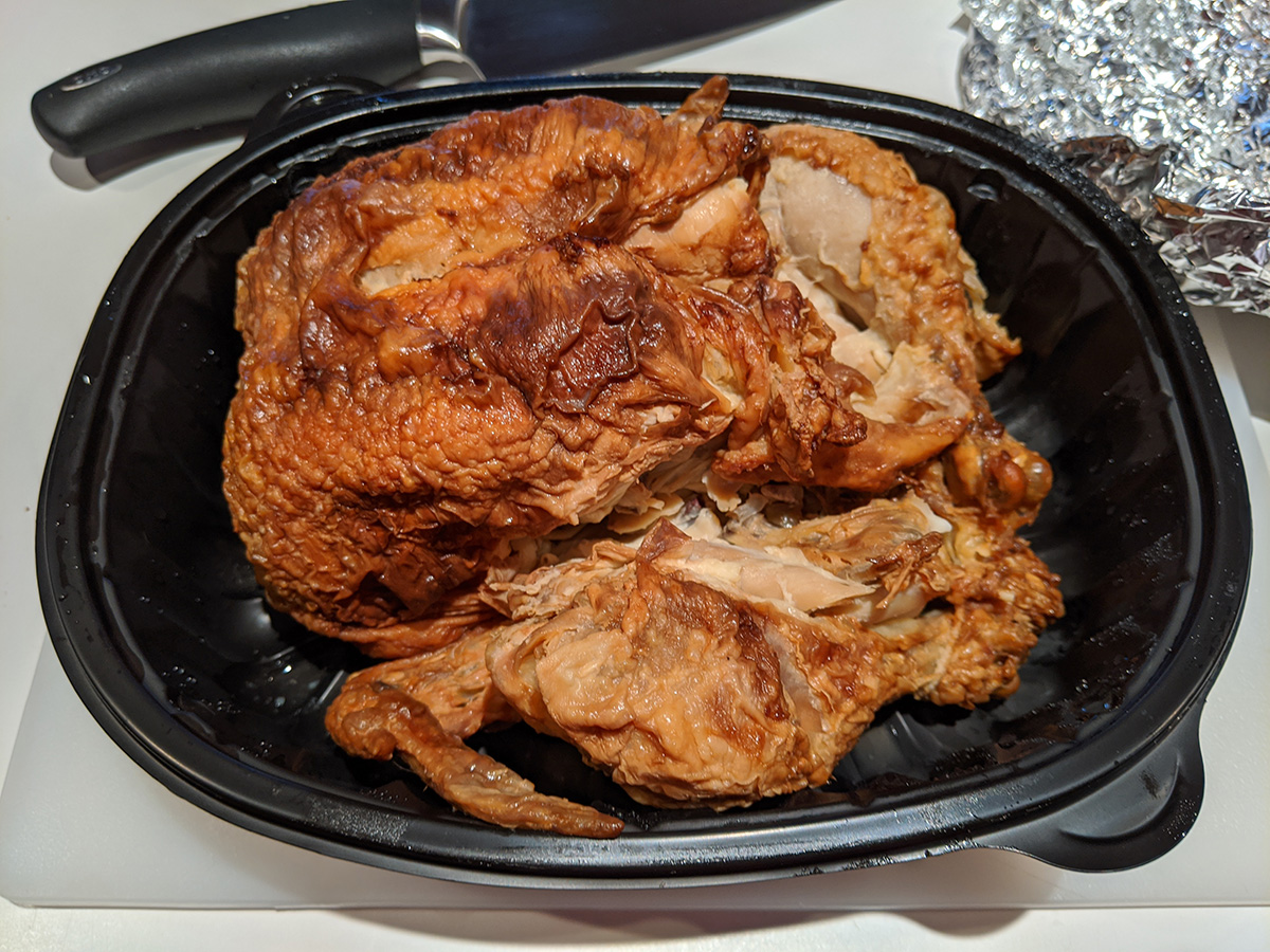 at 6pm i started making my rotisserie chicken stock for my rice noodles. i removed the two drumsticks (my mother said she wanted those) and split the rest of the chicken into parts. into the pot it went, along with some crushed ginger, a dash of chinese cooking wine, some ground white pepper, and a stick of scallion chopped into large pieces. i filled the pot with cold water and set it on boil with the cover on. once it started boiling, i removed the cover and turned the heat down to a simmer and left it for an hour. i also added some salt later on because i felt the broth didn't have enough flavor, about 1/2 tsp of salt.