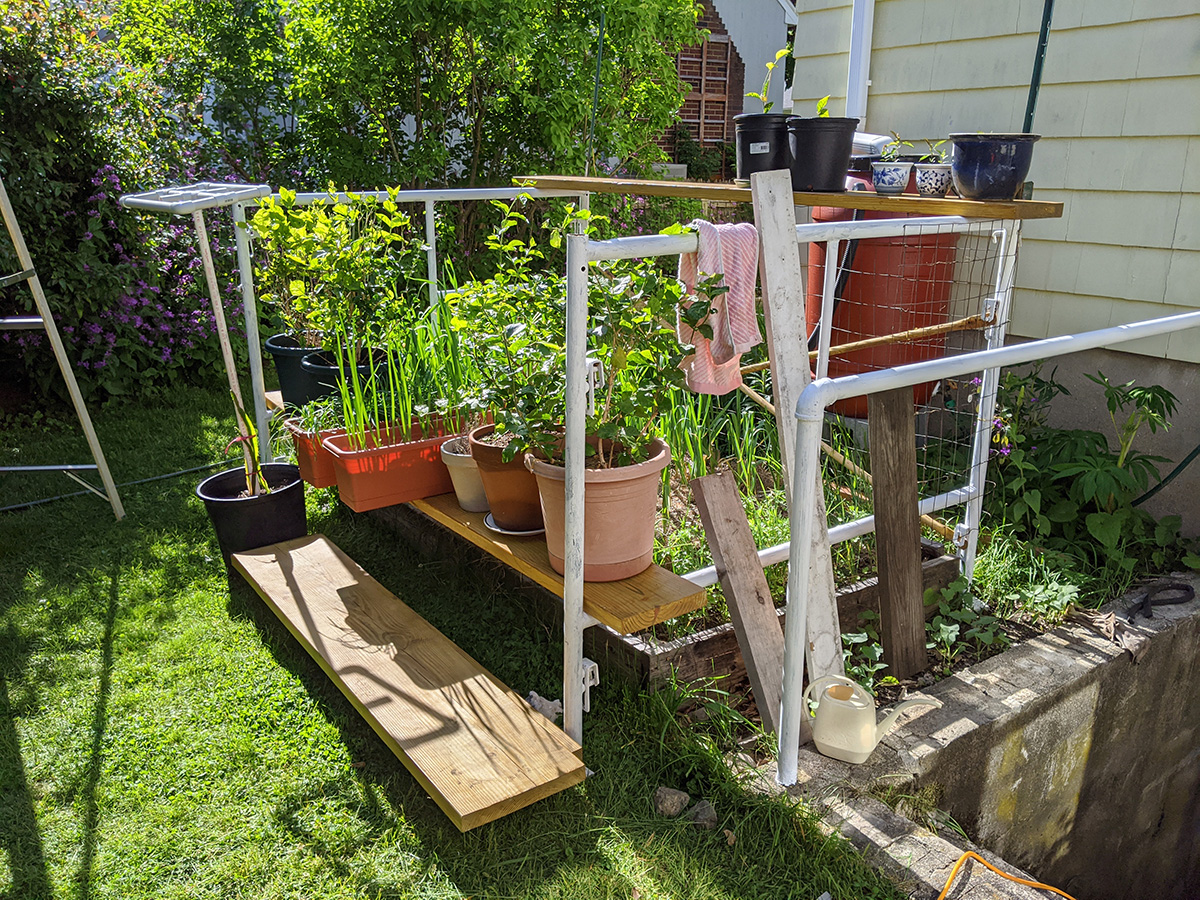 first stop was to the community garden, where i watered my plot. i noticed david has been slowly filling in his garden. i don't know if he buys or grows his own seedlings but they're magnificent, short enough not to topple over, with thick stems, and plenty of healthy leaves. he had tomatoes, japanese eggplants, and cucumbers. his garden is a mess but but my summertime he grows enough food to probably not need to buy anymore produce.