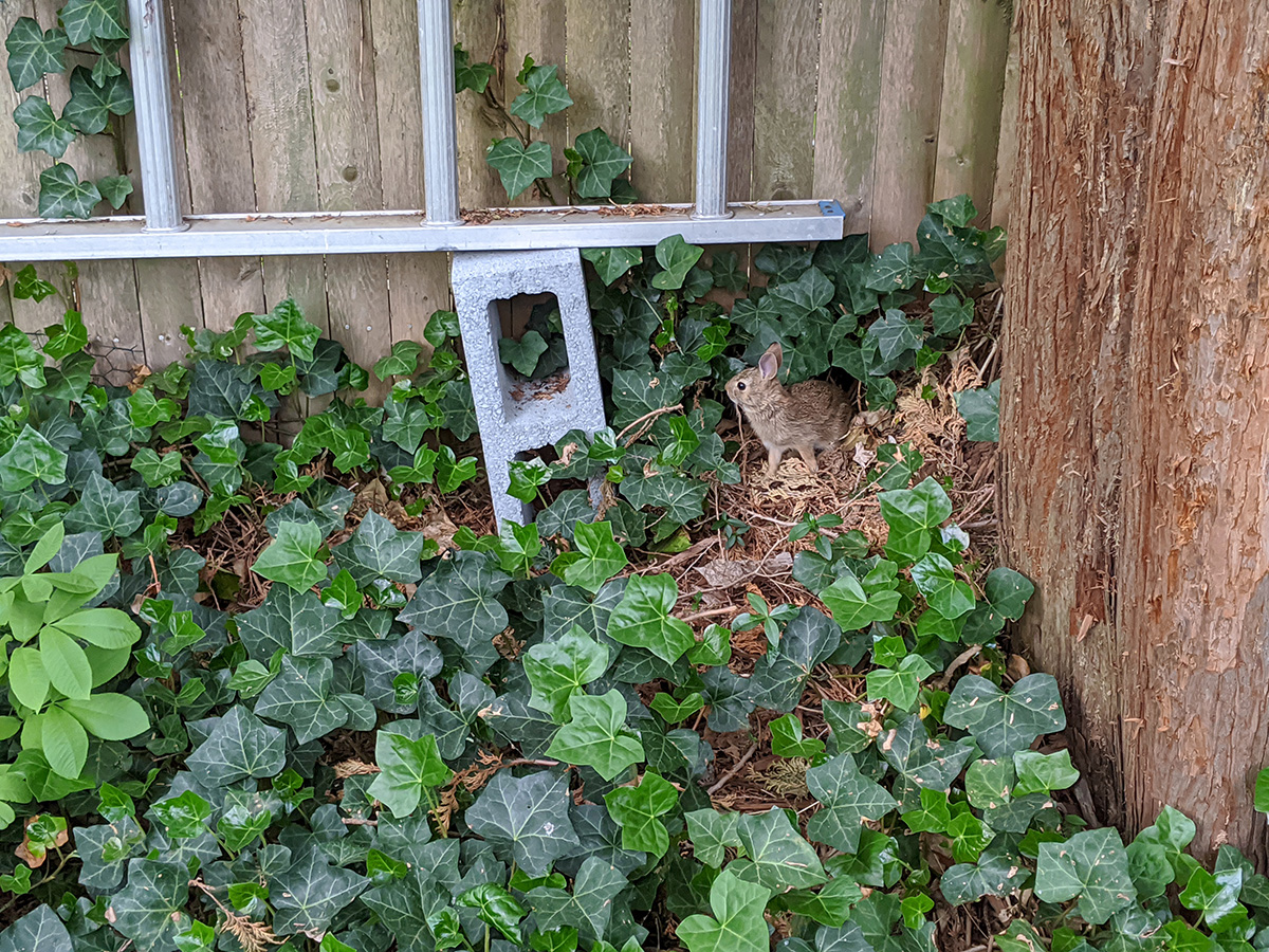 afterwards when we inspected the garden, i spotted a bunny. one bunny means there's more and we saw a second one. we drove it to the southeastern corner of the yard where they escaped through a large crack in the fence (probably how they came in). we put some chicken wire in the corner to keep them from coming back. but afterwards i thrashed the spiderwort and ornamental grass ground cover with a bamboo pole and a 3rd bunny popped out. my father and i chased it throughout the backyard, from one side to another, hoping to drive it out. i even removed the chickenwire so it could escape from the corner crack. finally it ran to the northwestern corner of the backyard where it probably escaped through another corner opening. i ended up patching both with chickenwire. later i found out my parents actually saw one of the bunnies yesterday. it didn't seem to be afraid of humans, maybe it was too young to know the danger.