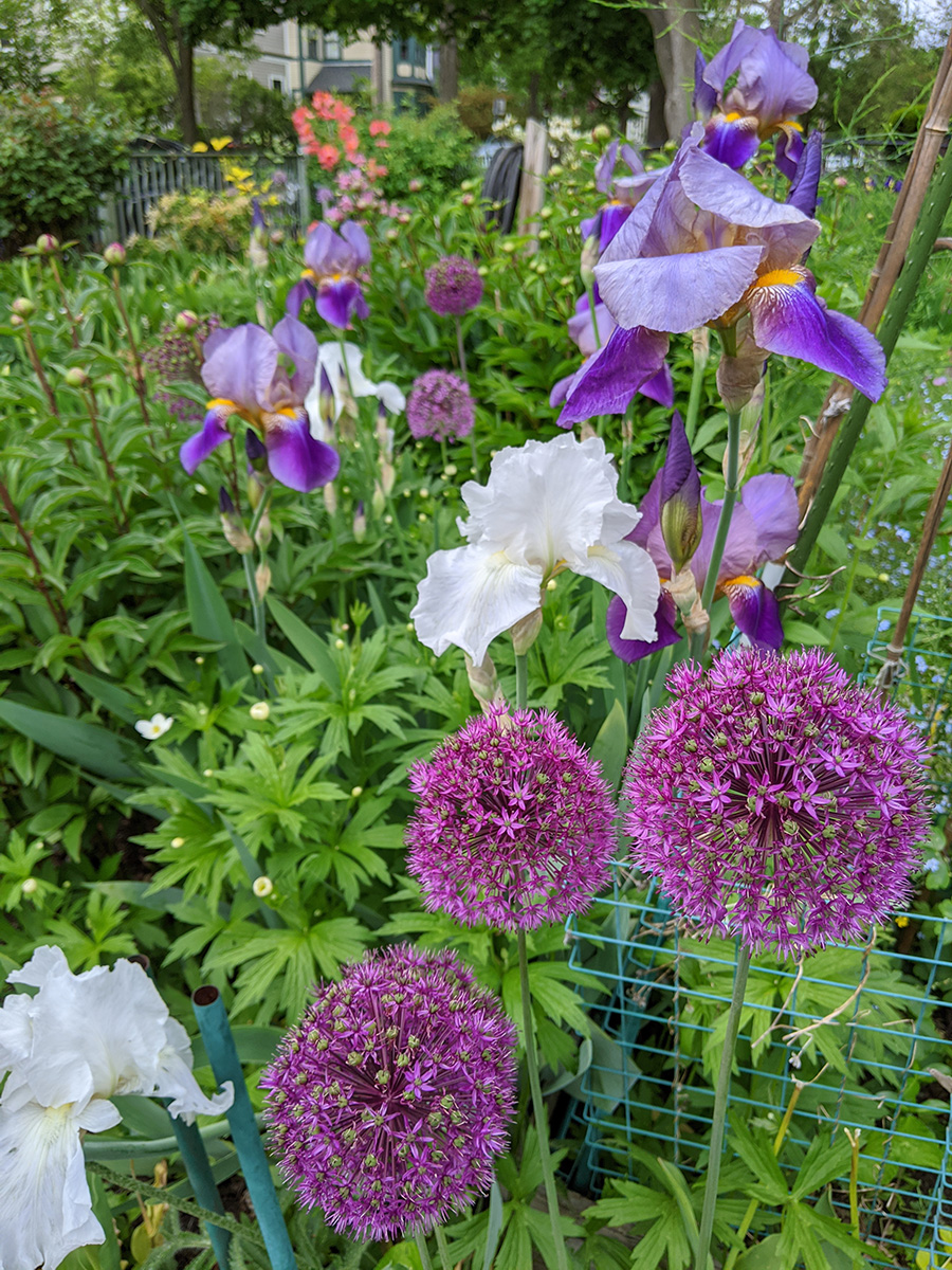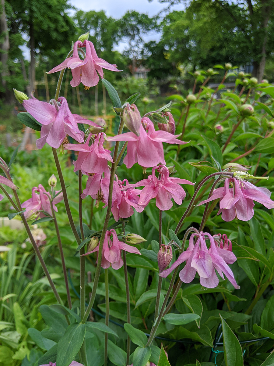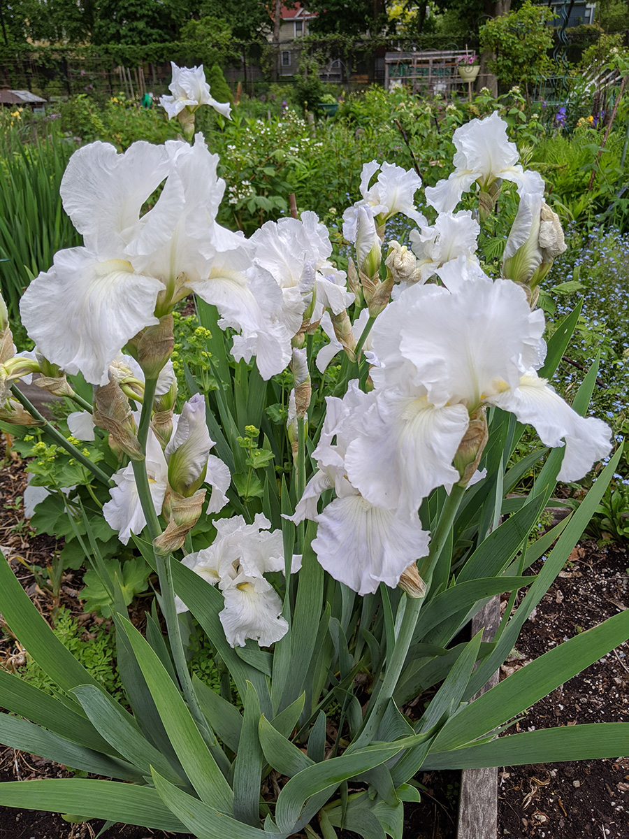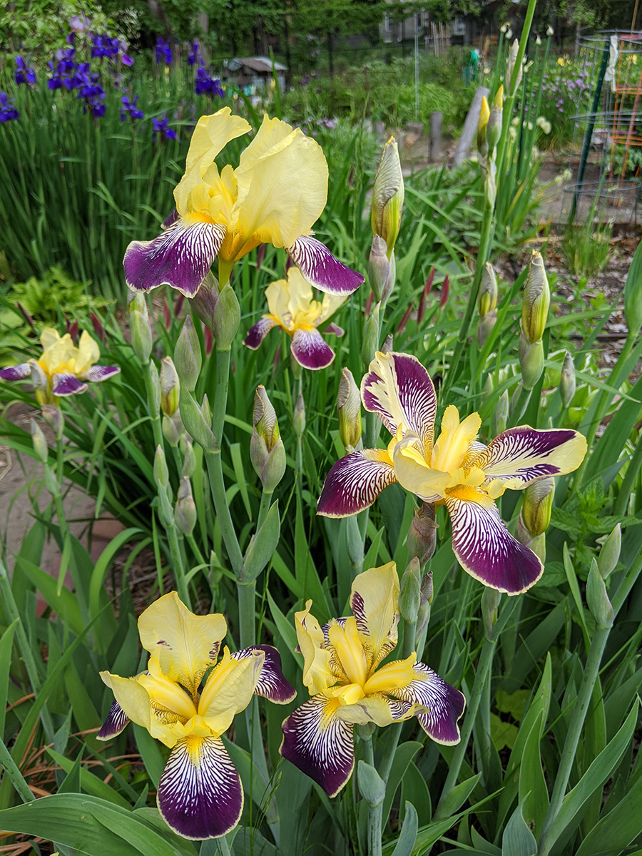 i watered my community garden plot and backyard this morning. the weather was overcast but warm, with a soupy humidity. for some reason there was zero pressure in the hose. i checked the faucet just to make sure and there seems to be something wrong with the plumbing. i trickled water my plot the best i could. it was so humid, the plants weren't in any danger of drying out anyway. i went around the rest of the community garden taking photos of the irises and columbines before finally walking home, where i then watered my yard, front and back.