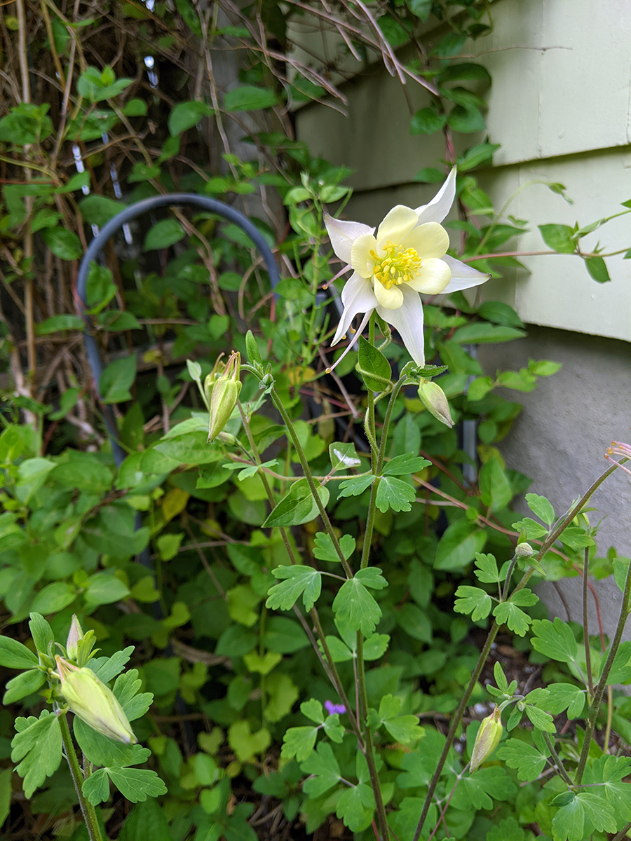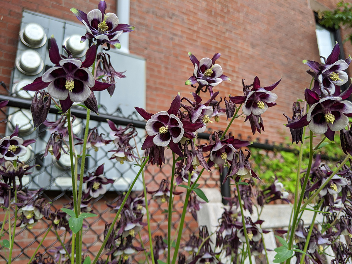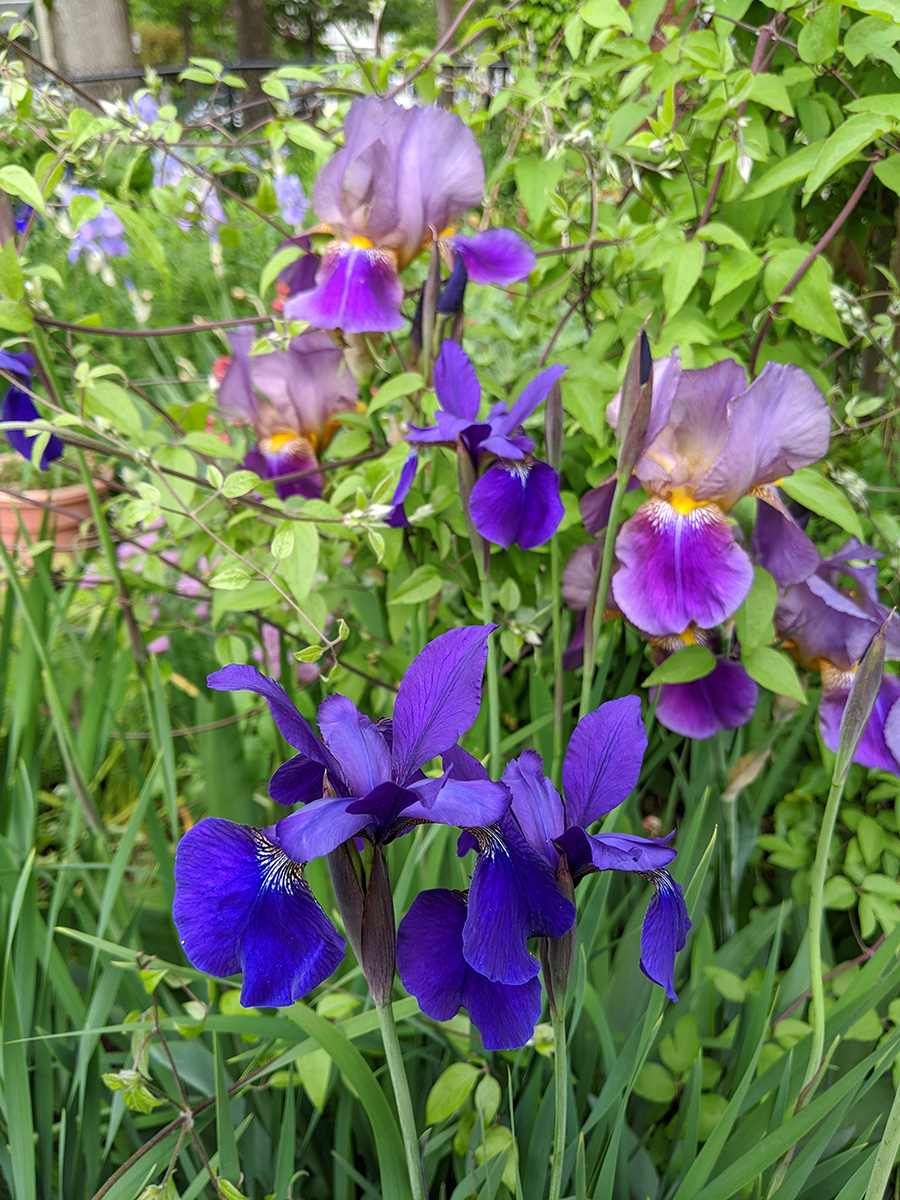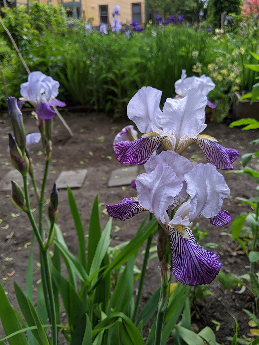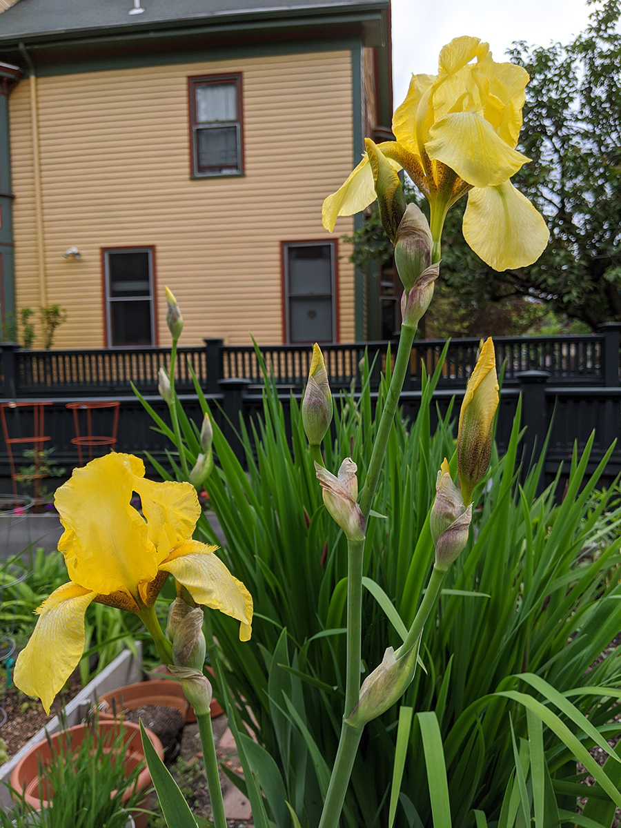 i watered my community garden plot and backyard this morning. the weather was overcast but warm, with a soupy humidity. for some reason there was zero pressure in the hose. i checked the faucet just to make sure and there seems to be something wrong with the plumbing. i trickled water my plot the best i could. it was so humid, the plants weren't in any danger of drying out anyway. i went around the rest of the community garden taking photos of the irises and columbines before finally walking home, where i then watered my yard, front and back.