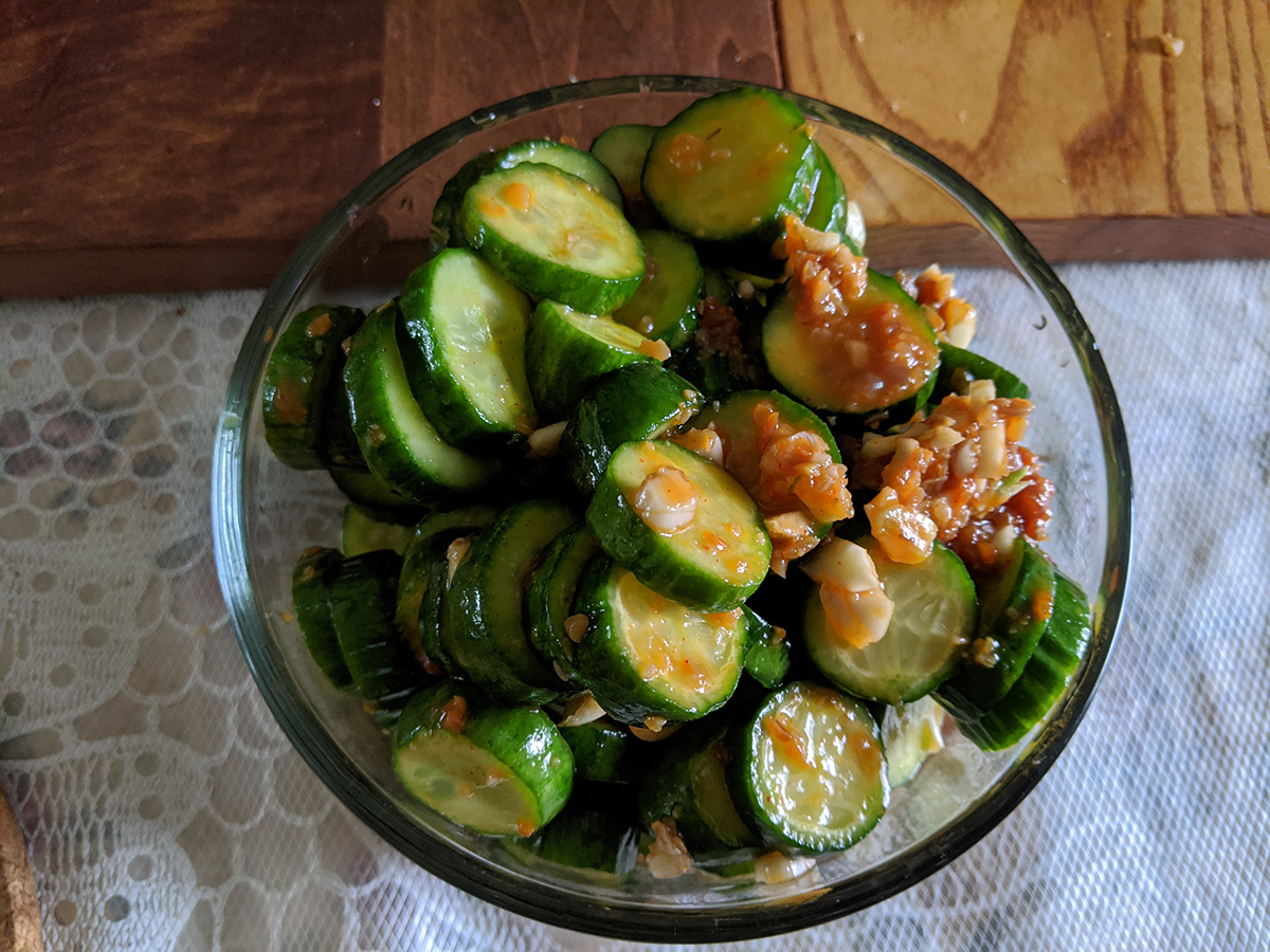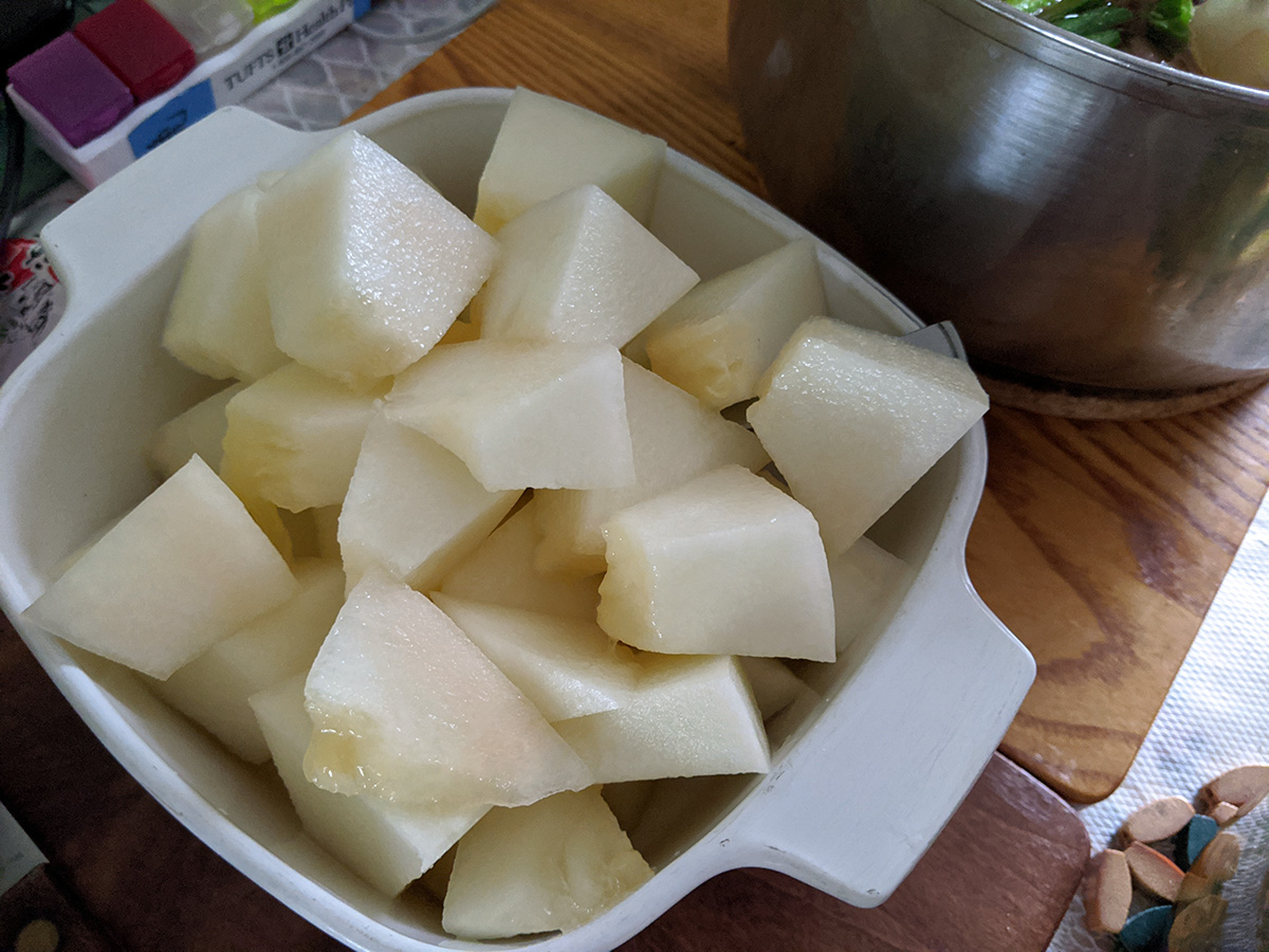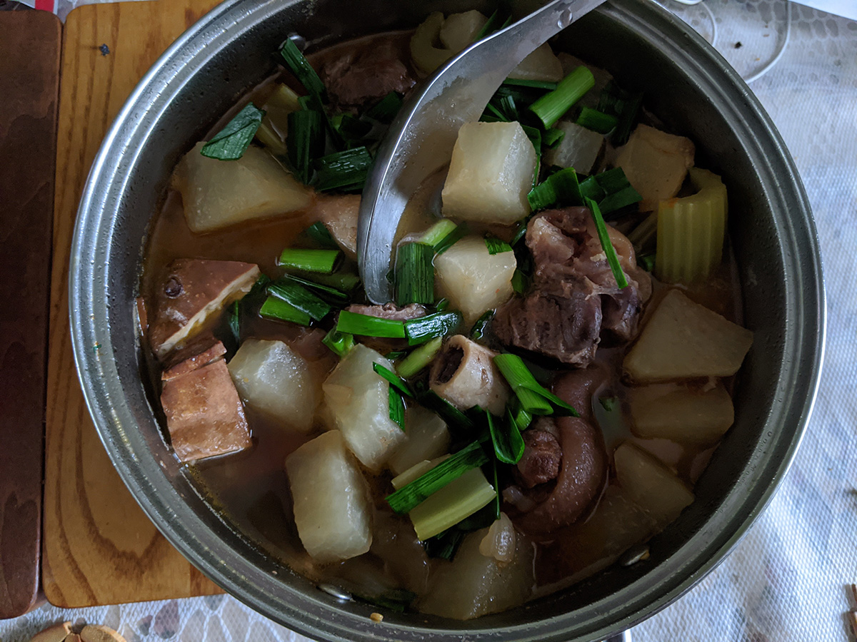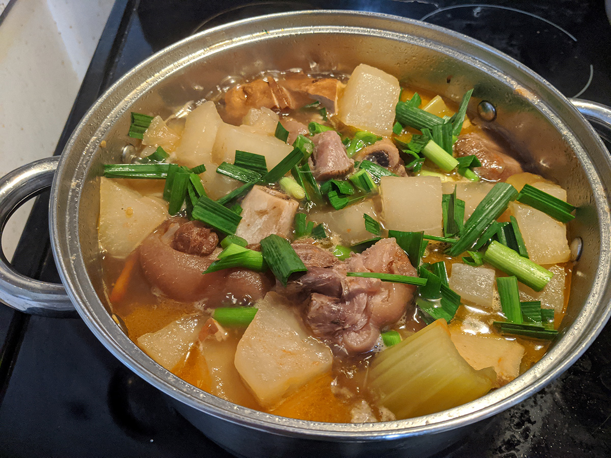 i was going to go home but ended up staying for dinner, where my mother already cooked the pork hocks. as for the ground pork, she said she was going to make chinese dumplings this weekend, and told me to collect the remaining garlic chives from my garden plot.