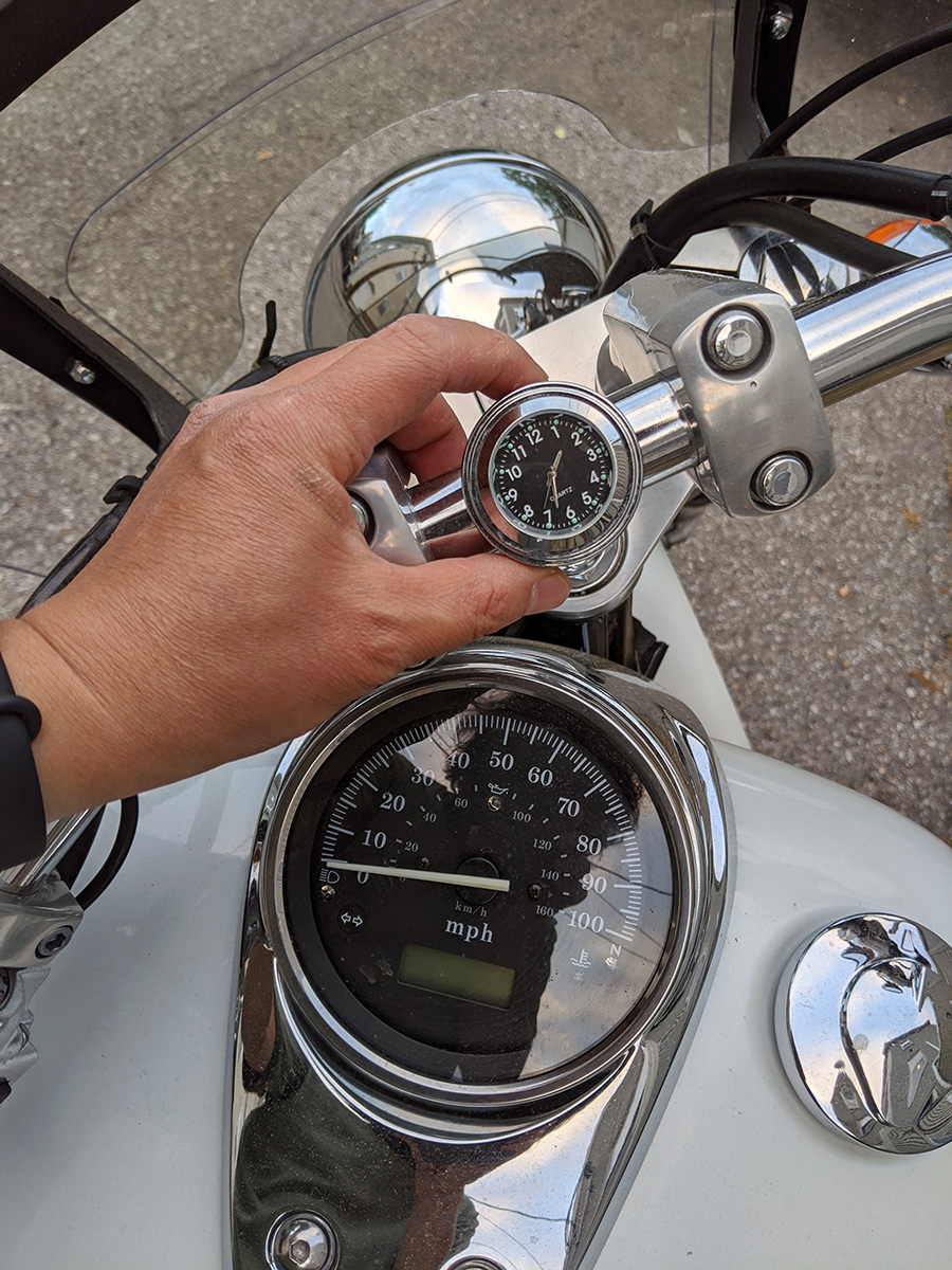 i returned home, still warm enough to just wear a t-shirt on the bike. once back, i tried to remove my motorcycle handlebar clock which had gone dead after the bike had been in storage for the past 5 months. i tried every single hex wrench i had, going out half a dozen time, but none of them were the right size. it must use an irregular size hex. but then i tried one of the allen wrench on my topeak alien ii bike multi-tool and that one worked (for the record, it's 2.5mm). i opened up the casing, it's a small 377A battery. i had one in my watch battery collection but it'd already started to corrode from age. i ended up getting some new ones off of ebay, a pair of 377 renata watch batteries for $1.81 (due to arrive by next friday). 377 are better because they're silver oxide, compared to the 377A which are alkaline.