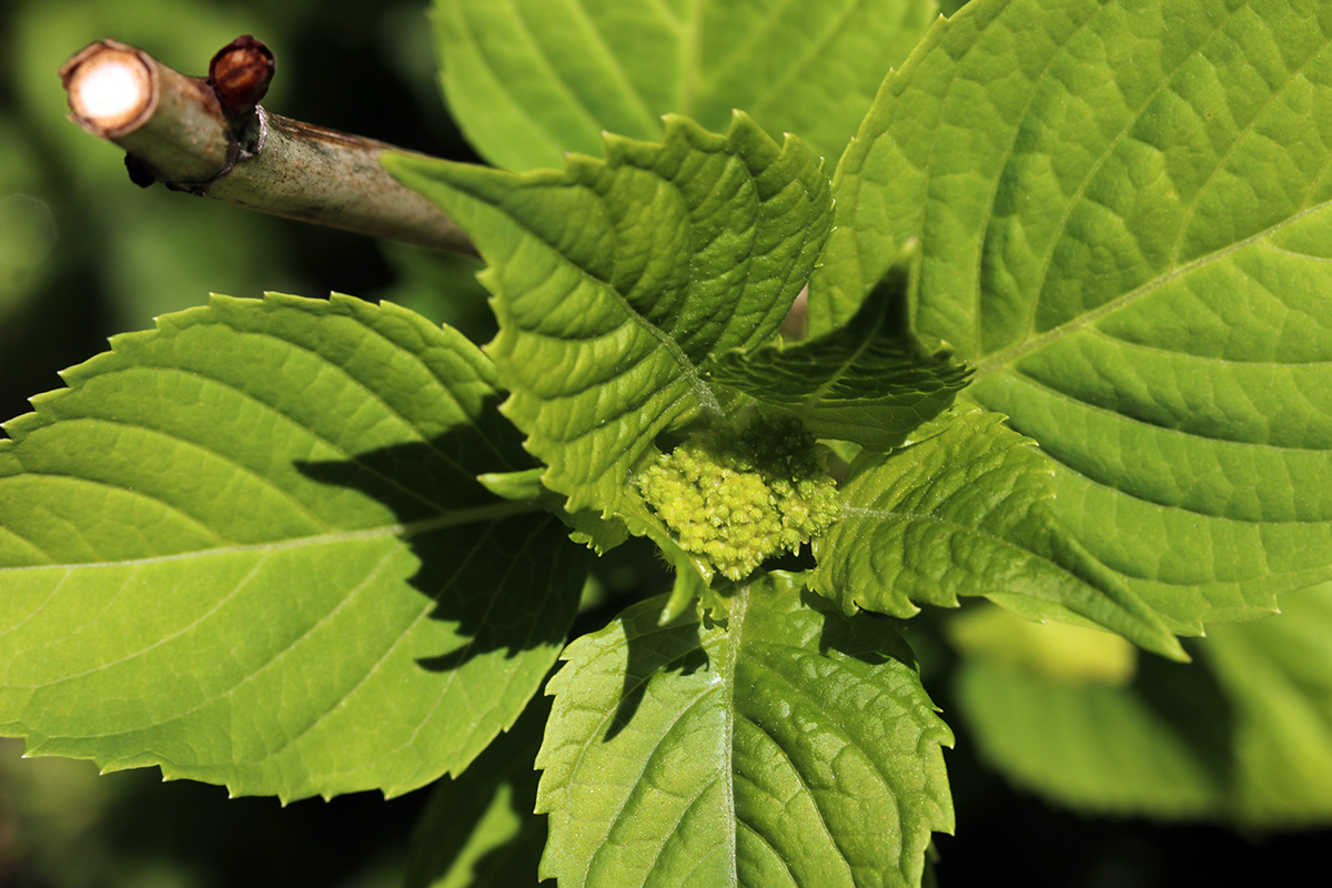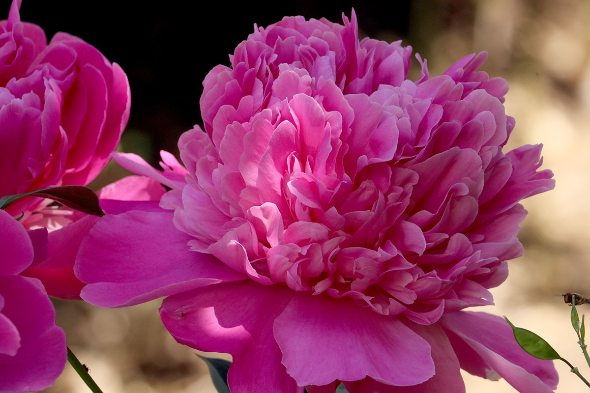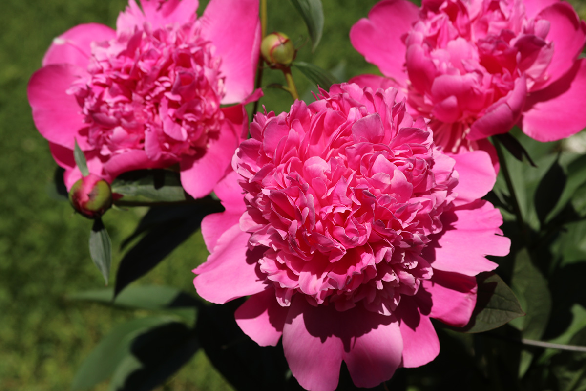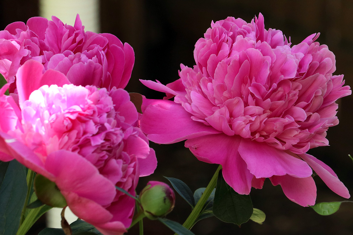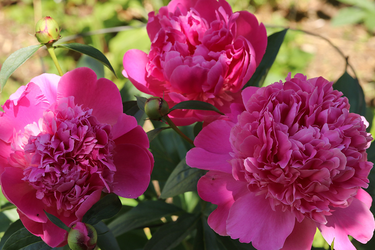 3 pink peony buds have bloomed in the southeastern corner perennial bed. there's a few more side buds, not sure if they'll be blooming as well. this is only the 2nd season this transplanted peony has been at this new location but it seems to be doing well in the full sun. the peony in the behind-the-garage perennial bed is a lot bigger and more established, with more flower buds. because it doesn't get as much sunlight, it doesn't bloom as quickly, but the blooms last longer. some spiderworts have also bloomed, showing off their triangular magenta-colored flowers that only last a day. our blue hydrangea is showing some promise by making flower buds on nearly every terminal branches. i thought they only made flower buds on the tips of last year's branches, maybe of which were damaged by the cold. turns out that's not true, new branches emerging from last year's old branches will all make flower buds. this will be the garden highlight for this year. inside, the peach orchid now has three flowers, when yesterday there was just two; the flower seemed to have magically appeared fully formed overnight.
