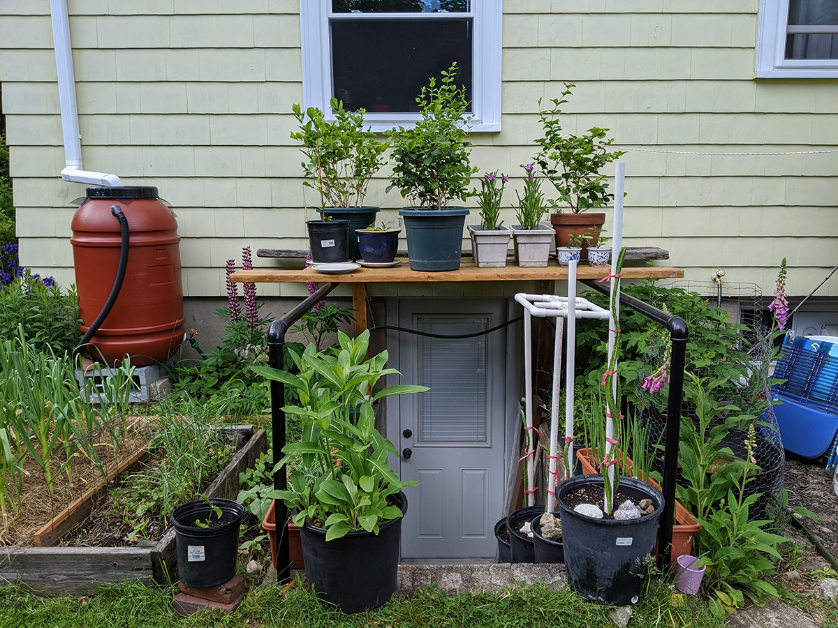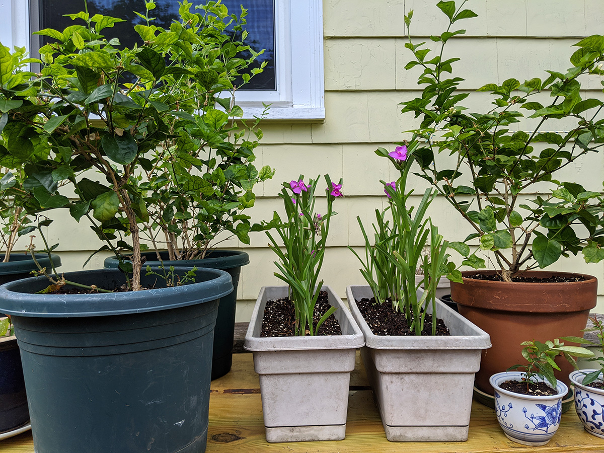 we brought out all the houseplants again: jasmines, gardenia, reed, cactuses; now that it doesn't look like temperature will be dropping back into the 40's. afterwards i sprayed the jasmines and gardenia with insecticidal soap as we noticed mealybugs on some of the tender tips. my father seems to be exasperated over finding all these new pests (aphids, mealybugs) and has asked me on more than one occasion if there isn't something stronger we can use to knock them all out at once. most of the stuff i read online has just said to use insecticidal soap, which is what we're doing. i think a combination of that plus the arrival of natural predators over the course of the summer should either keep the pests in check or completely eliminate them.