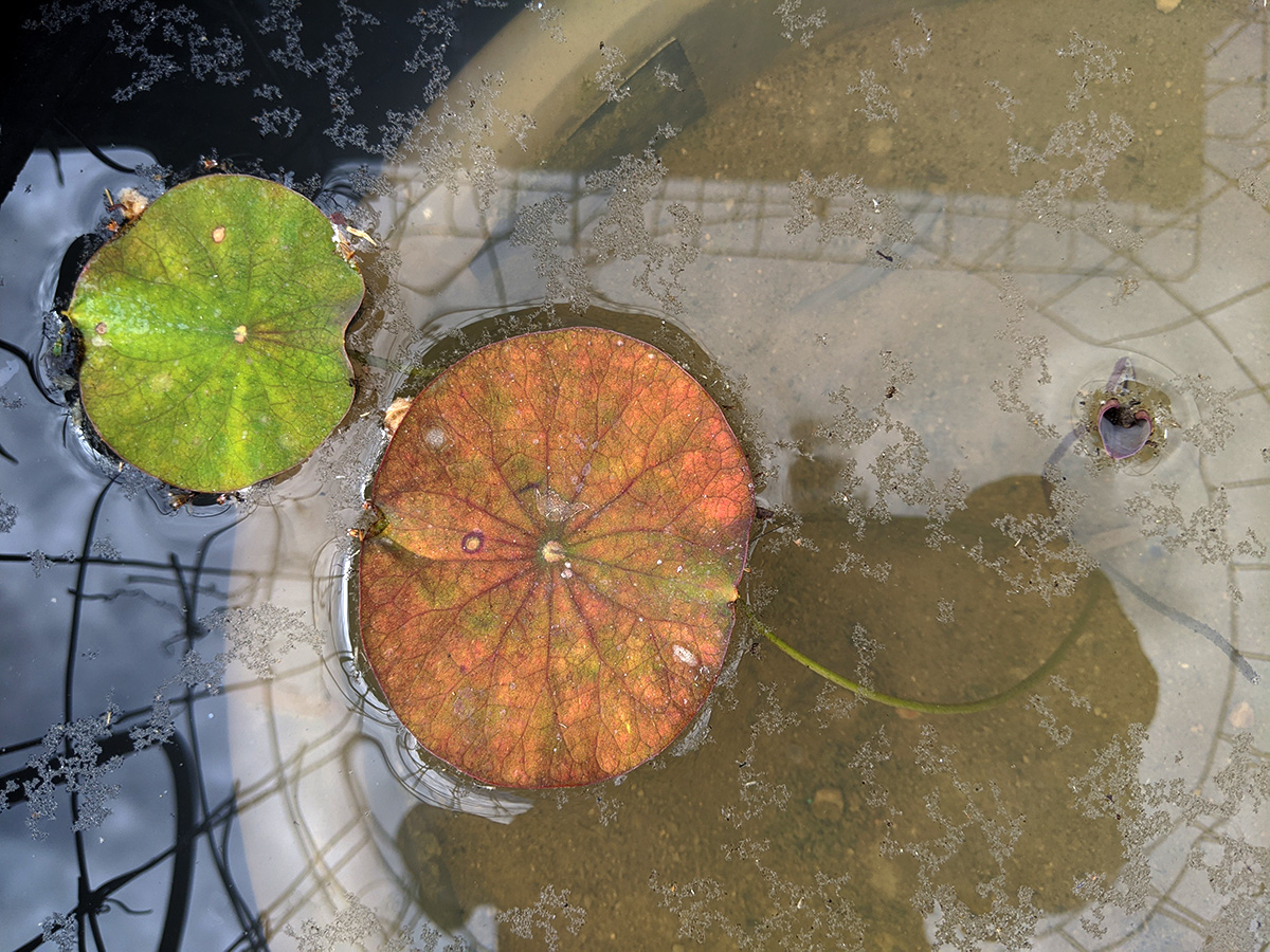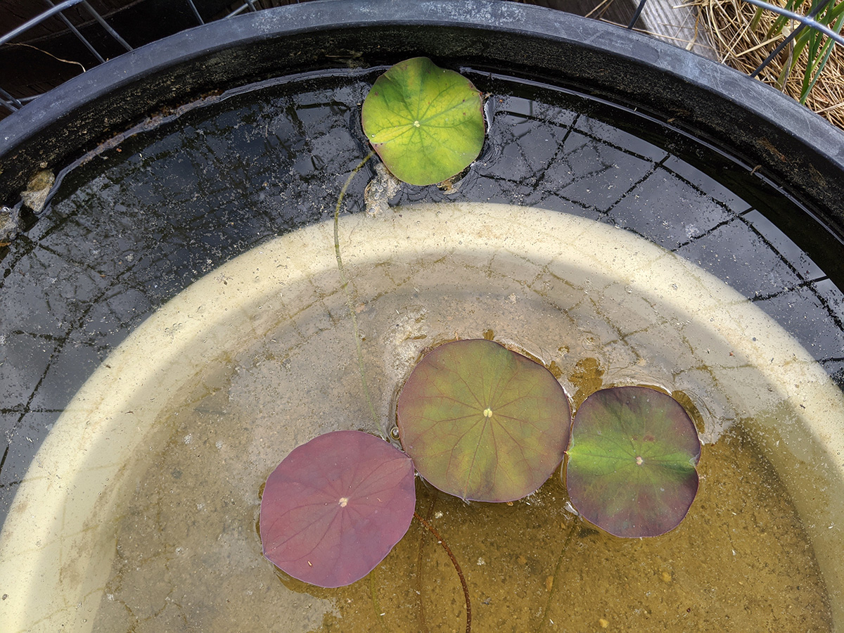 the lotuses are still alive by they don't seem to like the occasional night time cold snap where the temperature dipped into the 40's; that's why the leaves are all variable colors instead of uniformly green. i'm not worried too much about it though, i've started them earlier than last season (a month earlier, last year i didn't start germinating until june), with fewer raccoon vandalism. i'm also giving them bigger pots to grow in, and each plant has its own barrel. i'm not expecting flowers but i'm hoping to have 5 healthy lotuses that i can put back out next season.