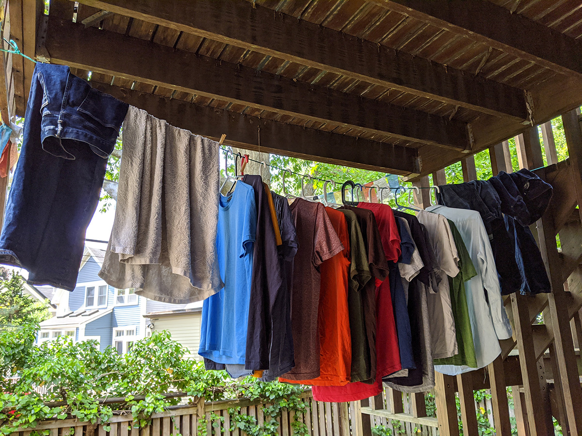 because today was such a sunny day, i decided to do a load of laundry and hang dry it outside. it was also a bit humid, with humidity in the 50's, so by the end of the day, some of my t-shirts still felt slightly damp. i don't hang dry my underwears and forgot that meant drying them in the kitchen draped on the back of chairs, which i apologized to kevin over having to witness such a spectacle.