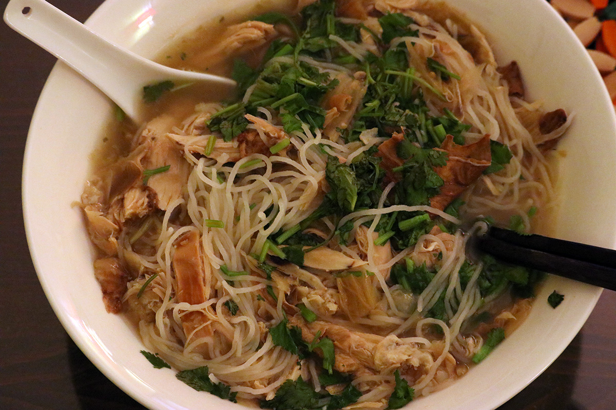 for dinner i reheated a frozen block of chicken broth i made nearly 2 weeks ago. once it was nice and melted and boiling in the pot, i added my rice vermicelli and additional spices.