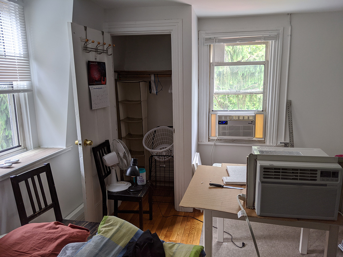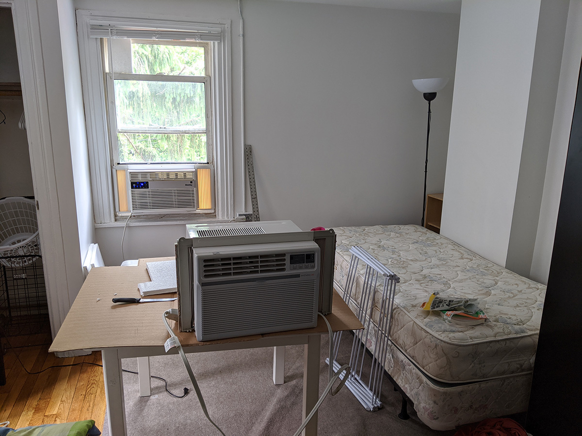 the empty bedroom for the most part was relatively tidy, but the previous tenant left a lot of stuff behind, things he thought too precious to toss out, but things we saw as trash. after clearing the clutter, we installed the AC's. the one in the common area by the stairwell, they said it broke over the weekend, and sure enough, it wasn't running. the compressor was going but the fan was dead, that one will need to be replaced. as for the two bedrooms, my father and i went down into the basement and climbed up two flights of windy narrow stairs to bring them up. the larger bedroom (the one kevin will be staying in) has two windows so putting a window unit AC isn't a big deal. the smaller bedroom though, it only has one window, and the student living there seemed to regret complaining about the heat because now his only window was blocked by the AC.
