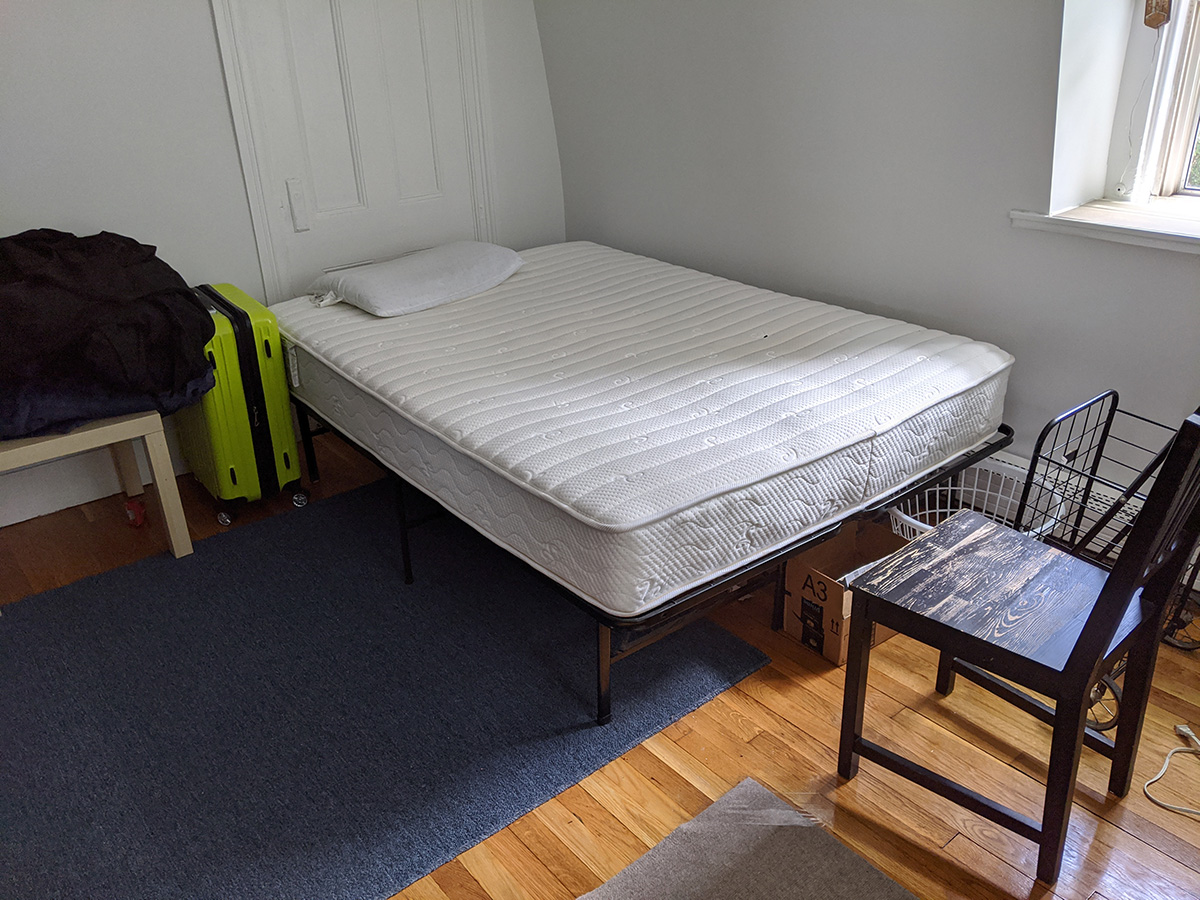 after that we took apart the smaller twin bed1 and moved it to the cafe basement - bed frame, box spring, mattress. we then moved the full-size bed back to it's original corner (by the southern facing AC window).