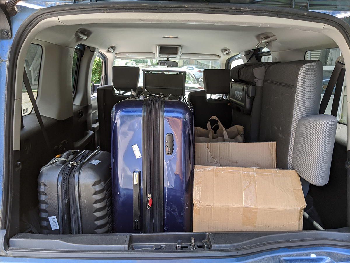 kevin had just finished with his meeting and said we could leave after he ate his lunch (leftover from yesterday). at 12:30pm i started moving some of his stuff into the living room. he seemed worried that not everything would fit, even though last night i showed him the car i'd be driving and pointed it out to him parked across the street. once we started loading did he finally realize just how much room we had.