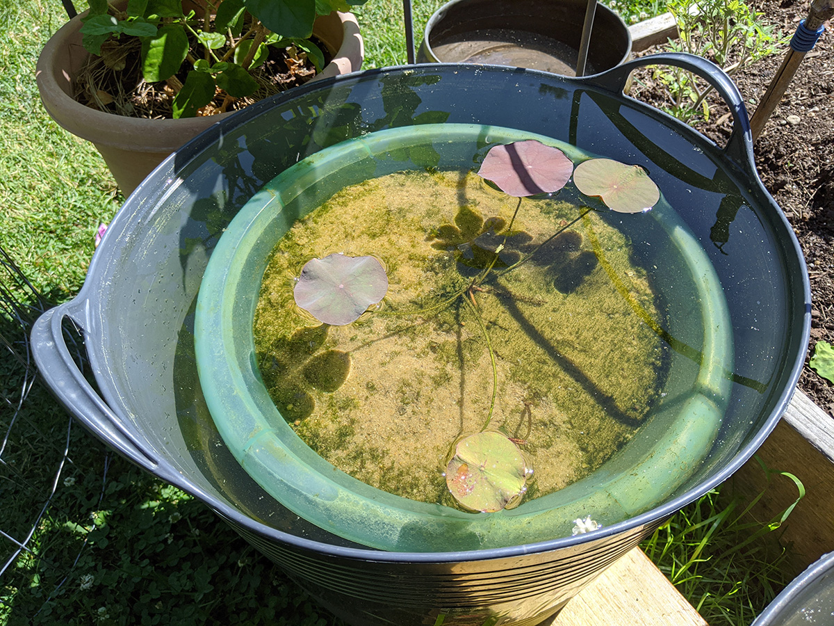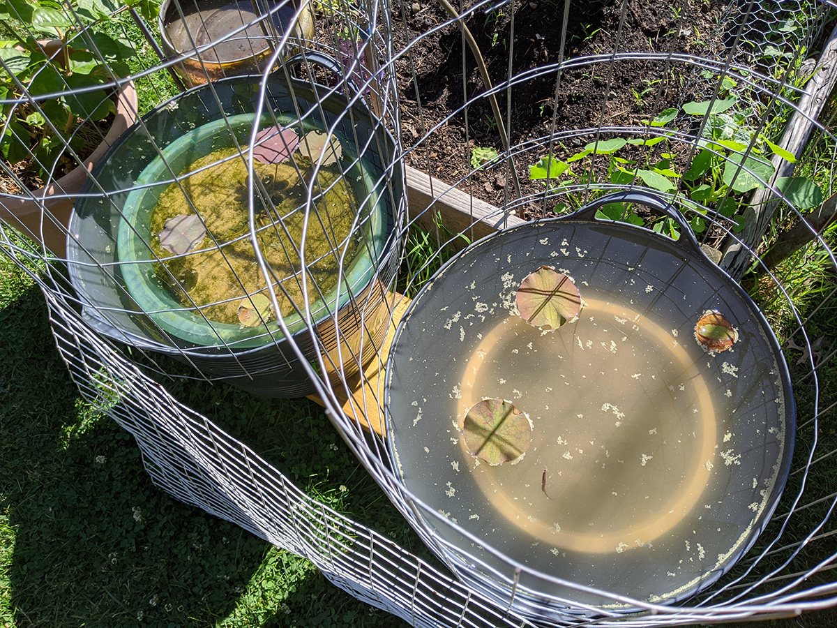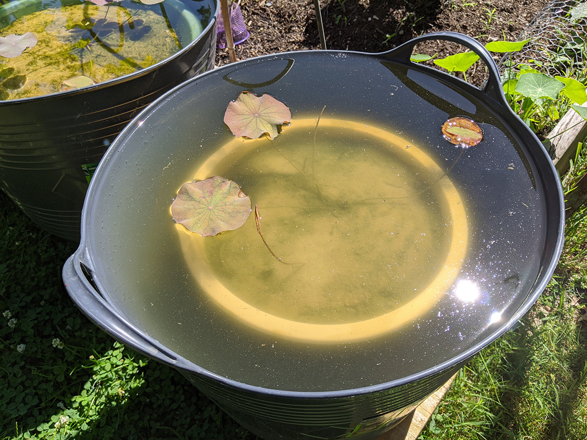 so instead i did some light gardening. primarily emptying out and cleaning one of the rubber lotus barrel (side back) because it seemed to have more algae than the others; i think the reason is because i buried all the leftover lotus roots from last year into this pot, and none of them seemed to have survived, so they all rotted, causing the algae bloom and cloudy water. nothing went to waste though: i dredged out the water and used it to water our garden, then used the water collected in our temporary rain barrel runoff barrels to fill back the lotus barrel.