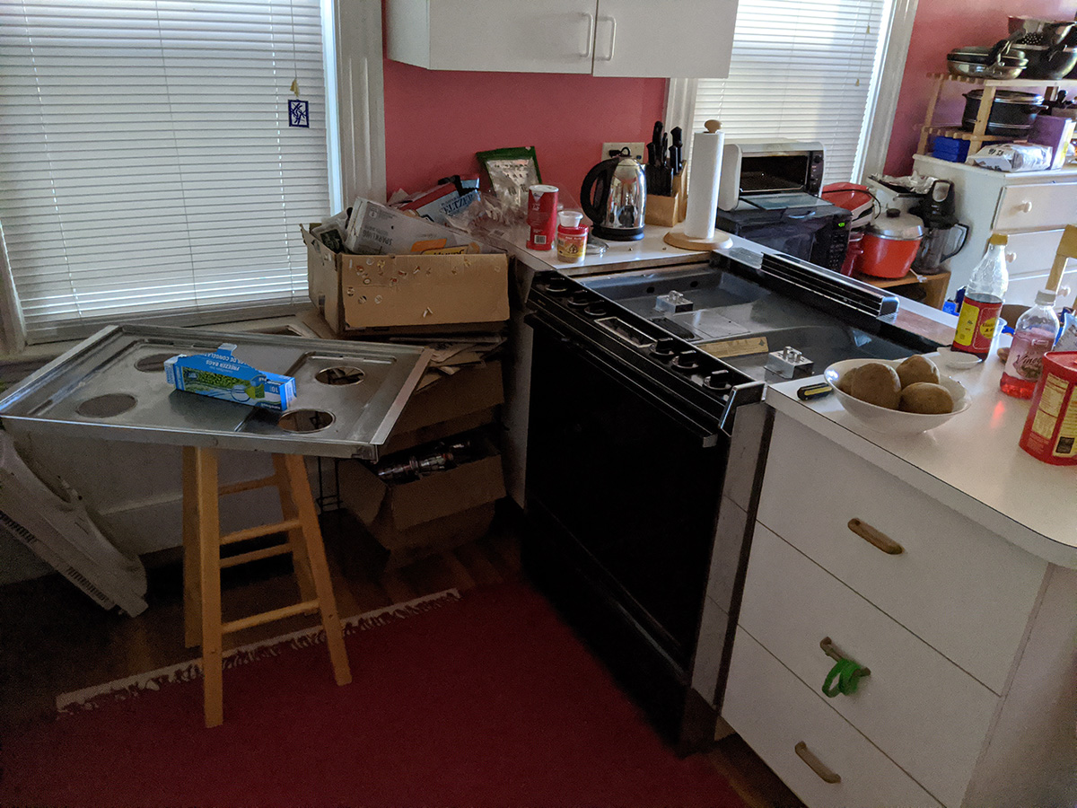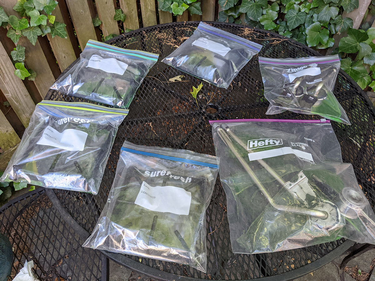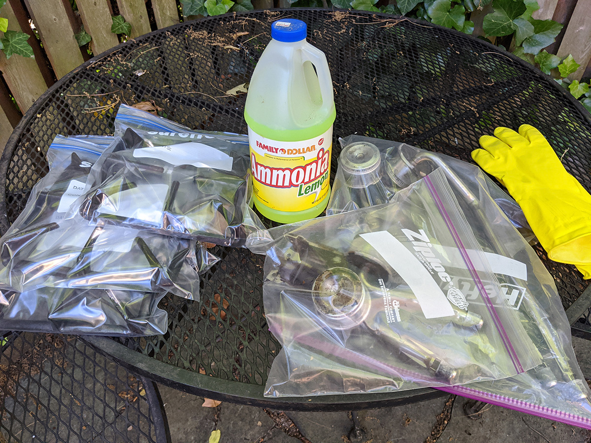 once back at home, i took apart the stove top, removing the grills followed by the burners. each grill fit inside a storage bag just fine, but two of the burners were too long for the 1 gallon bags. luckily i still had some extra large 2.5 gallon ziploc bags. i brought everything outside to fill each bag with 1/2 cup of ammonia (i used a jar which earlier i figured out how much was 1/2 a cup). the grills had already tore tiny holes in the freezer bags, so i ended up having to double bag them with leftover reused ziplocs i happened to have in the house (find gave me a reason to use them and throw them out). i wore my face mask in case of the smell. after everything was bagged, i'll left them outside for a day or two, let the ammonia fumes work, then rinse them off back in the kitchen sink.