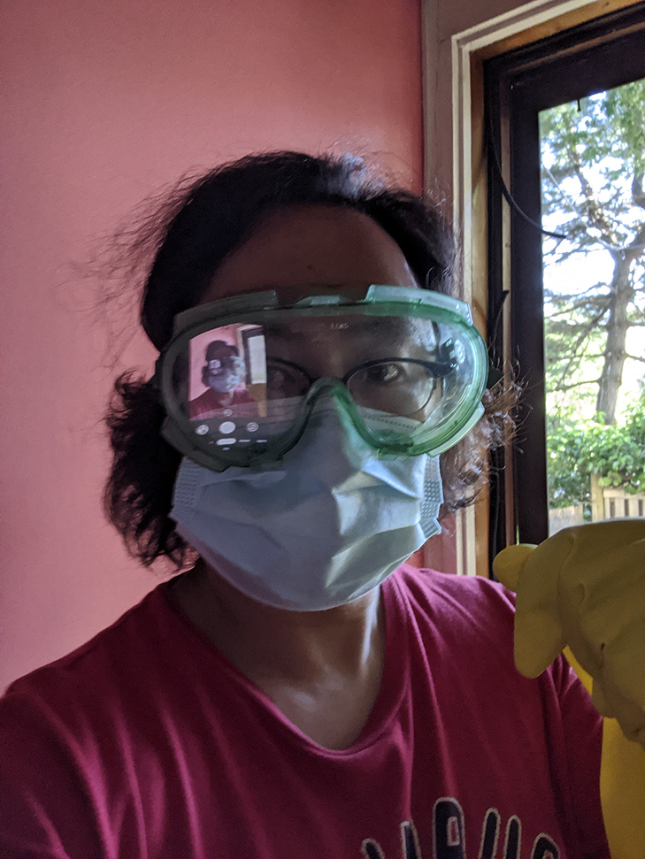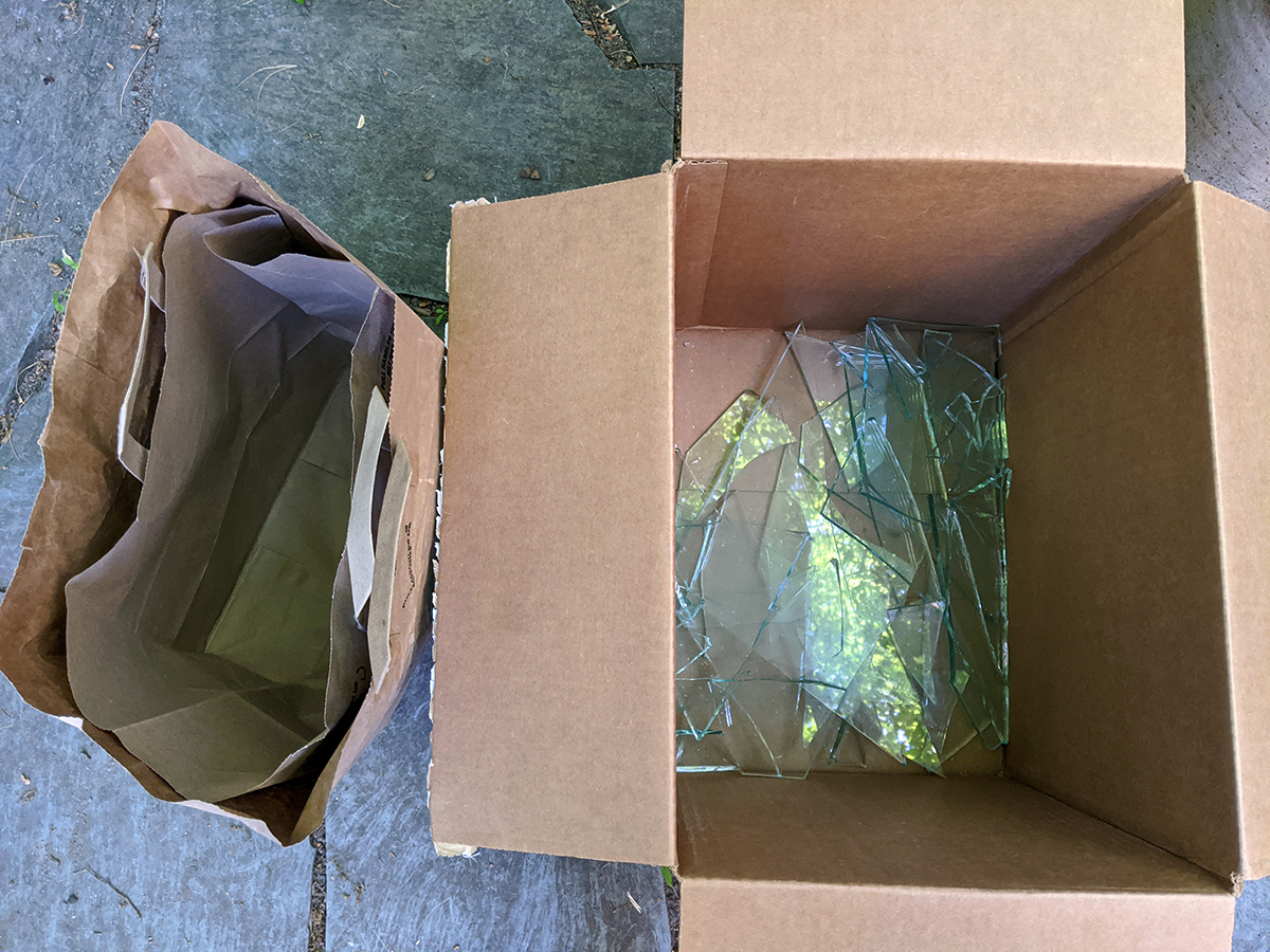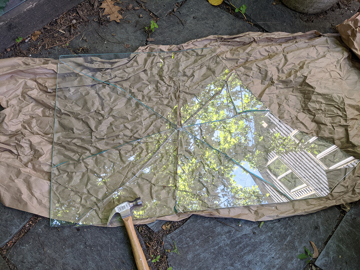 my next housecleaning project was to get rid of the broken tabletop glass. for that i brought out my chemistry goggles from 1992, to keep broken shards of glass from getting into my eyes. i set out some brown packaging paper and put the glass on top of that. with a hammer i gently tapped the center of the glass, increasing the force until the glass cracked in a spiderweb pattern. larger pieces i cracked some more. it wasn't as messy as i thought, though the paper did catch a lot of fine glass particles. wearing the dishwashing gloves from earlier, i started picking up the glass pieces and putting them in a cardboard box. i later transferred them into double-bagged paper bags for easier disposal. the empty box i tossed out as there was glass shards inside. the paper i carefully rolled out and throw out as well.