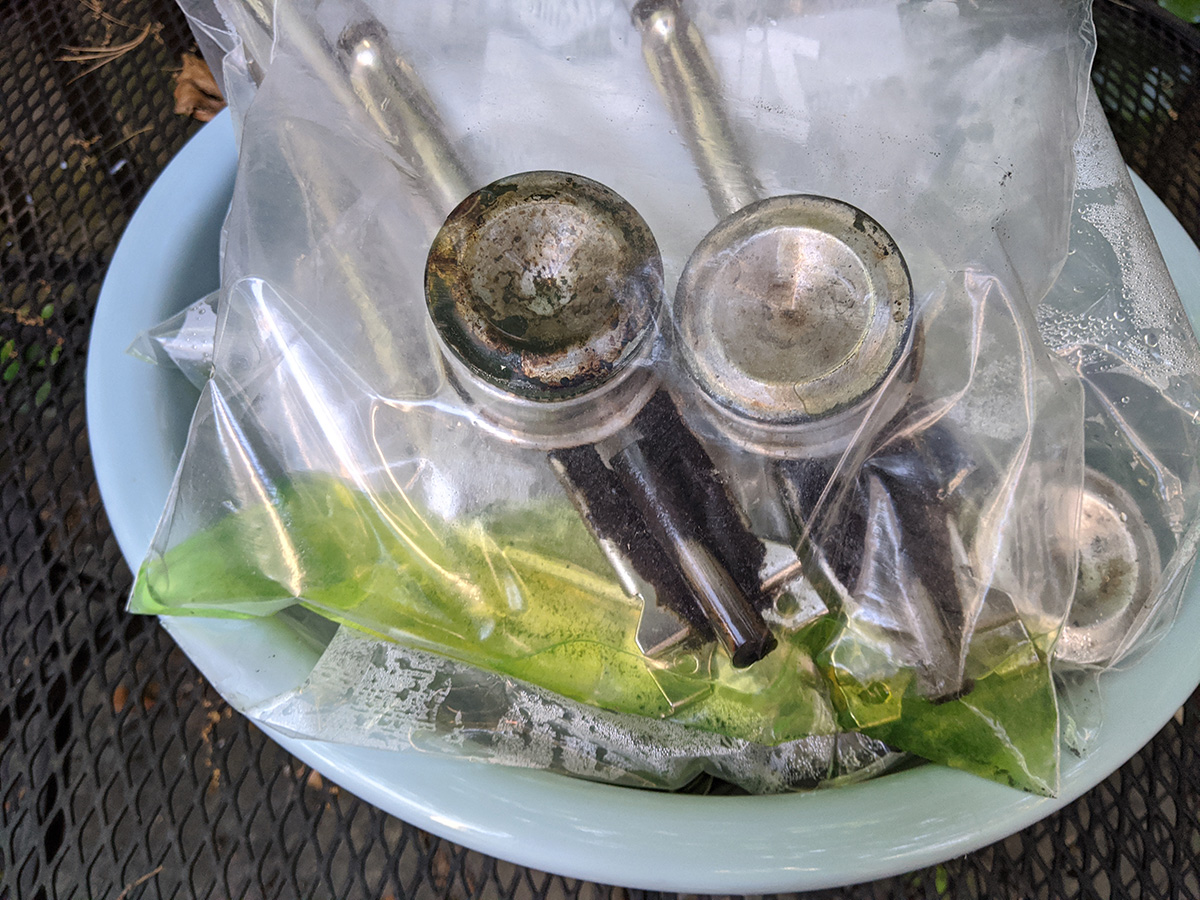 next i put all the stovetop grills and burners that i left soaking in ziploc-sealed ammonia bags into a big plastic bin and brought everything inside. even though some ammonia had turned fluorescent yellow-green to dark brown, everything still looked awfully dirty, no improvement. it was smart to double bag them as all the grills in dollar store storage bags had leaked into the outer bags. i opened up the burners first into the sink, dumping out the ammonia, occasionally getting a strong whiff. with a used dish sponge i scrubbed the burners. to my surprise, the black grease stains came off. a little more elbow grease and i managed to remove most of the stain. whatever that didn't come off i used a brillo pad to scrub it off.