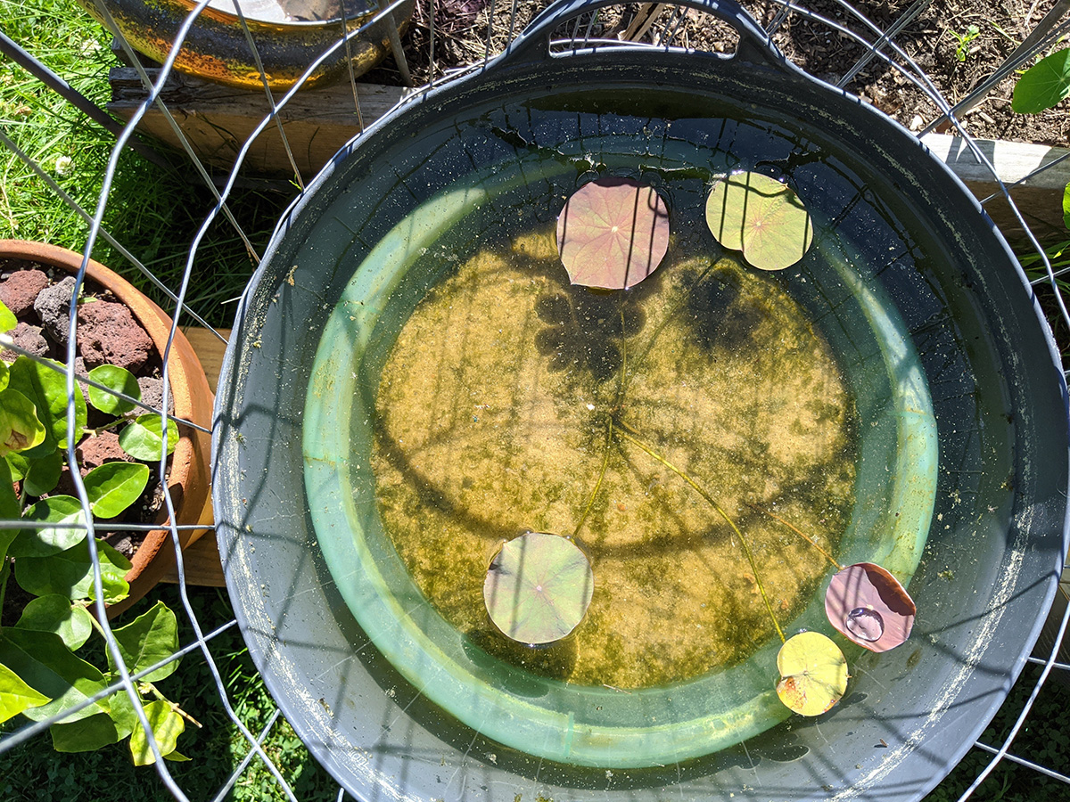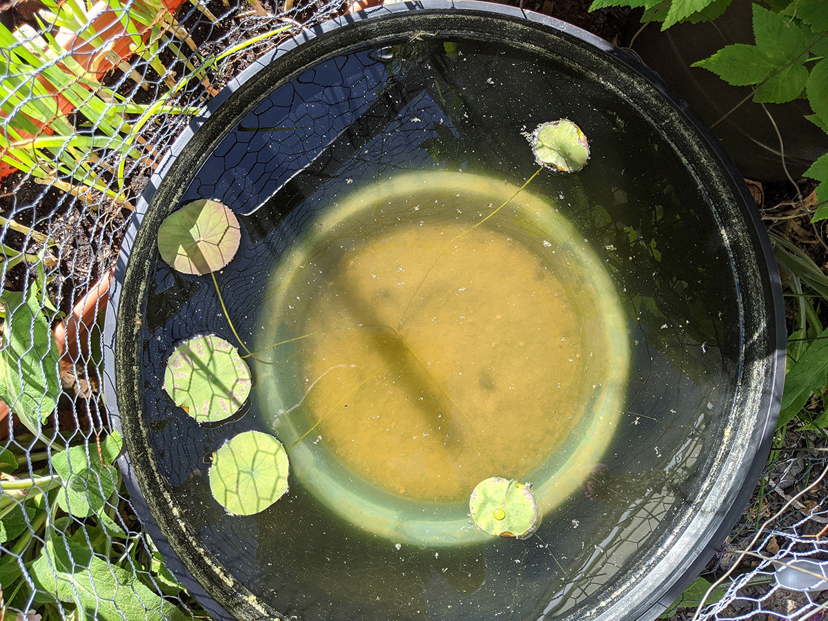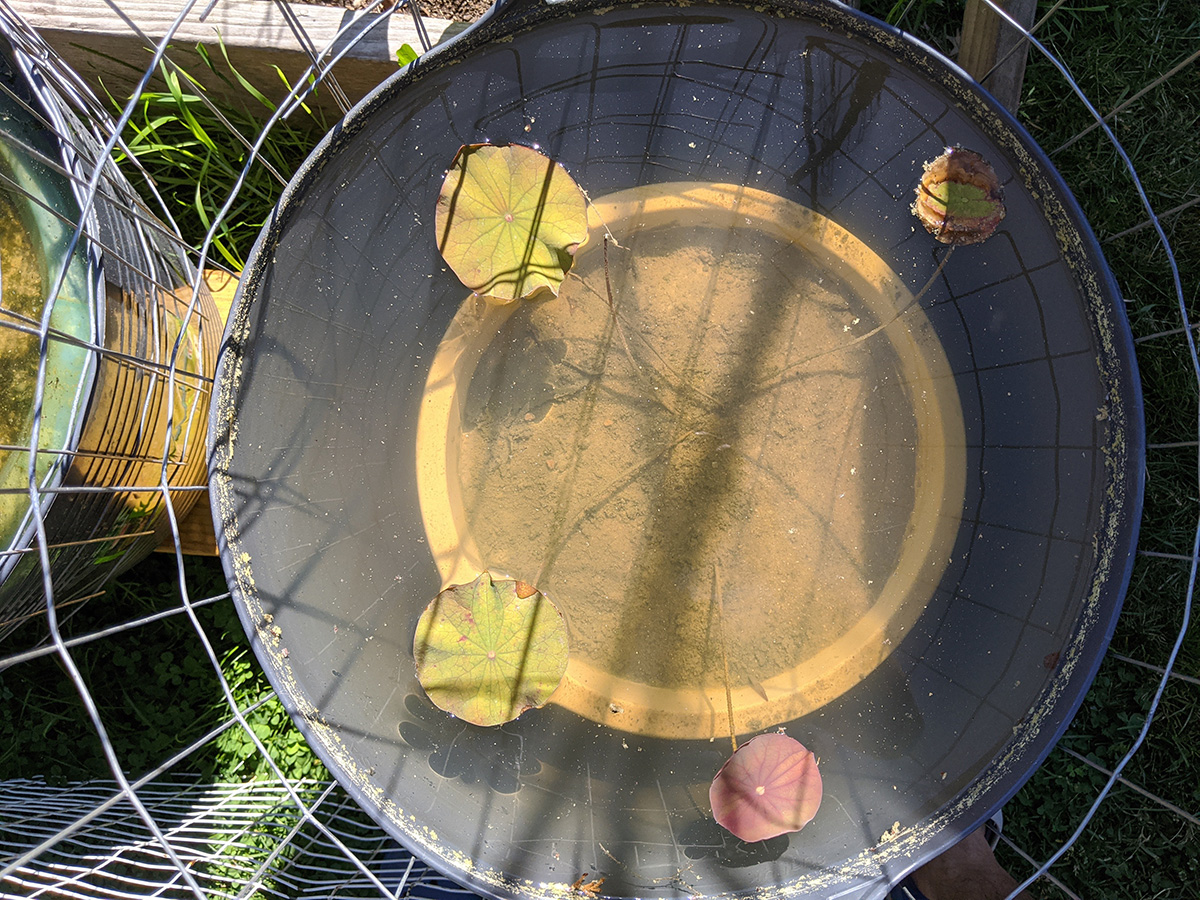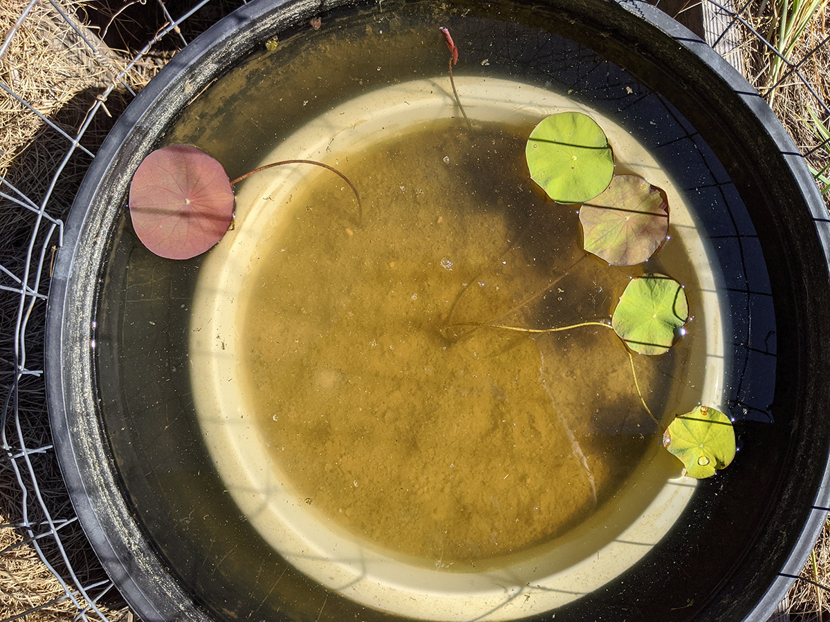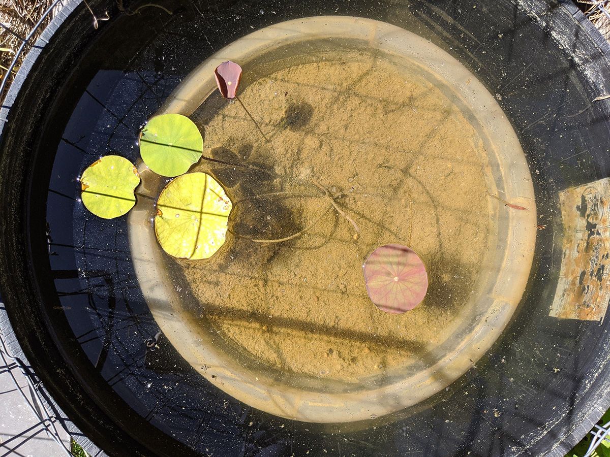 the more advanced lotus plants are already working on their 6th leaf. starting with the 5th leaf, the stem has moved a few inches away from where the seed was initially planted. subsequent leaves seem to be emerging randomly throughout the pot. the water is very warm, which is ideal for lotuses. because it doesn't get replenished, the still water can get a little murky. before the next rain storm, i want to clean the barrels again and do a water change. it's purely cosmetic, lotuses grow in the mud so they used to murky waters.