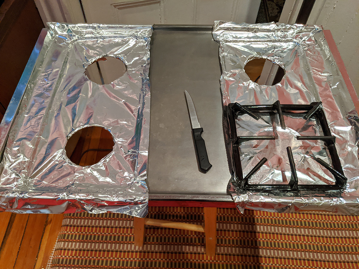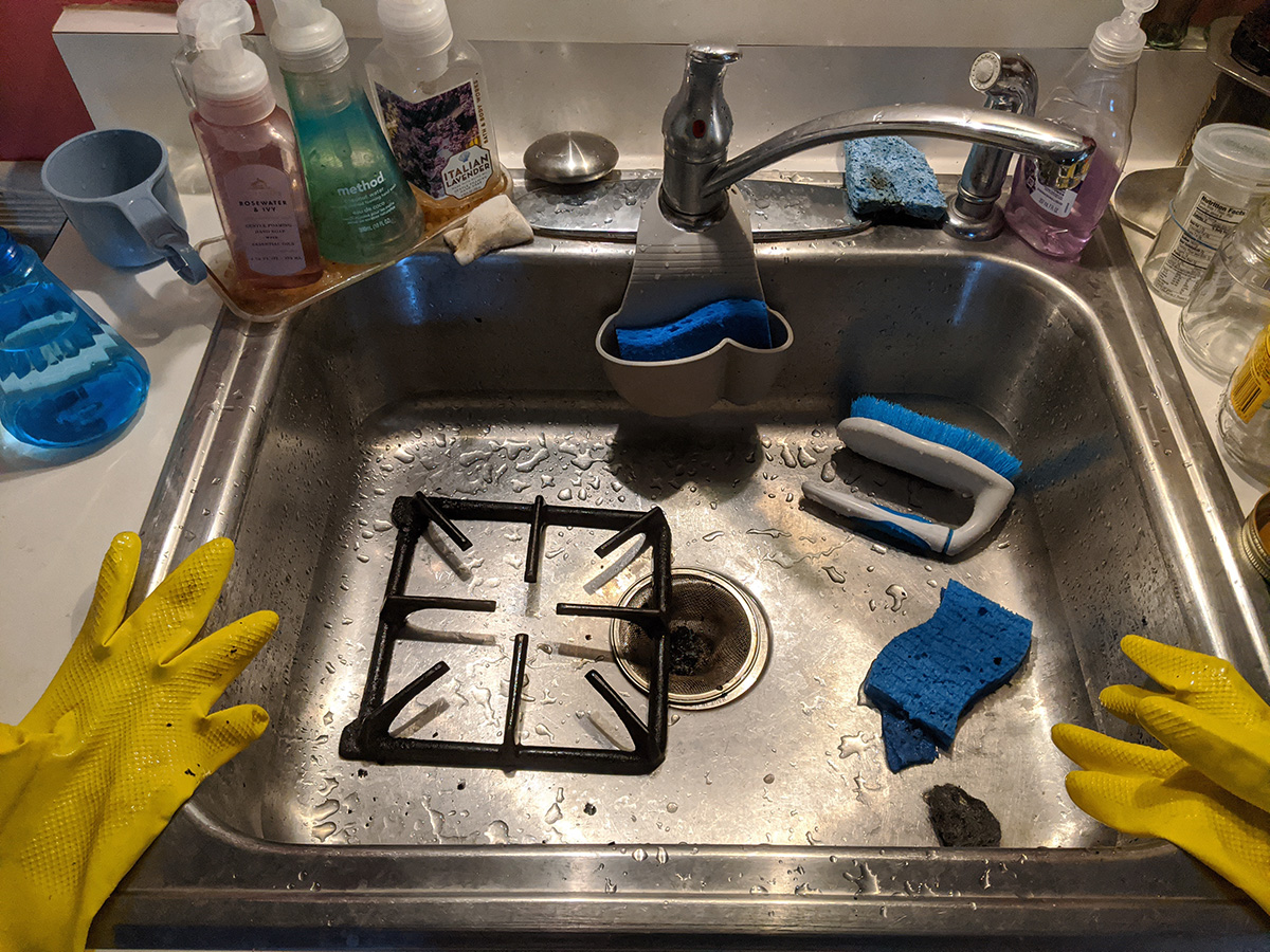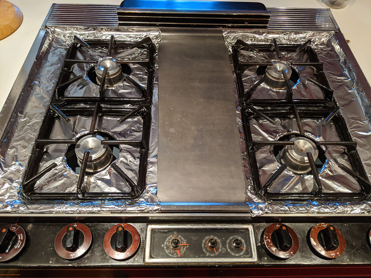 while the grills were left to dry, i cleaned the stainless steel stove surface and covered the burner areas with heavy duty aluminum foil. 6 months of kevin has taken a toll on my stovetop. despite warning him multiple times, he seems incapable of cooking without having everything spill over onto the grills and burners. i also realized something else: he took all my scotch-brite non-scratch sponges! i knew i had at least 2 under the sink, he took those. they're just sponges, but it's a dick move nevertheless. not only does he use up all my sponges while he was here (he goes through a sponge every 3 weeks while i can use one for months), he has the nerve to take the rest with him when he moved out. let's just say i won't be doing him any favors in the foreseeable future.