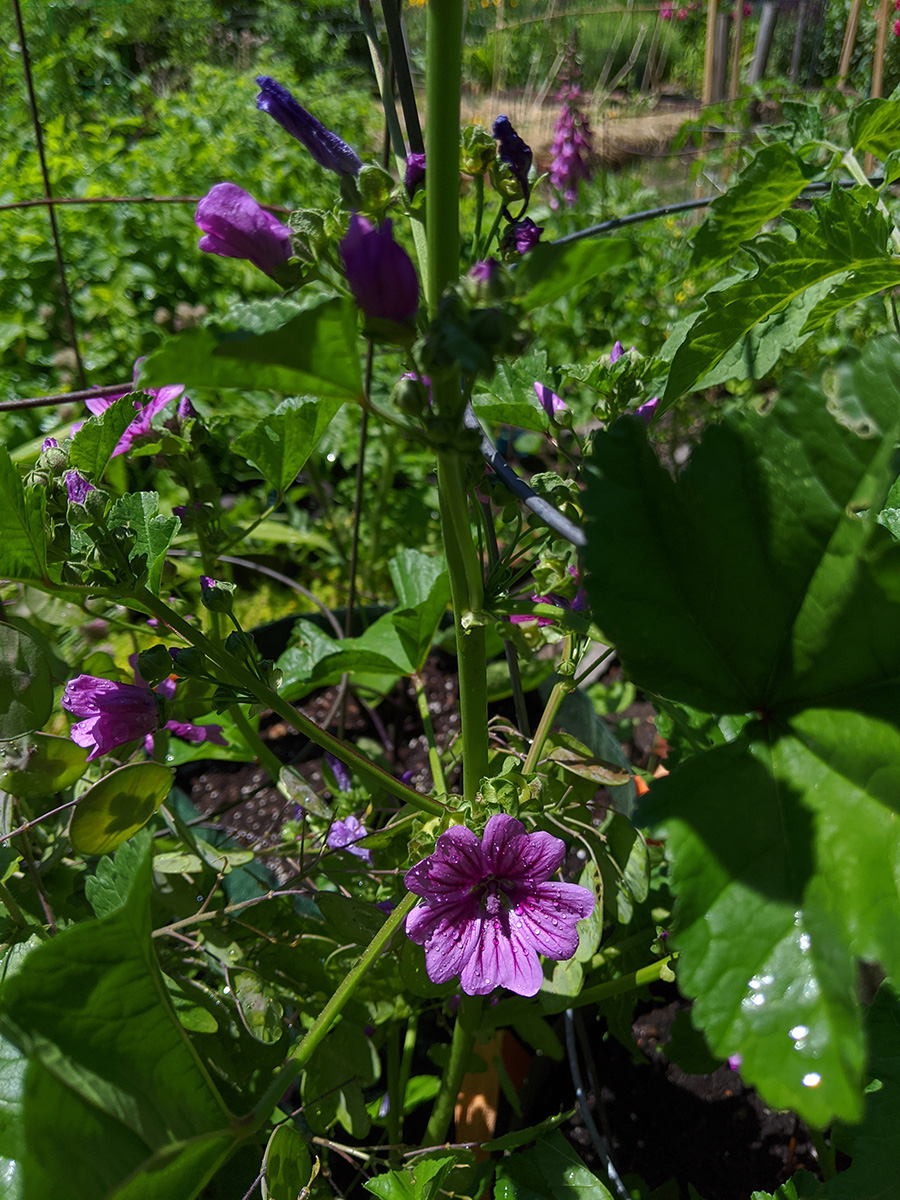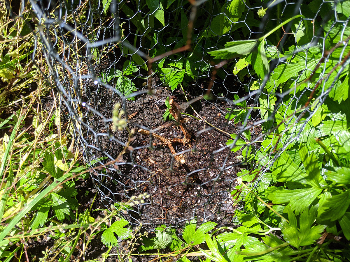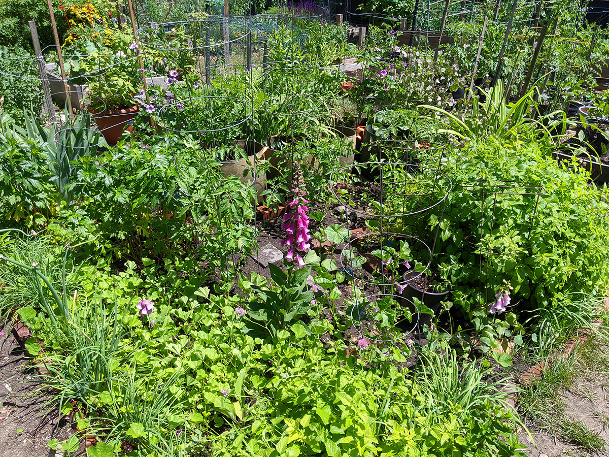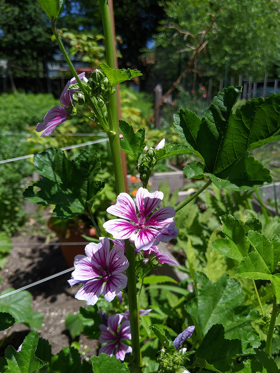 went down to the community garden to water my plants. my northeastern corner hydrangea has been completely defoliated despite the chickenwire fence. whatever was eating the leaves apparently wasn't rabbits but rather snails and slugs. this is one battle i'm not going to win. i'll leave the hydrangea there for the time being, maybe put a clear top container over it for more protection. what i really want to do is cut down all the lemon balm growing in my plot. i didn't plant it, i really don't have any good use for it, and it grows like a weed, taking up prime garden real estate. i just need to think what i want to plant in its place.