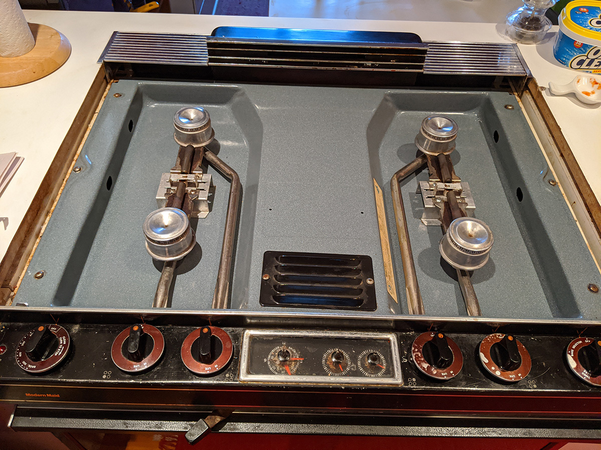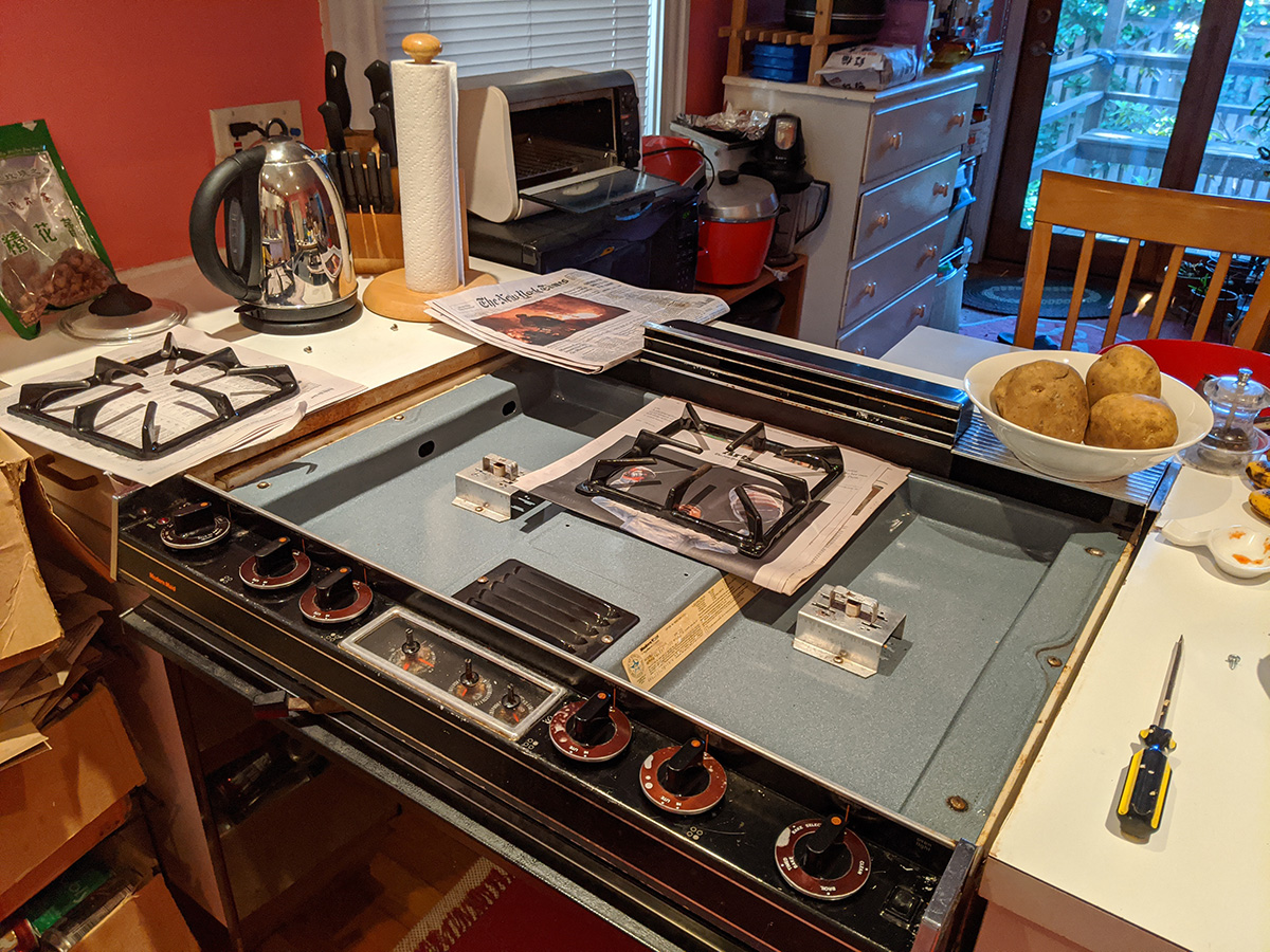 i finally reassembled my stove, it felt like a new appliance. i tried the burners but only one of them worked, which is normal, they normally don't go back to normal until they're completely dry. now all i have to do is get some new pots and pans to replaced the ones past roommates have all scratched up.