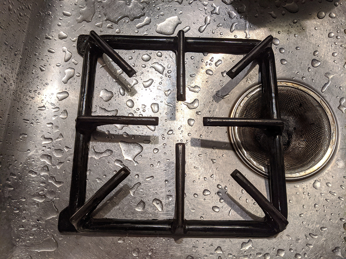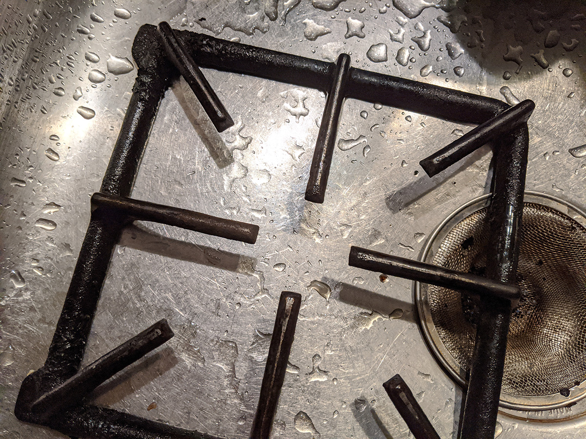 then came the grills. i knew there were layers of caked up oil on the corners, but what i didn't realize was just how grease coated they were. a scrub off the sponge was all it took to revert them to like new conditions against. most of the corner caked oil came off, but the more stubborn deposits i used a steak knife to gently chip off before cleaning it off with the sponge. later i started using a stronger scouring sponge (the green type that's not supposed to be used on non-stick pans), which reminded some of the stubborn grease spots even better.