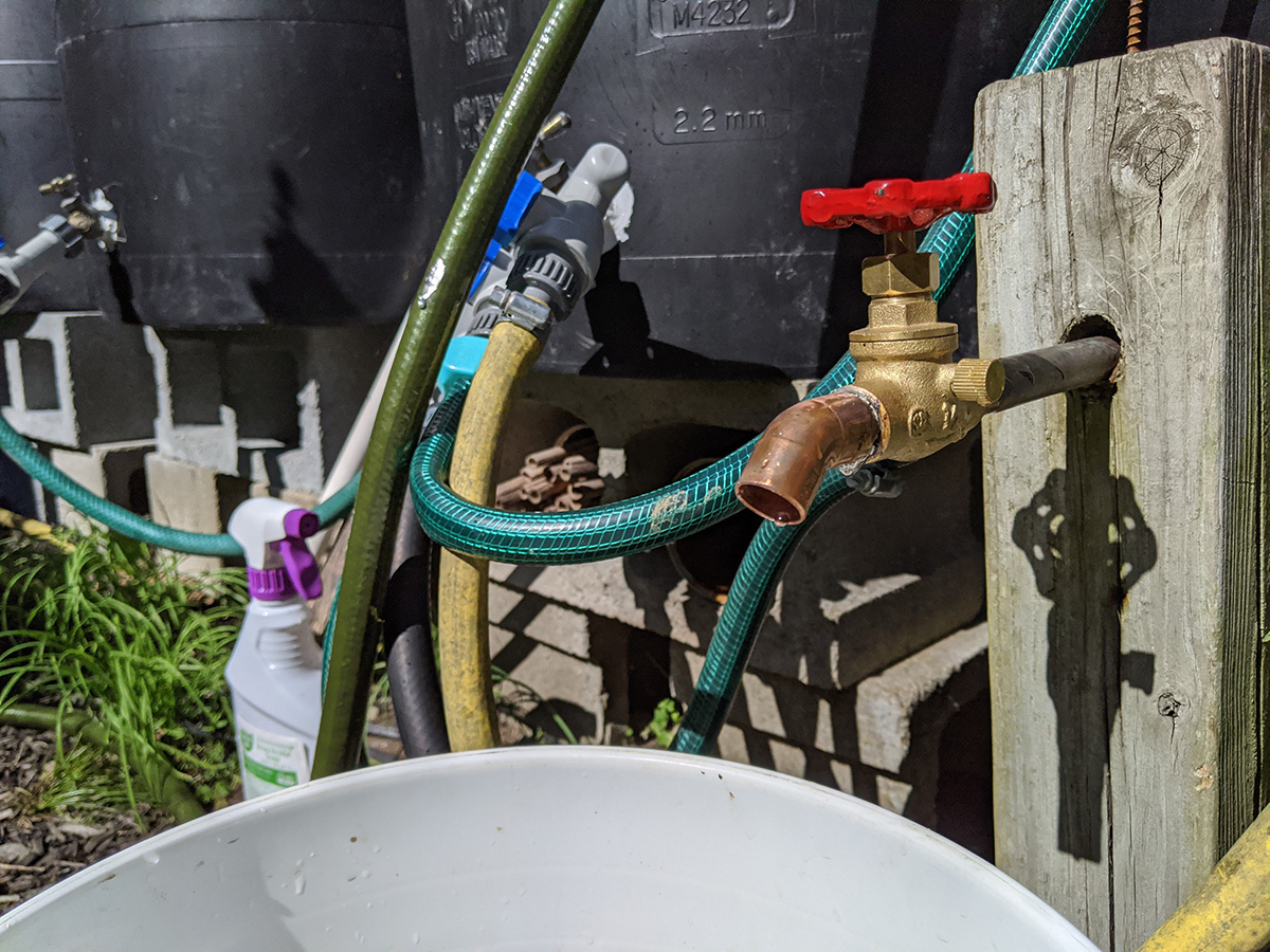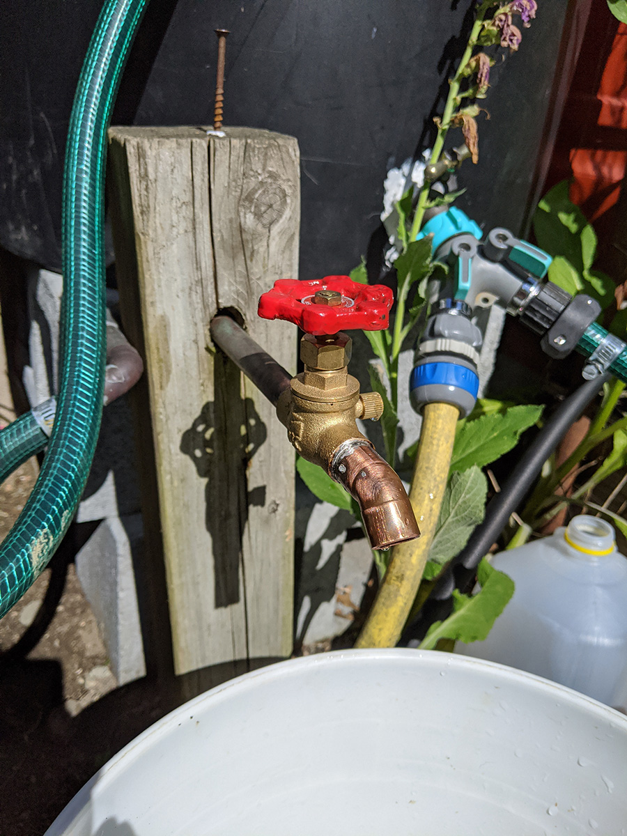 i also saw the new outdoor rain barrel spigot he soldered into place. he took a spare brass shutoff valve, soldered to the preexisting outdoor piping, and attached a bend piece of copper on the other end to form the spigot.